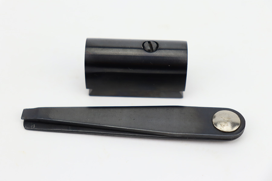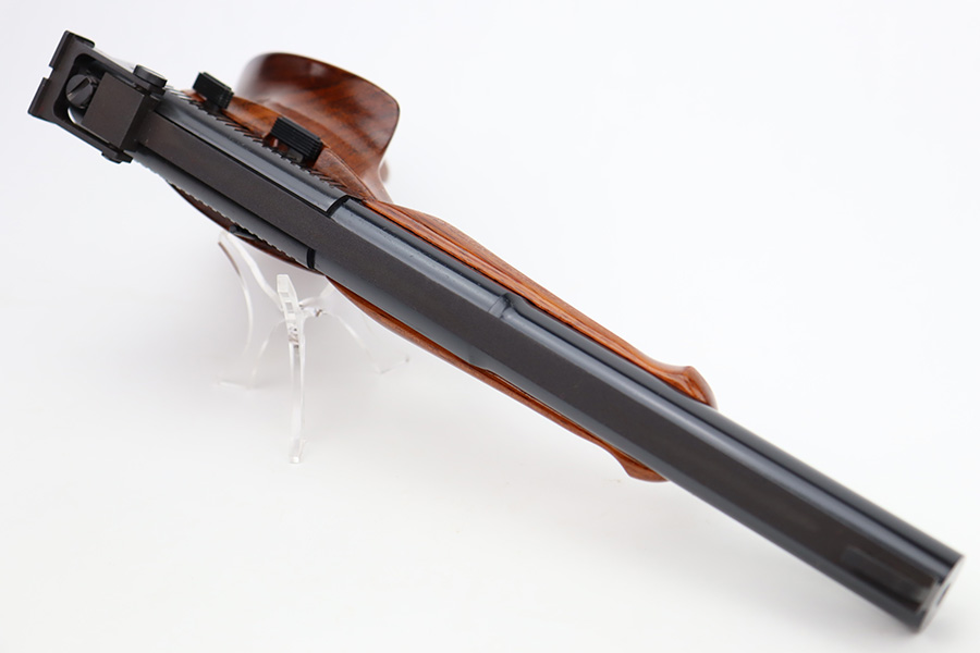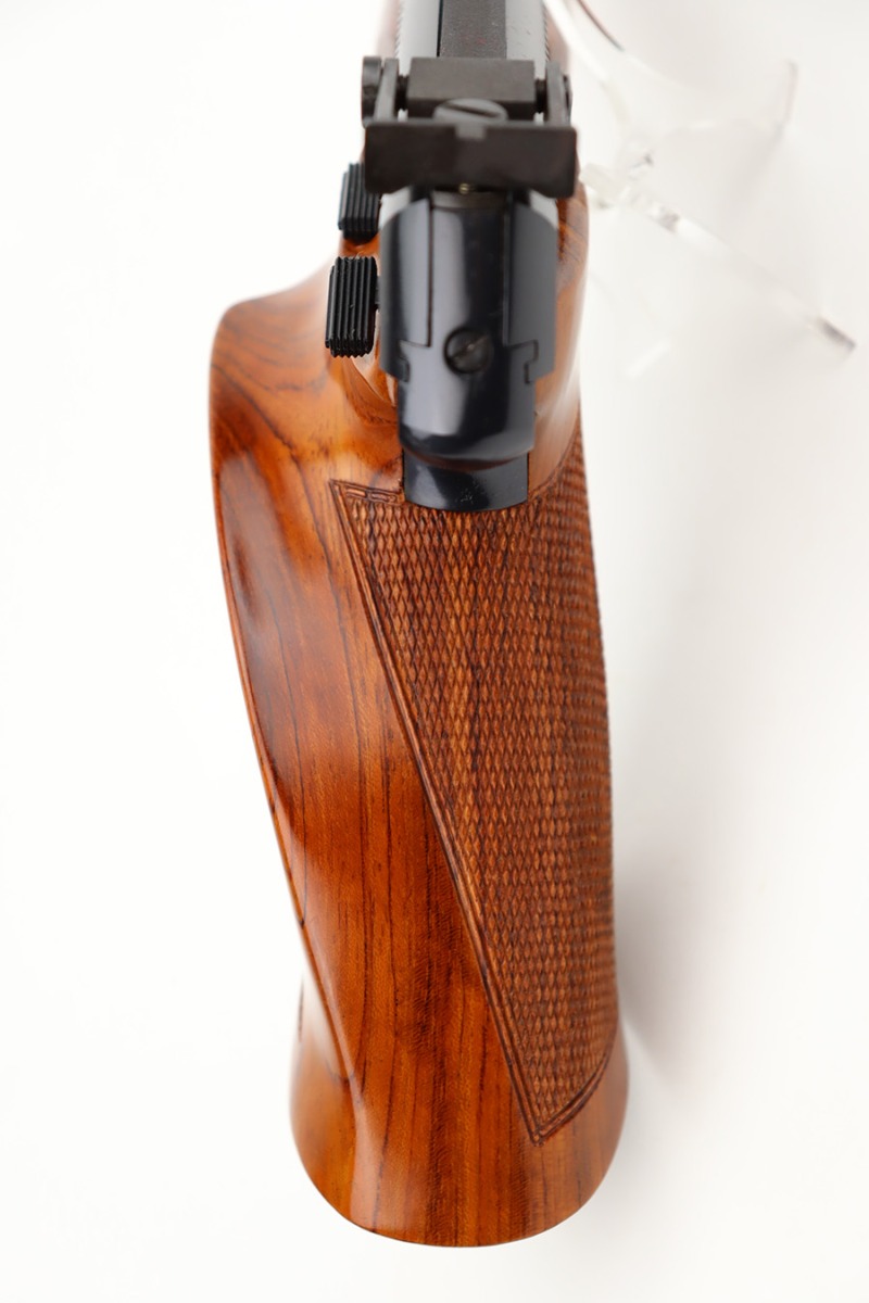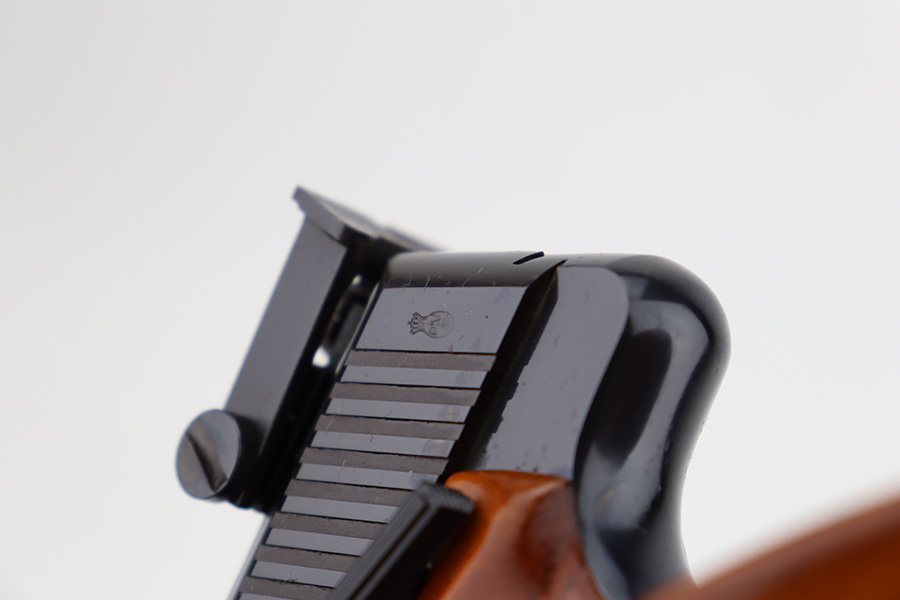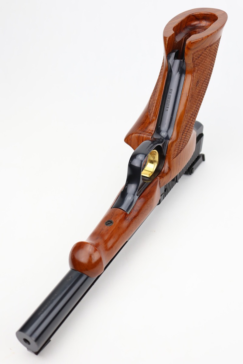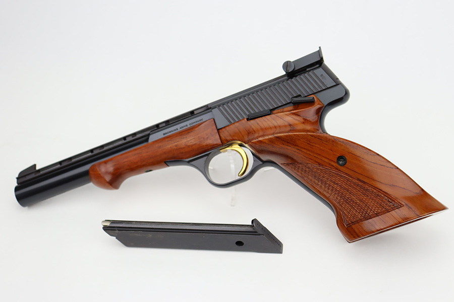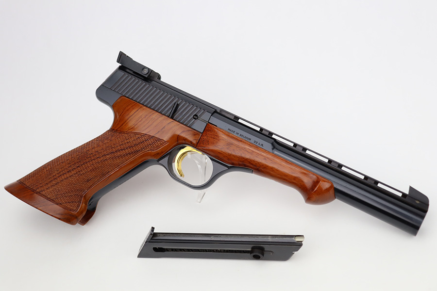 12/11/23 – This is a beautiful example of a Browning Medalist pistol, manufactured in 1968 and chambered in .22 LR. It comes with a red velvet-lined presentation case, several barrel weights, a multitool, and one magazine. The gun is in like-new condition with no signs of wear or use. Fitted with excellent checkered wood competition-style grips. Stone-mint bore.