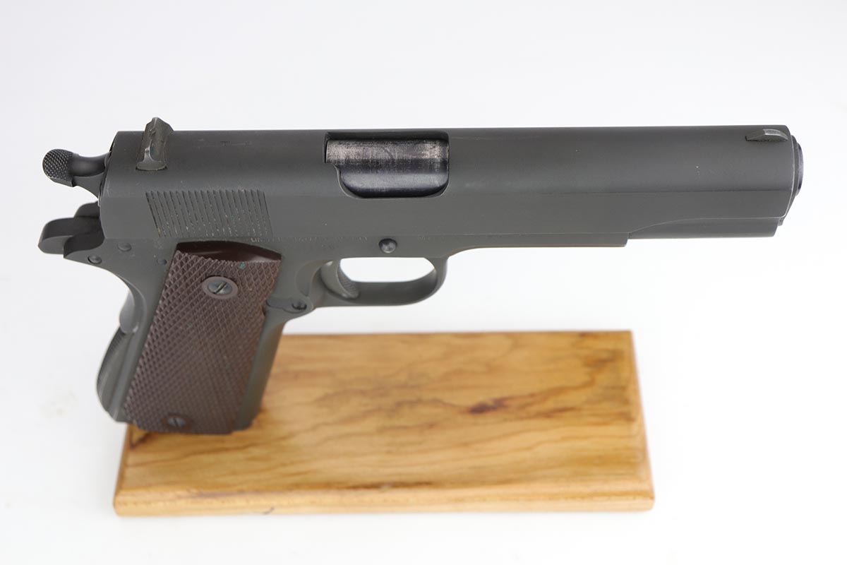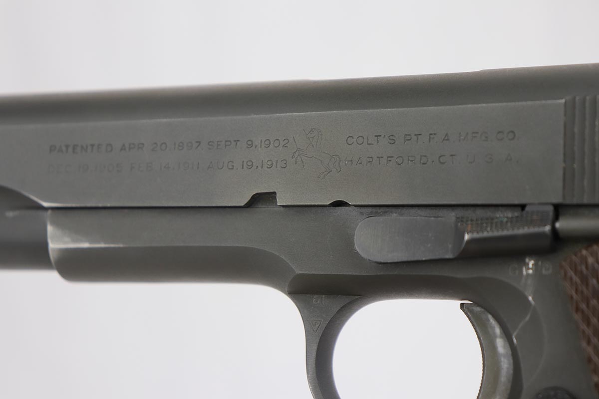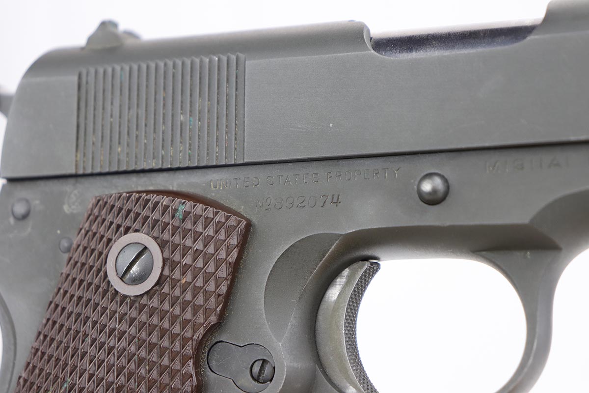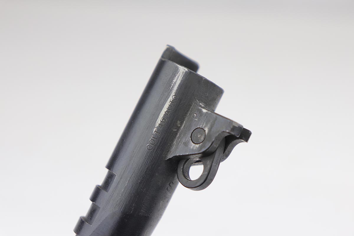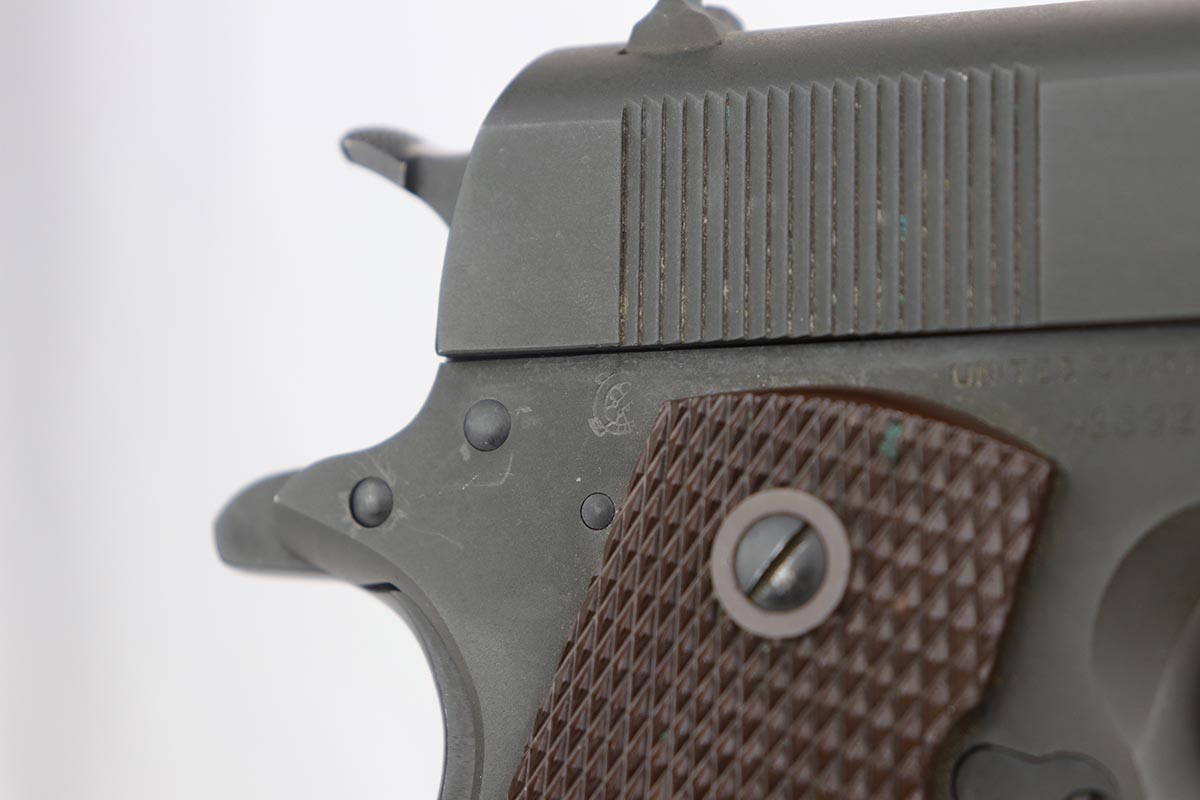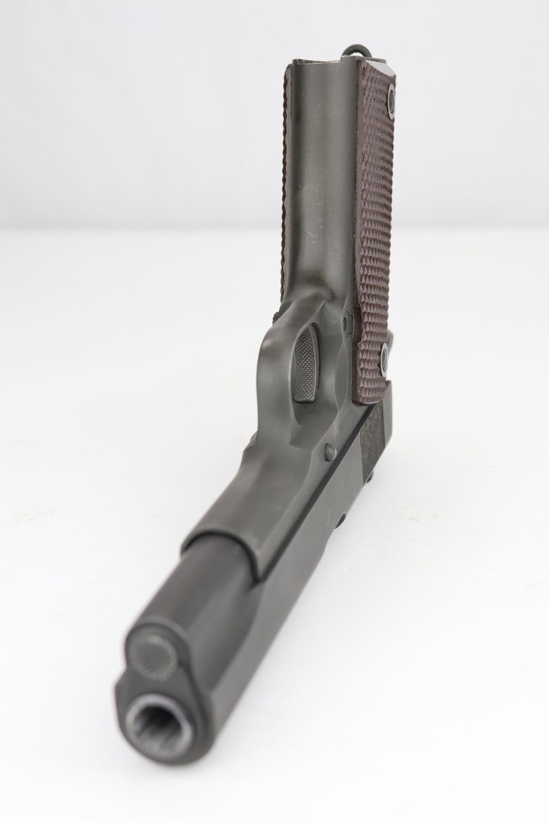 9/20/19 – This is a near-mint Colt M1911A1 from 1943, with about 98% of the original parkerized finish remaining. There’s minor finish loss on the edges of the underside of the frame, but is in nearly unissued condition otherwise. GHD inspector mark on frame with P proof on slide and frame. Scarce Colt barrel with ‘S’ under the lug, which is correct for this serial number. Excellent grips. ‘L’ marked magazine. Bore has good rifling but some frost and needs a more thorough cleaning.