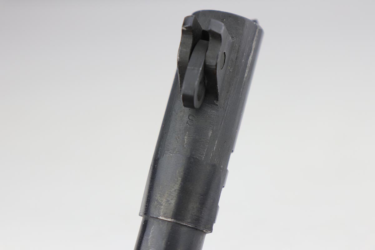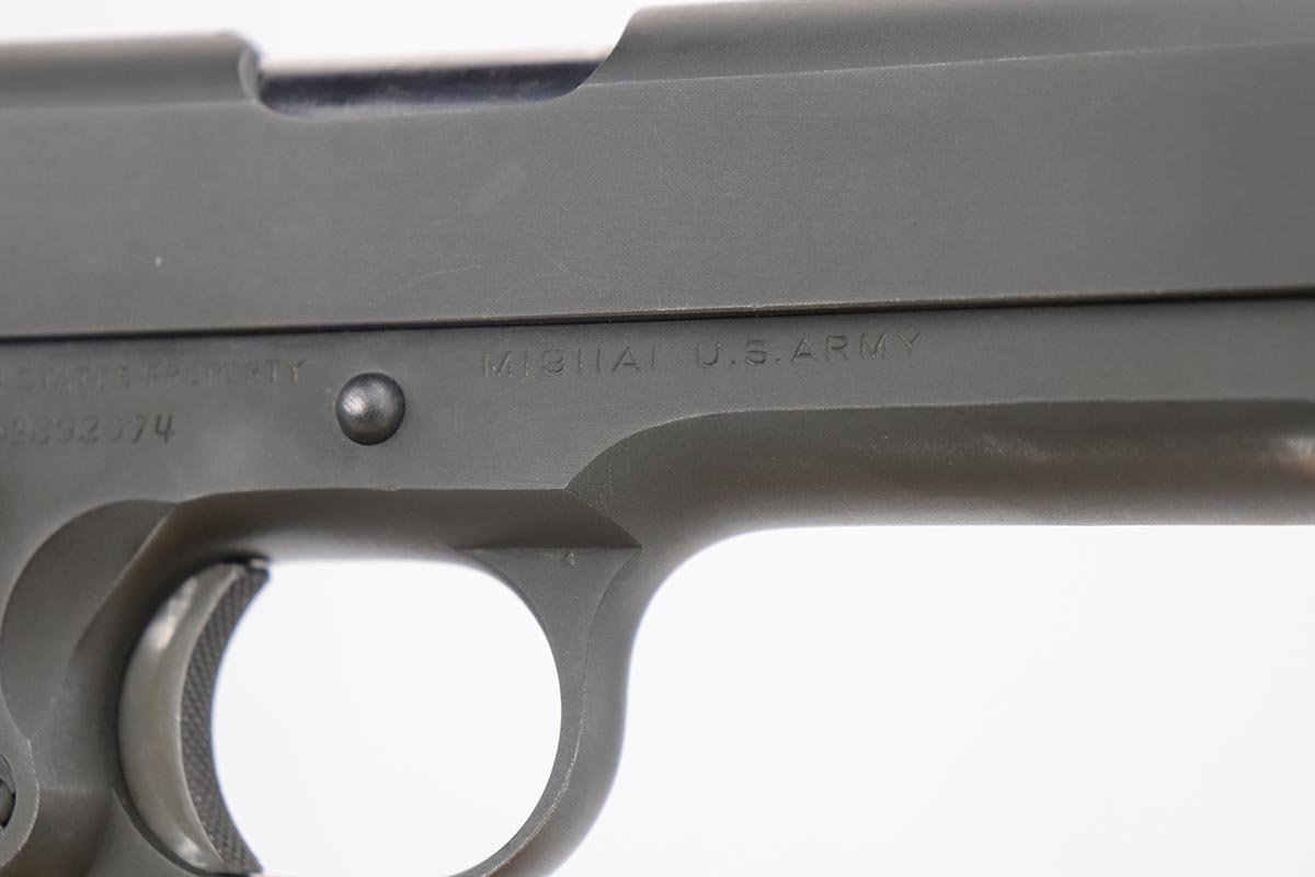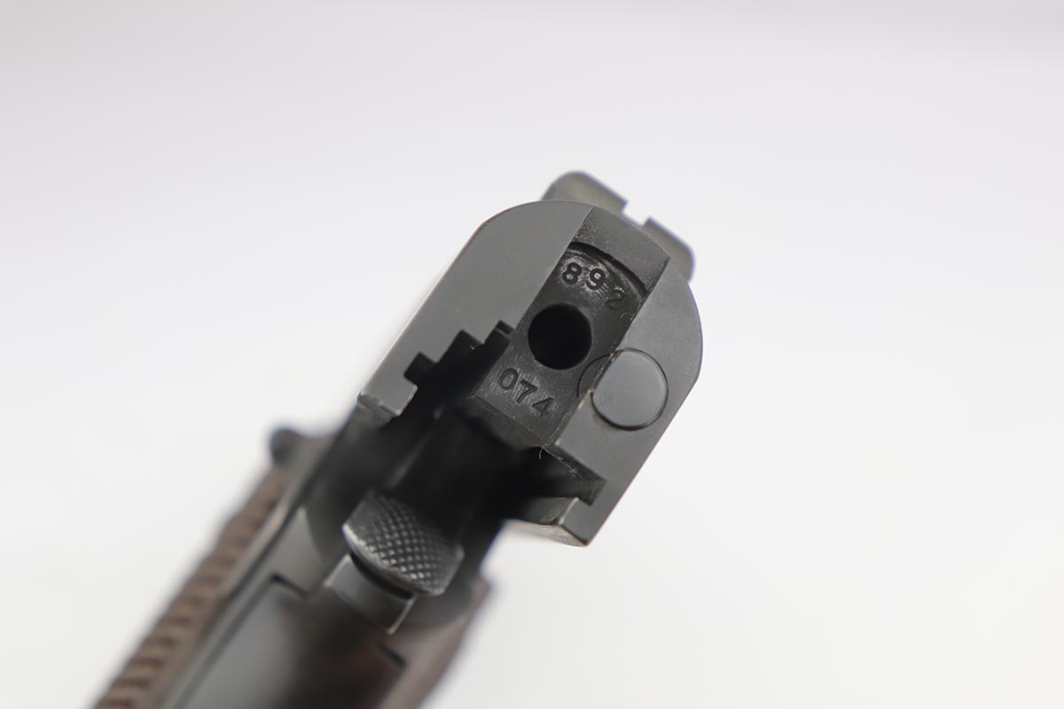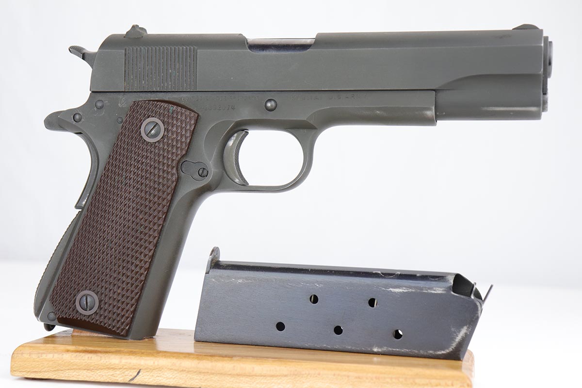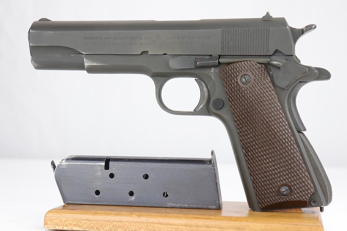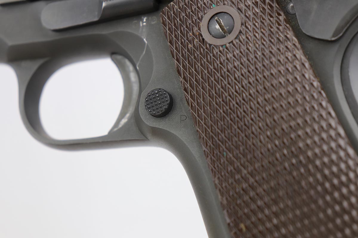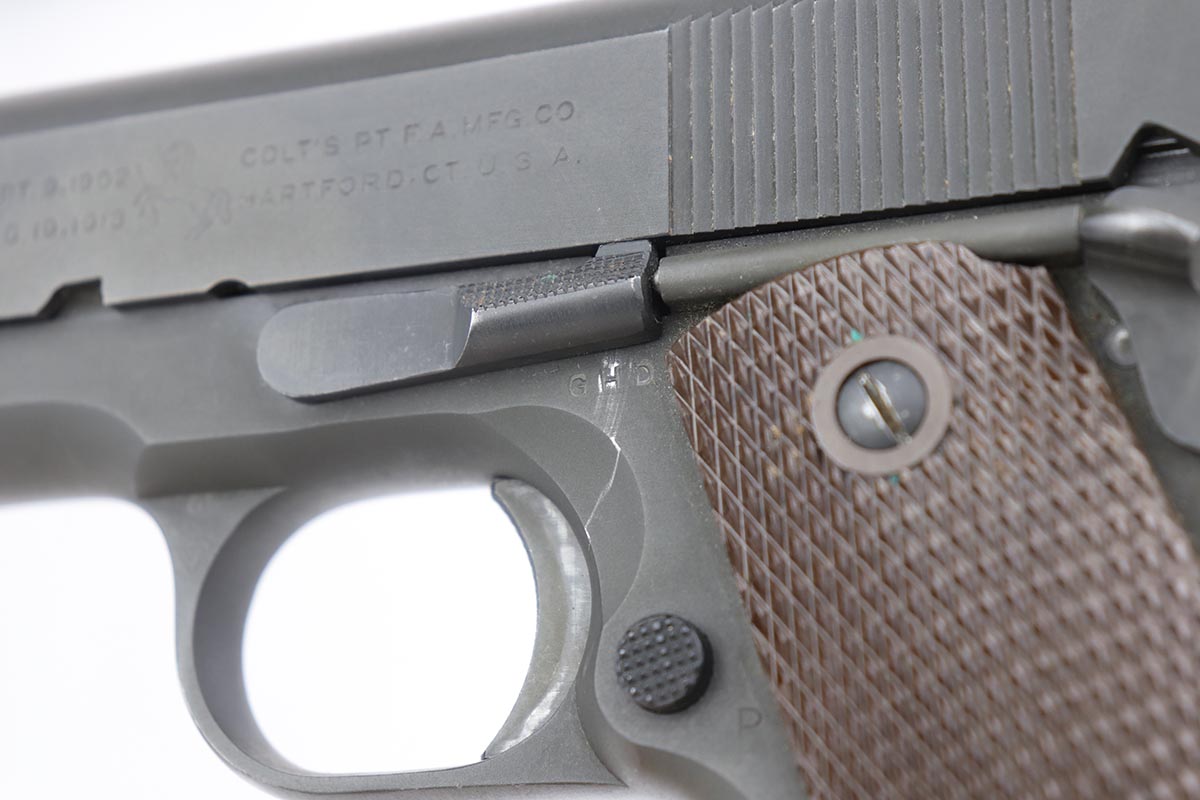 9/20/19 – This is a near-mint Colt M1911A1 from 1943, with about 98% of the original parkerized finish remaining. There’s minor finish loss on the edges of the underside of the frame, but is in nearly unissued condition otherwise. GHD inspector mark on frame with P proof on slide and frame. Scarce Colt barrel with ‘S’ under the lug, which is correct for this serial number. Excellent grips. ‘L’ marked magazine. Bore has good rifling but some frost and needs a more thorough cleaning.