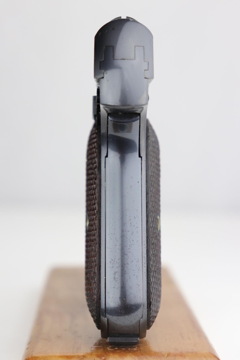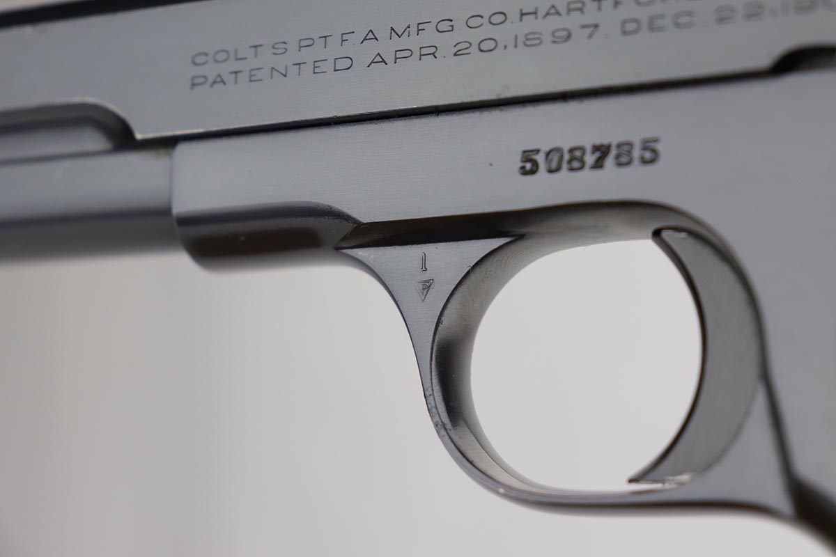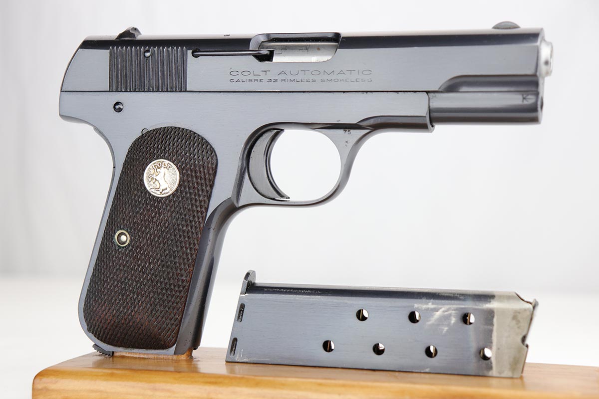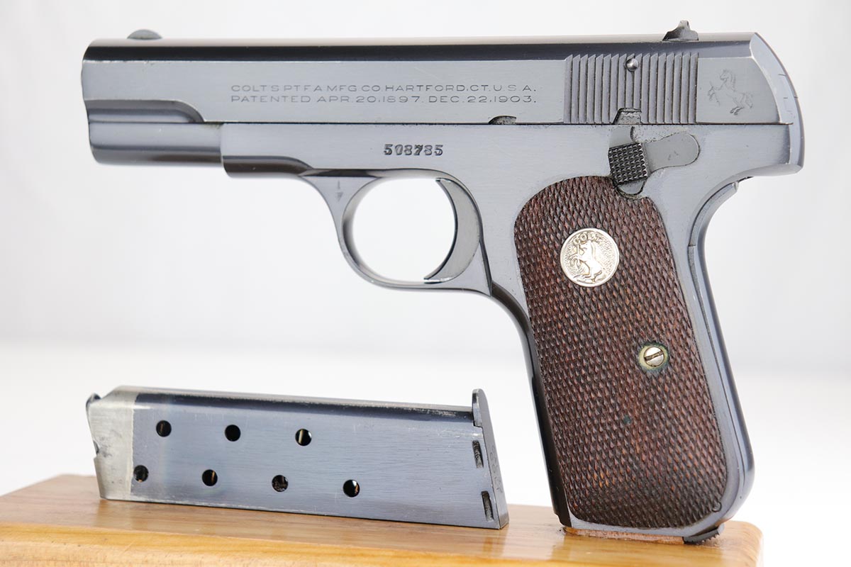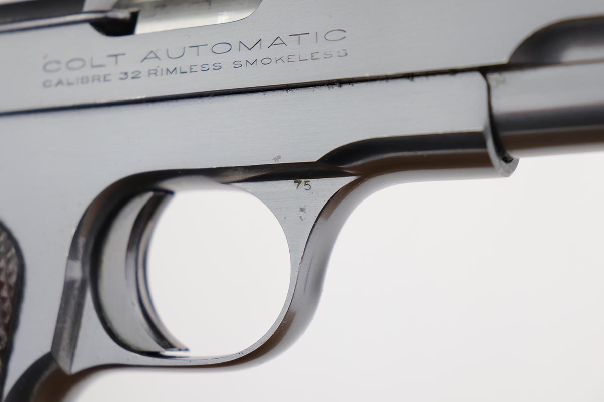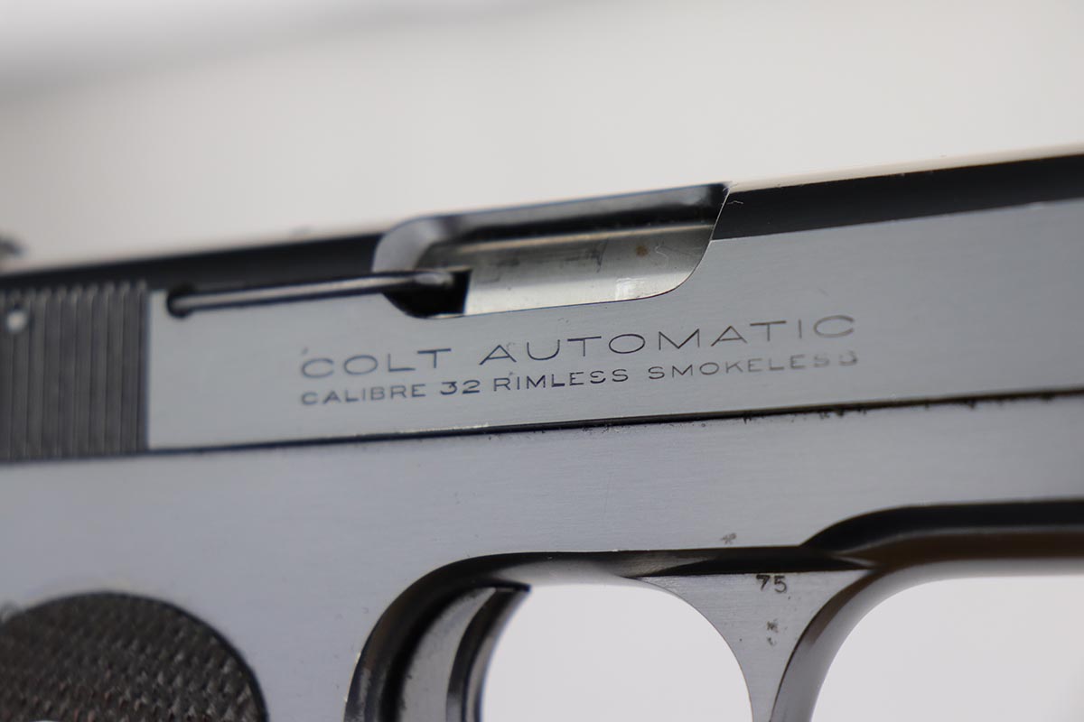 12/3/19 – This is a beautiful Colt M1903 that was manufactured in 1931 and is in near-mint, original condition. It has 98-99% of the high-polished Colt bluing remaining, with just a hint of high edge wear on the slight, and very minor oxidation on the grip safety. Mint bore and excellent grips with just a bit of handling wear. Two-tone magazine with “CAL .32 COLT” marked on the base.