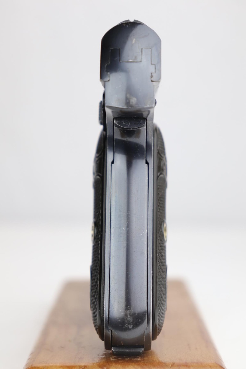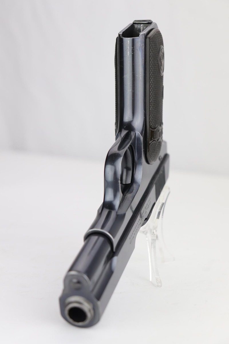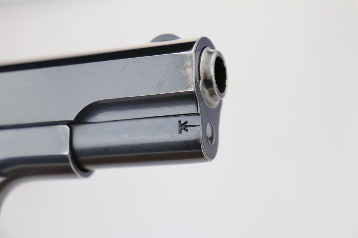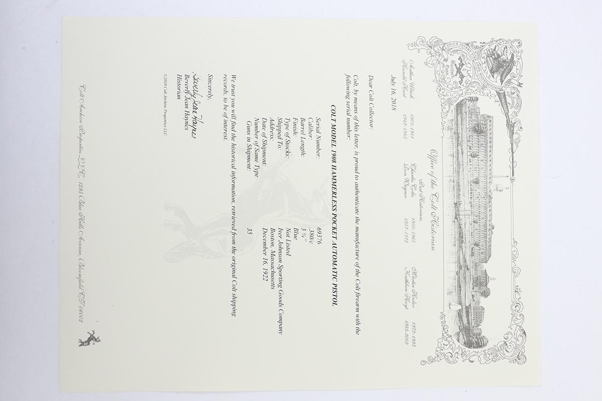 11/6/19 – This is a beautiful Colt M1908 with factory letter from the Colt archives. The letter states the pistol was shipped in December of 1922, and interestingly enough was sent to the Iver Johnson Sporting Goods Company. It has about 97% of that iconic Colt blue remaining, with minor finish loss on the straps, and a couple of thin scuffs on either side of the slide. Terrific bore and grips. Original magazine.