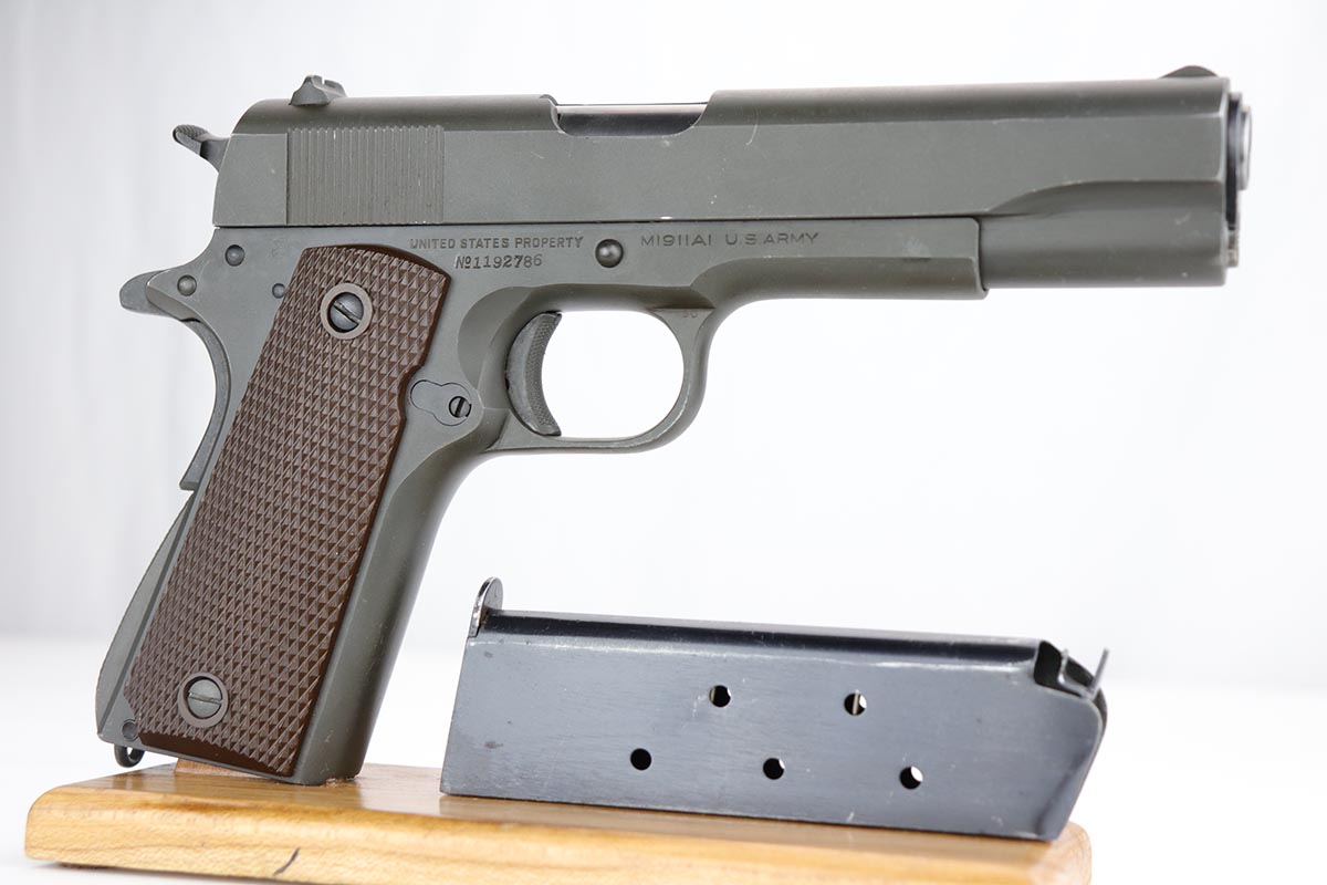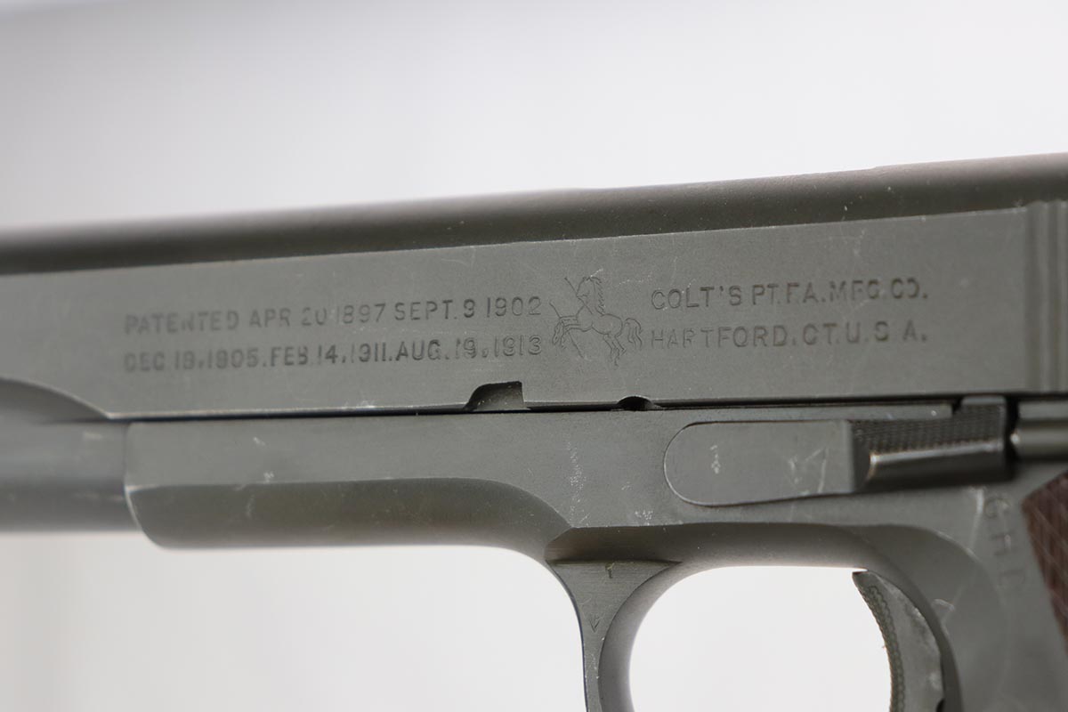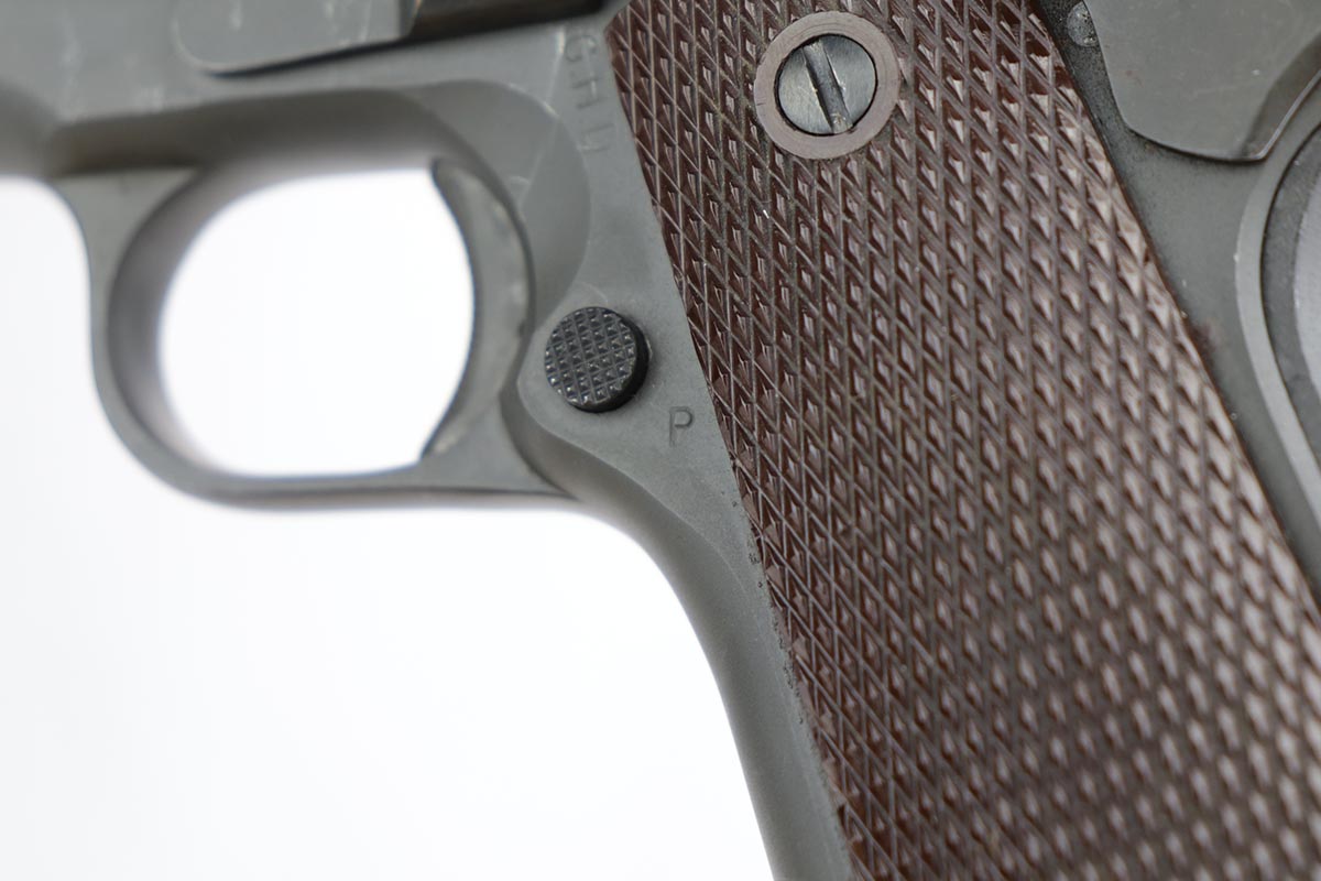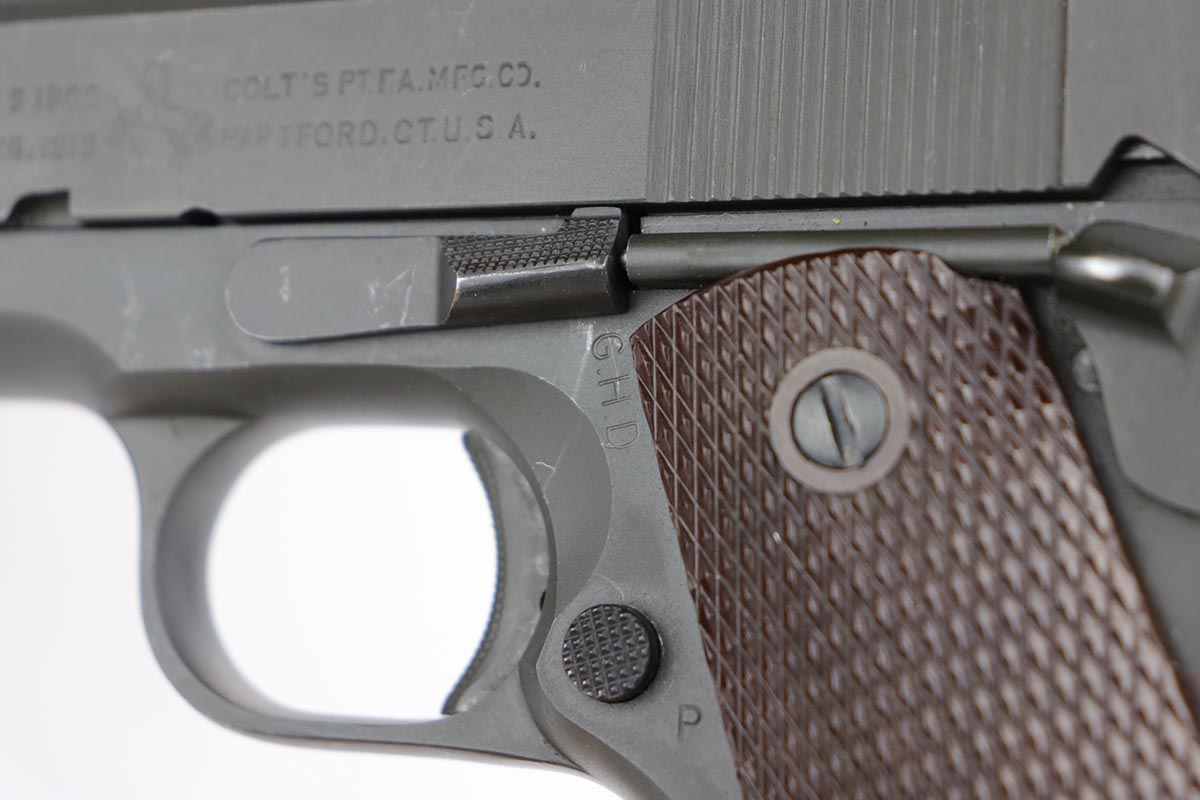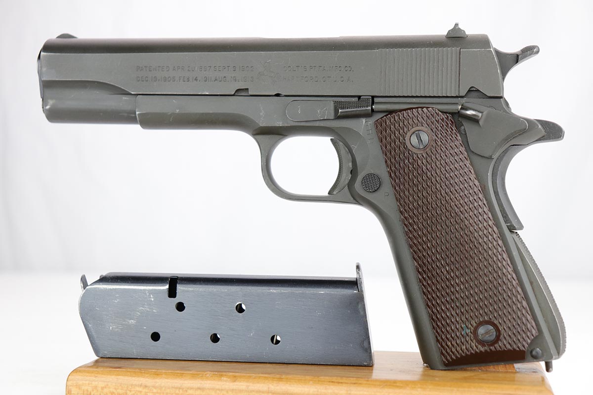 3/4/21 – This is a near-mint Colt M1911A1 from 1943, after the change to leave slides unnumbered. Original finish rates at 98-99% with minor scuffs here or there, but hardly any finish loss on the parkerized surfaces. Colt barrel with small ‘F’ under lug. Minty bore. Excellent grips. ‘L’ marked magazine.