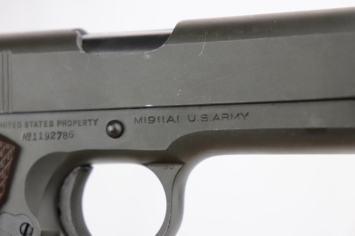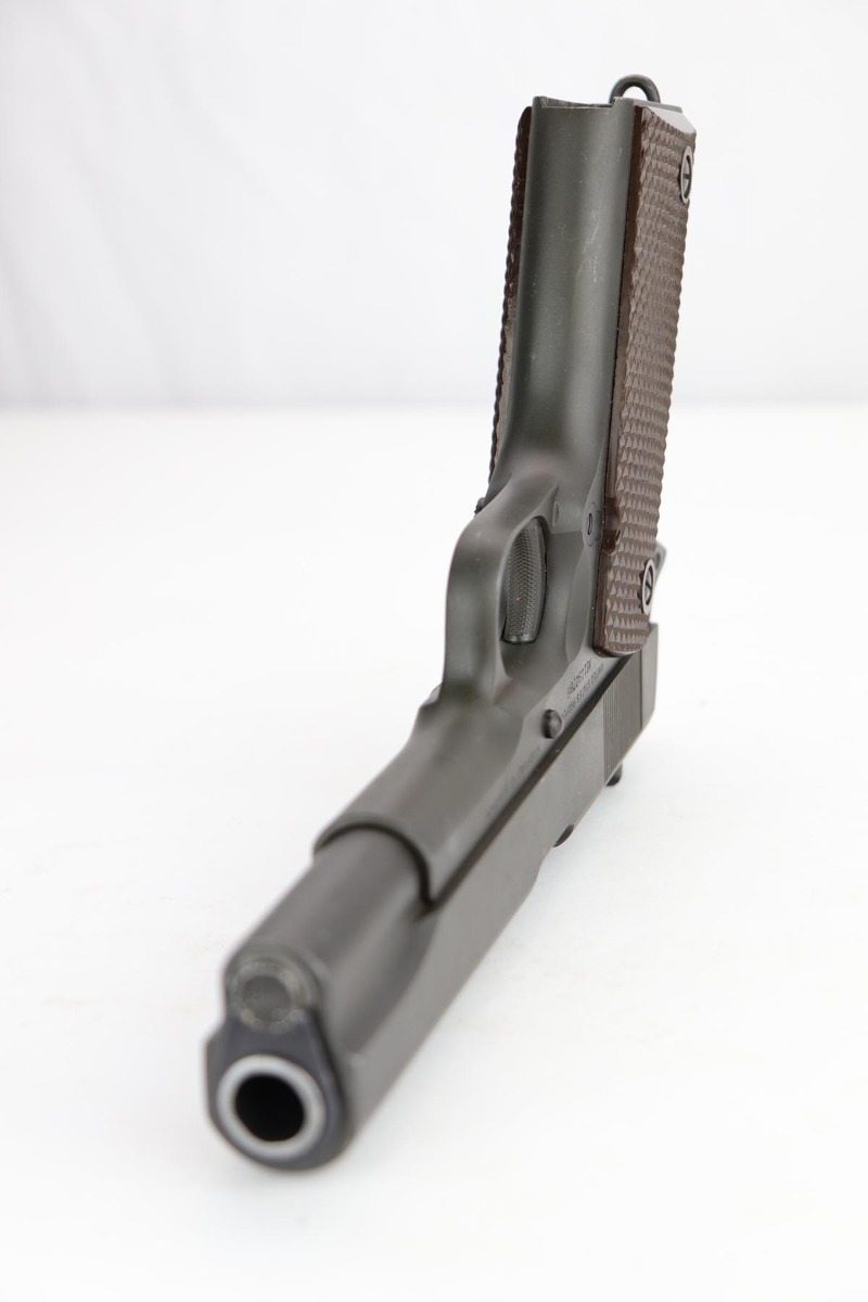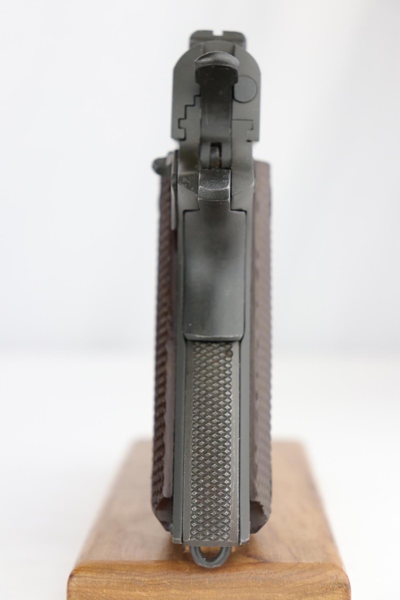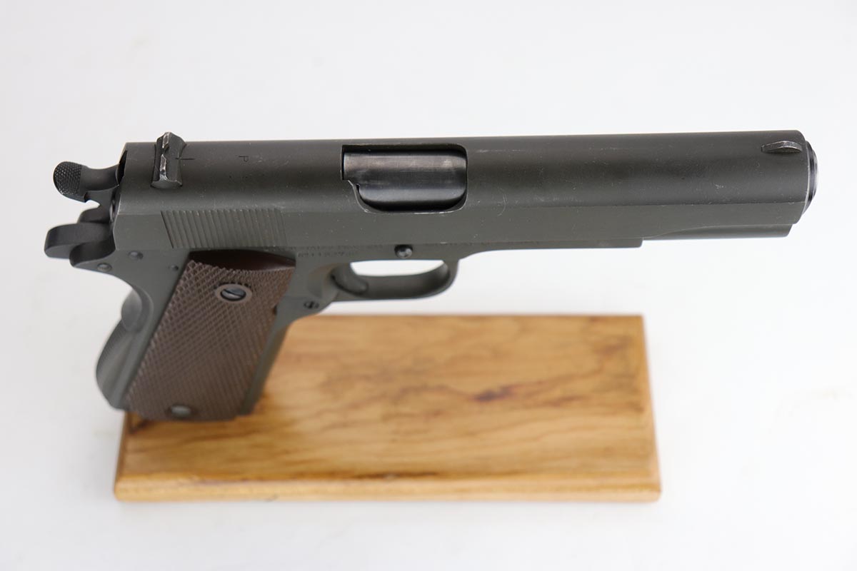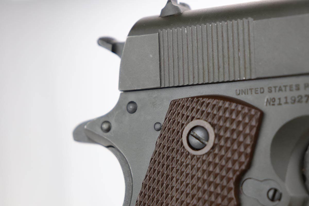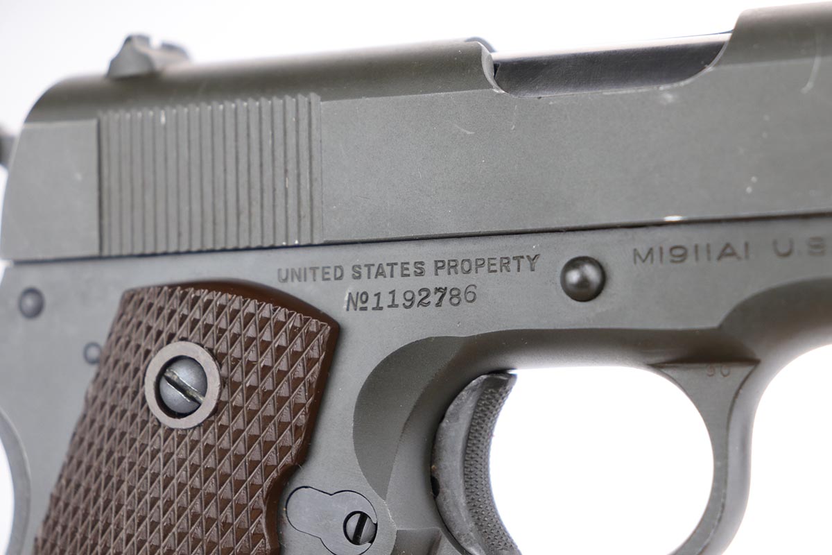 3/4/21 – This is a near-mint Colt M1911A1 from 1943, after the change to leave slides unnumbered. Original finish rates at 98-99% with minor scuffs here or there, but hardly any finish loss on the parkerized surfaces. Colt barrel with small ‘F’ under lug. Minty bore. Excellent grips. ‘L’ marked magazine.