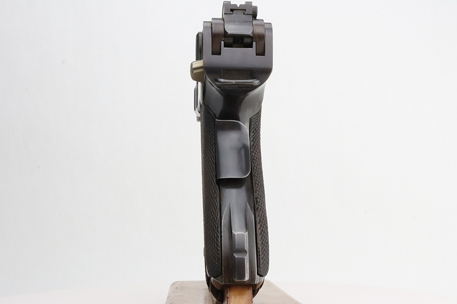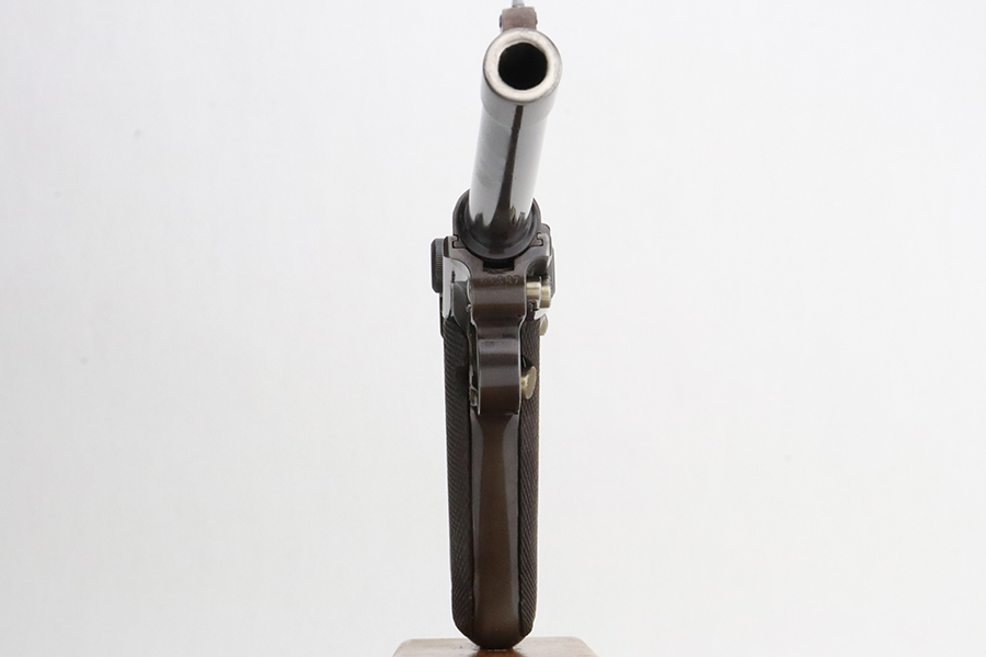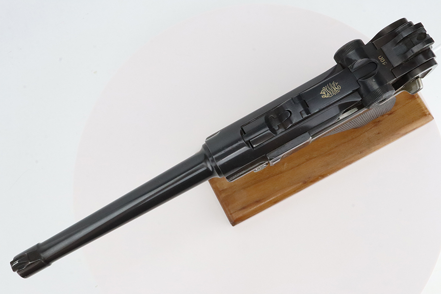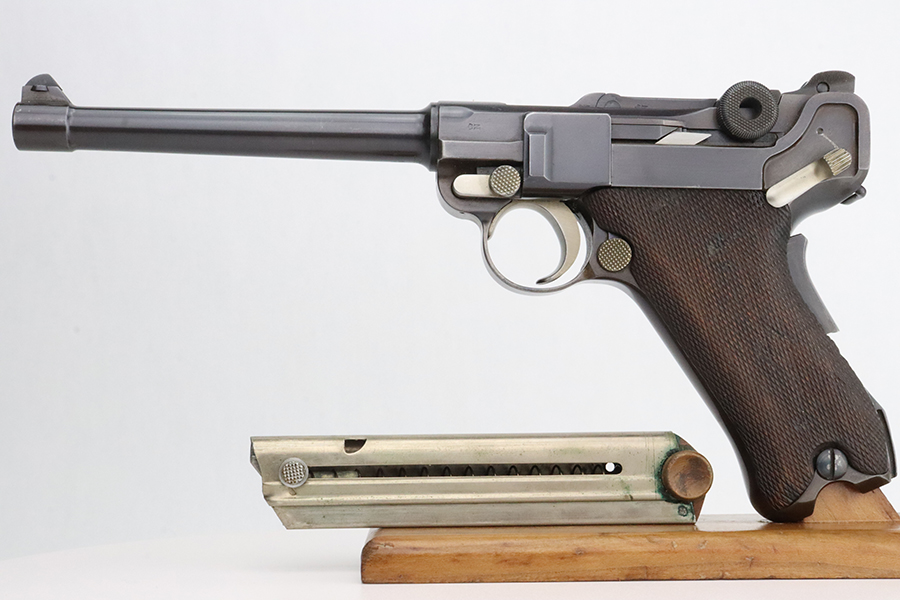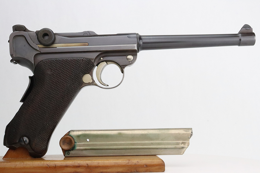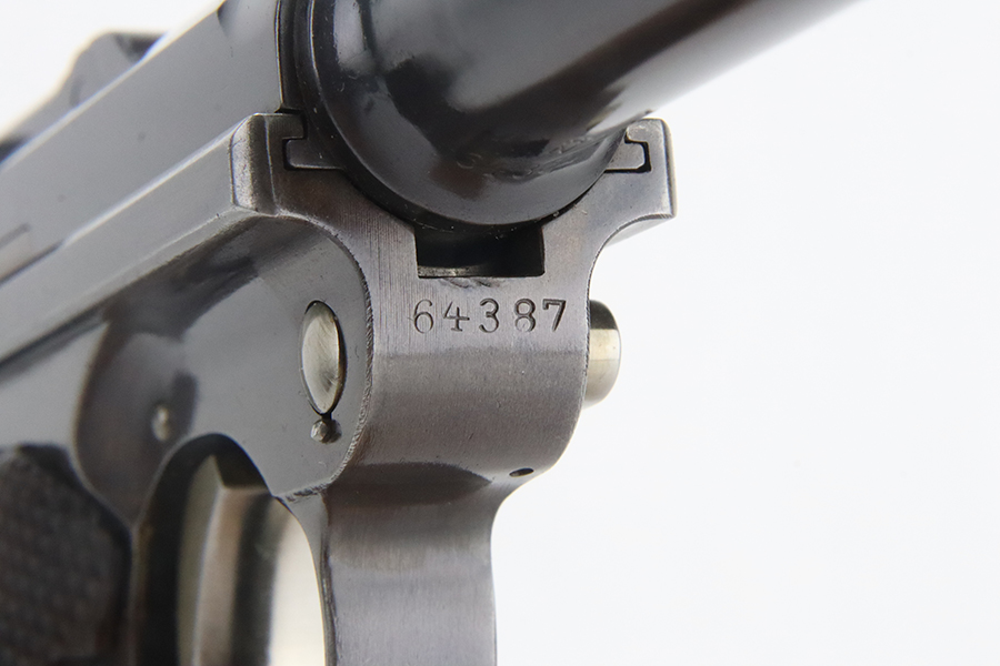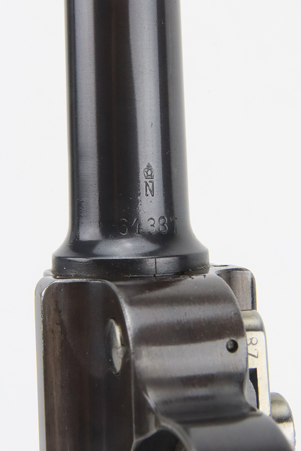 3/4/24 – This is a WWI-era commercial DWM Navy Luger. All matching with commercial “Crown N” proofs. This gun has been completely professionally restored and refinished. There is almost no actual finish loss, just a hint of muzzle wear. Fitted with matching wood grips and a blank-bottom commercial magazine (the hold-open does not work with this magazine). The bore has decent rifling, but there is minor pitting throughout.