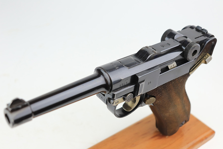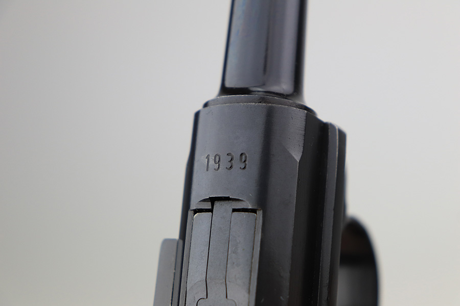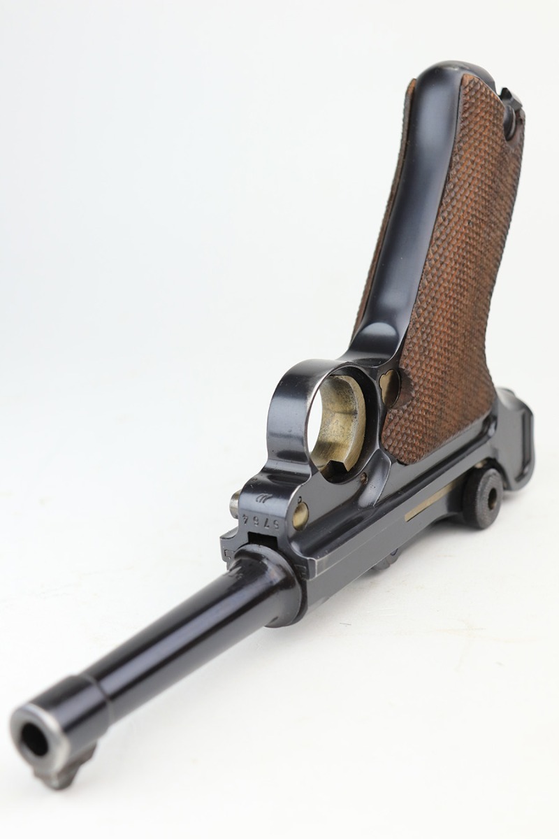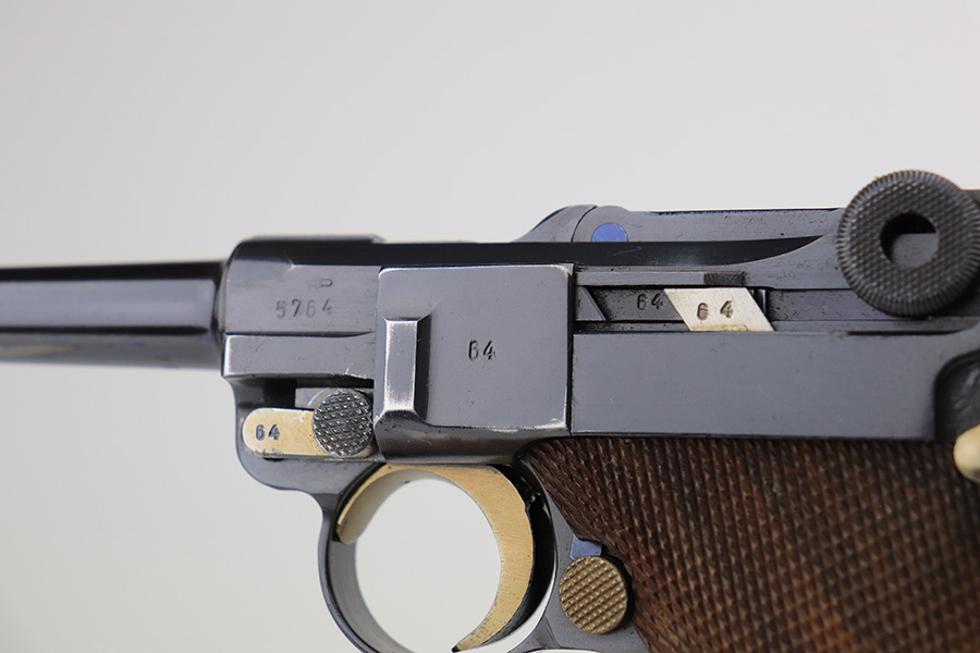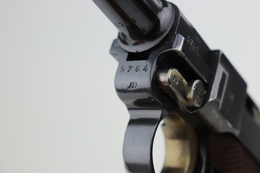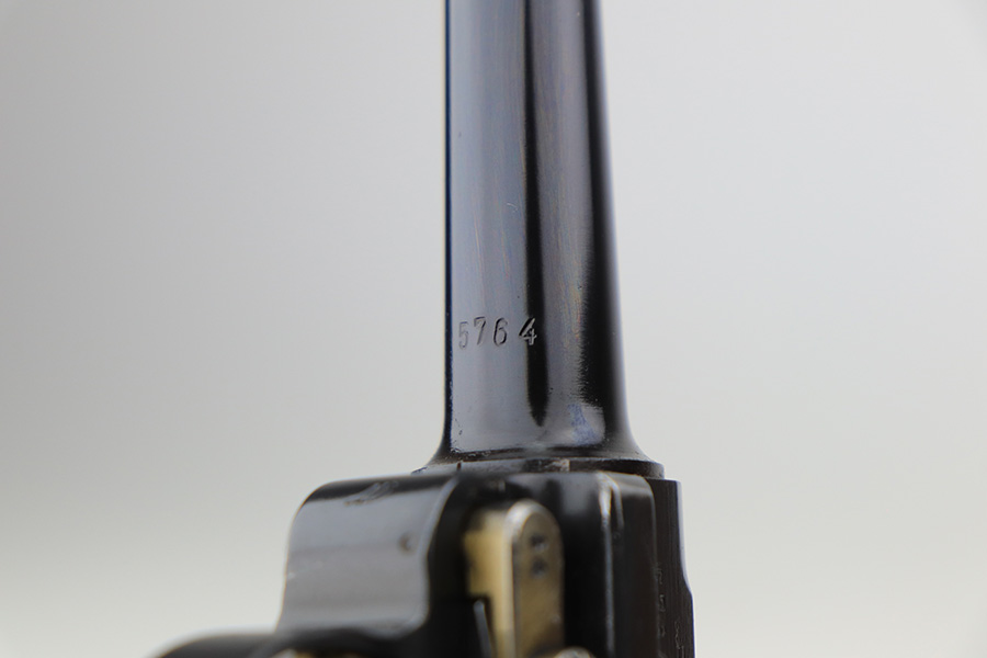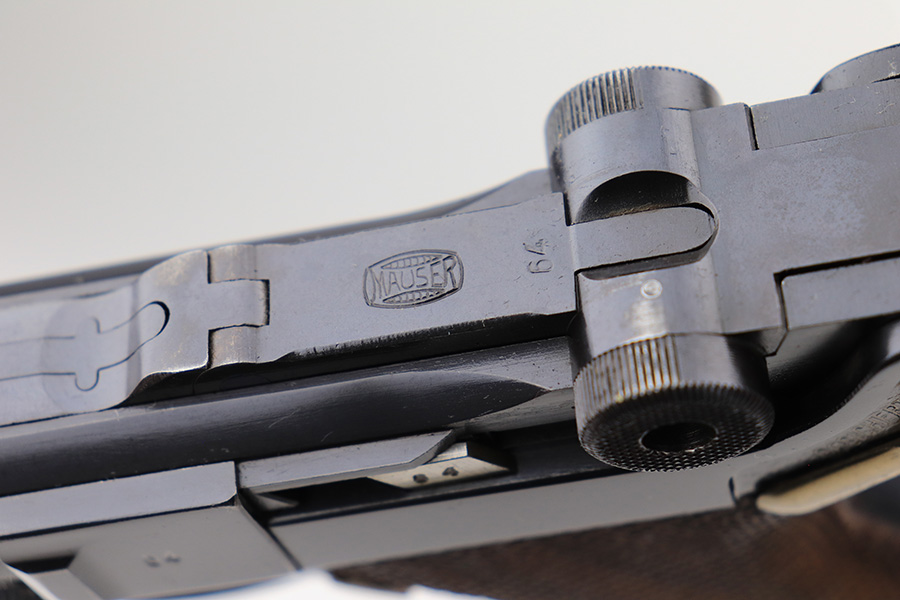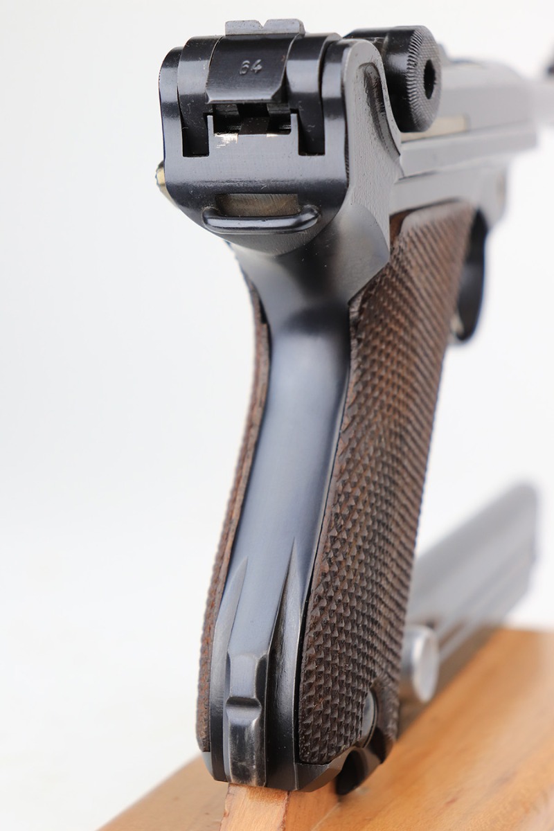 3/16/22 – This is an absolutely gorgeous, and quite rare commercial Mauser Banner Luger from 1939 with the original, matching magazine. The general rule of thumb is that commercial pistols didn’t feature numbered magazines, but specifically in a small section of the ‘w’ block for Mauser Banner Lugers, many were issued with factory numbered magazines for unknown reason. This particular gun is all correct and original with 97% of the blue, just showing some holster wear on the muzzle, sideplate and bottom of the front strap. Mint bore, looks unfired. Unmarked grips with sharp checkering and no cracks or chips. Beautiful, original straw on the small parts. Presumably only a few hundred such examples remain, and this is a high-condition example.