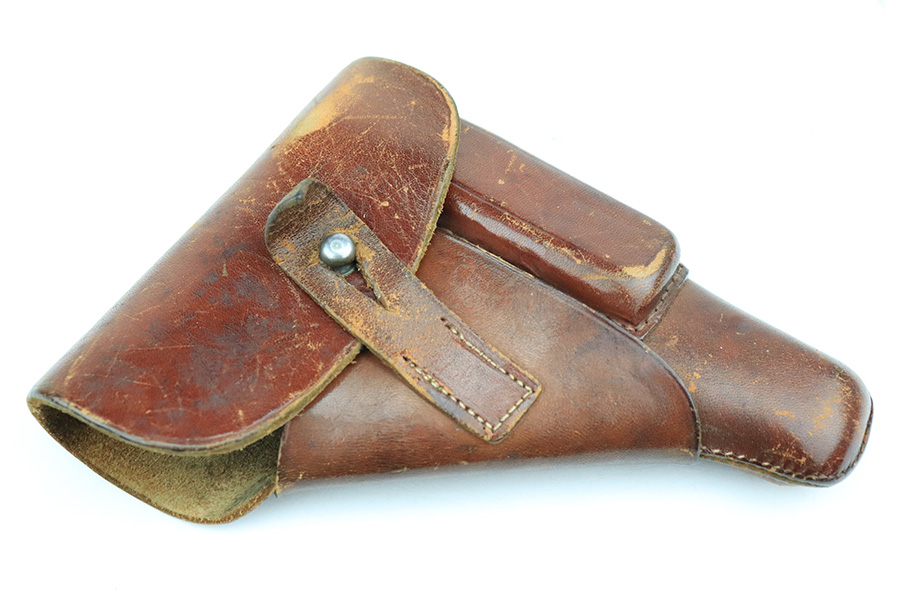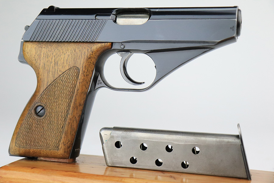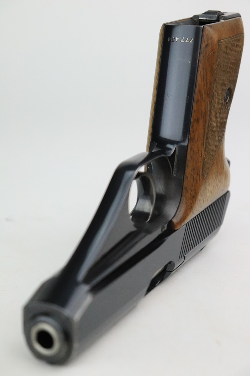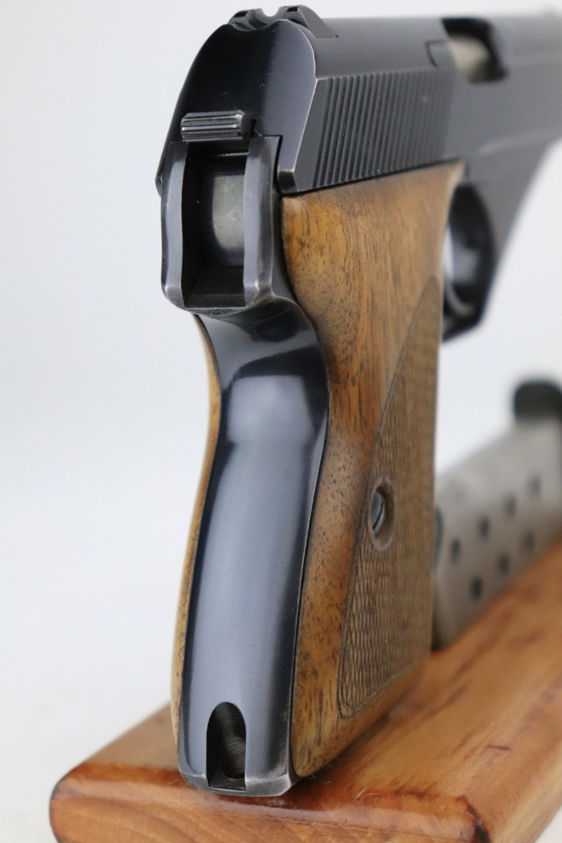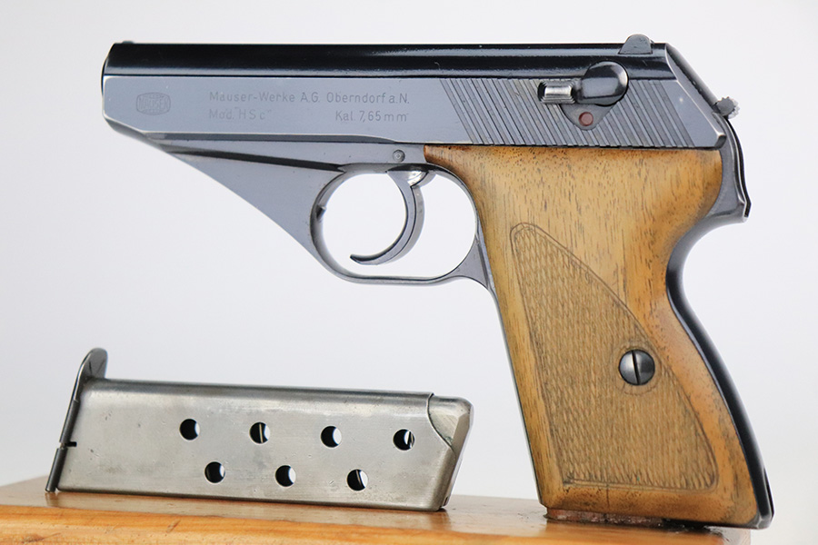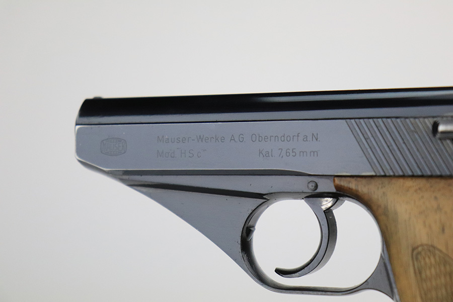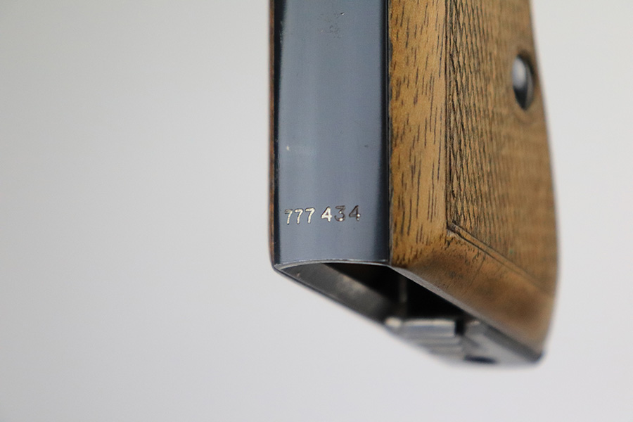 7/14/22 – This is a beautiful example of a Mauser HSC sold in the commercial market in 1942. It is all matching and has the proper “Eagle N” commercial proofs, no military markings. It comes as a rig with a nice generic tan leather holster and two period-correct magazines. The gun has retained nearly all of its original beautiful high polish finish with just hints of wear around the muzzle and base of the back strap. A few tiny handling marks on the front strap. Comes with excellent period-correct blonde wood grips. The bore is stone-mint.