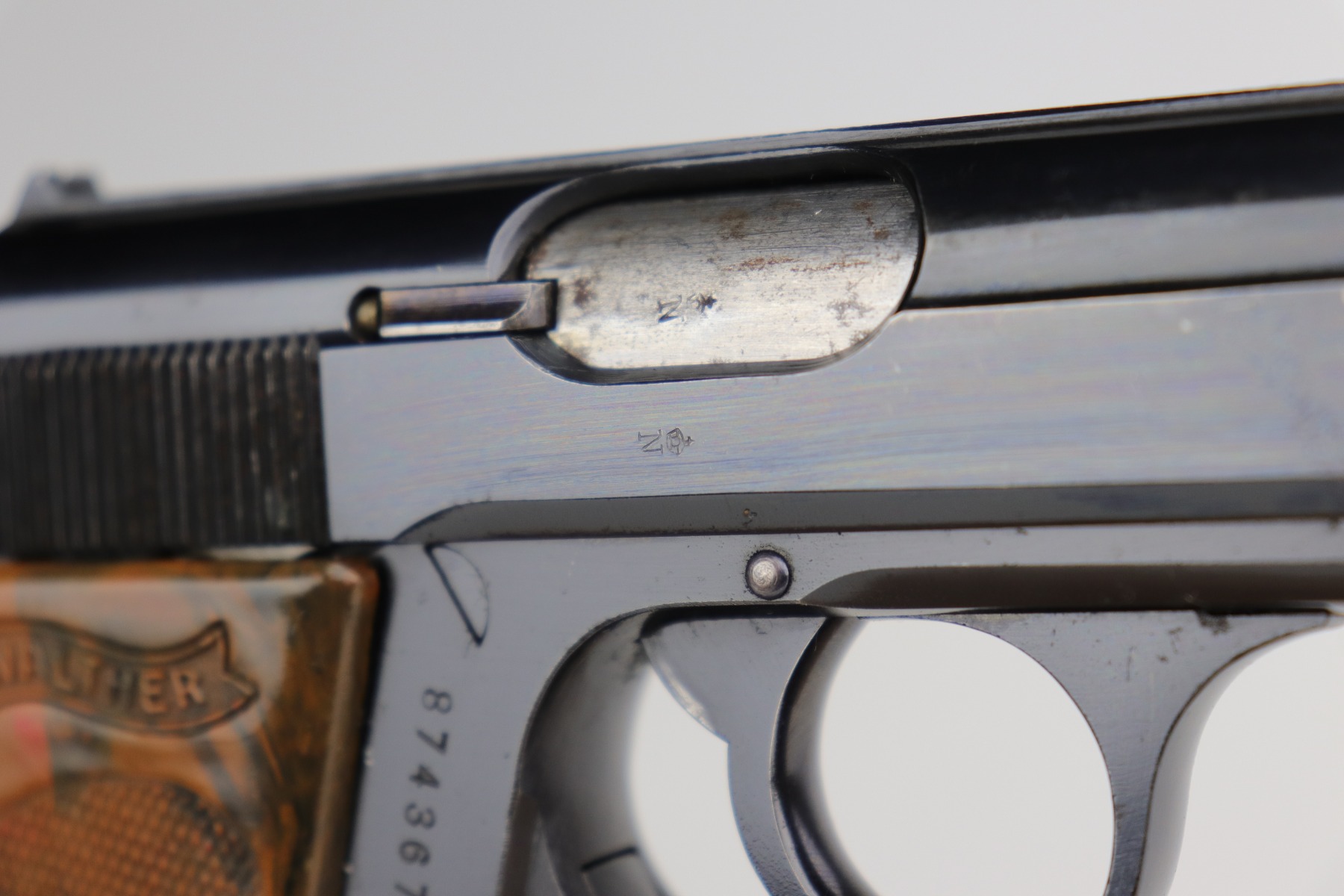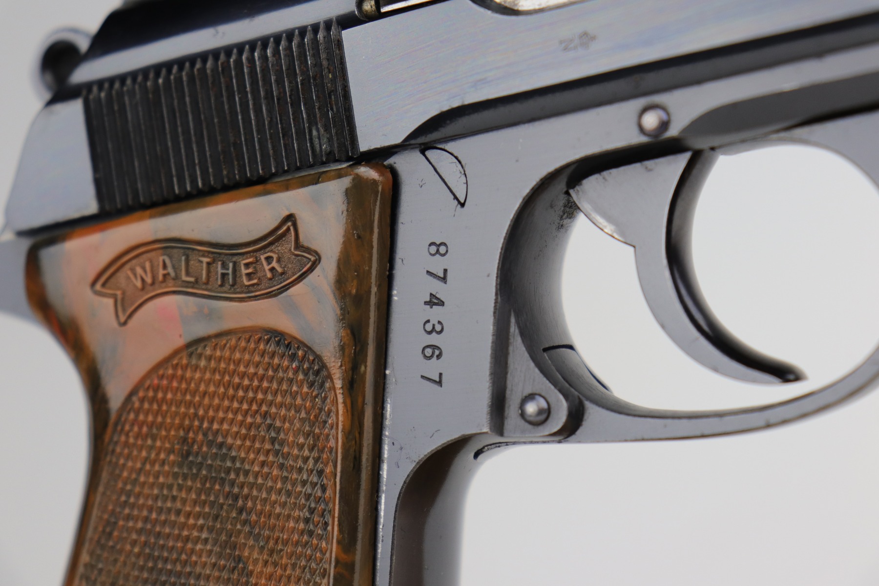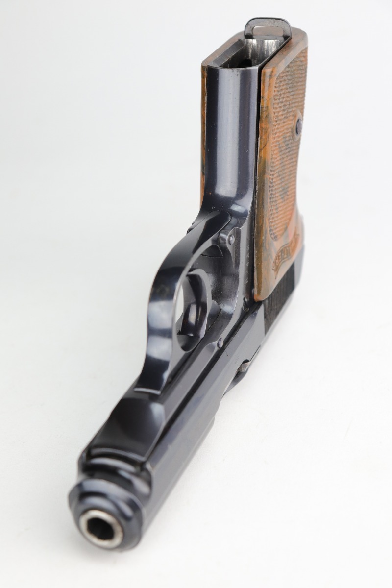 12/29/20 – This is a beautiful example of a Walther PPK sold in the commercial market in 1935. It is all matching and has the proper “Crown N” proofs. It has retained about 98% of its original bluing. There is just a hint of wear around the muzzle and a few light handling marks on the right side of the slide. There is also one small area of discoloration on the right side of the slide. It comes with an excellent period-correct grip and one proper magazine. The bore is near-mint.