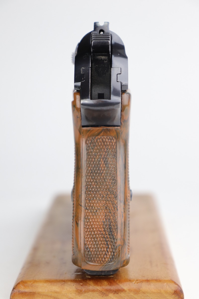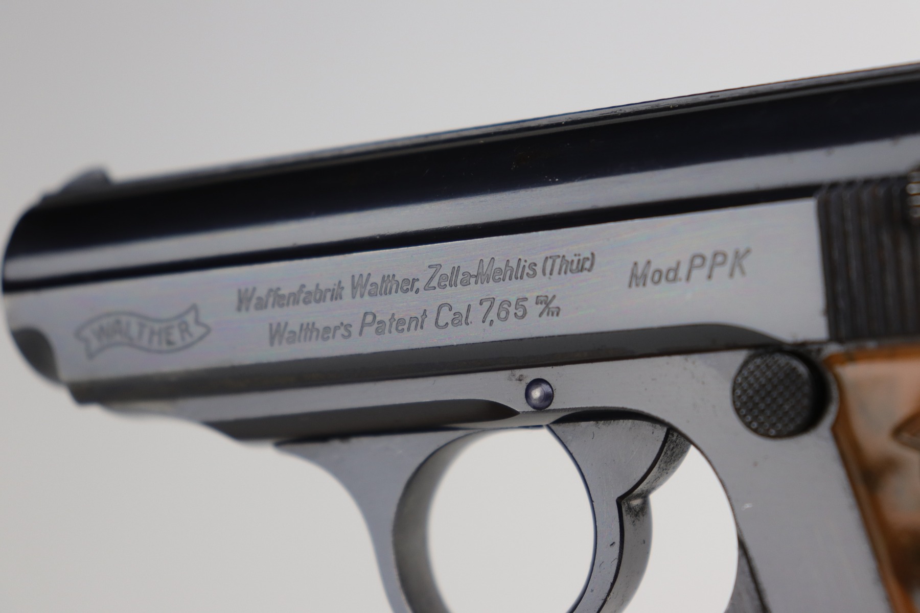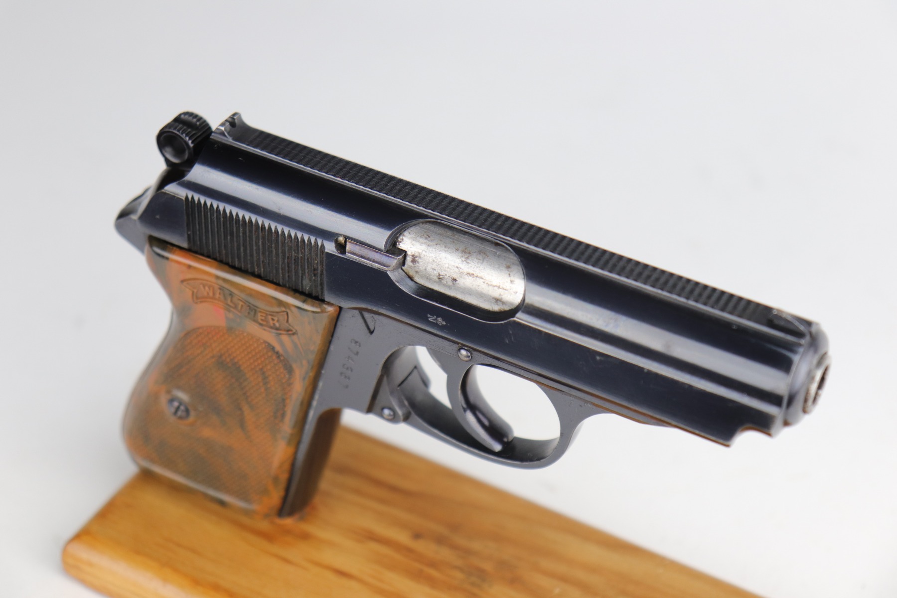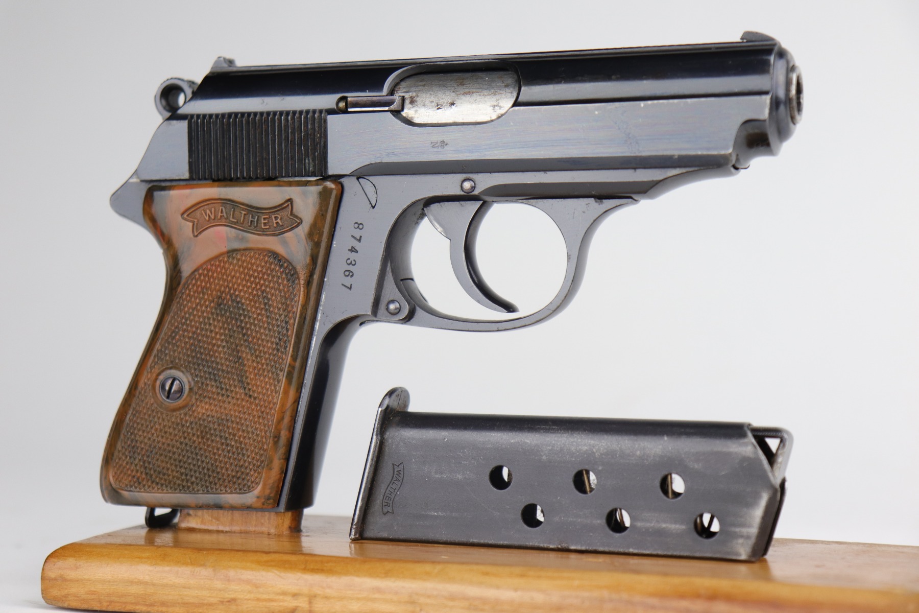 12/29/20 – This is a beautiful example of a Walther PPK sold in the commercial market in 1935. It is all matching and has the proper “Crown N” proofs. It has retained about 98% of its original bluing. There is just a hint of wear around the muzzle and a few light handling marks on the right side of the slide. There is also one small area of discoloration on the right side of the slide. It comes with an excellent period-correct grip and one proper magazine. The bore is near-mint.