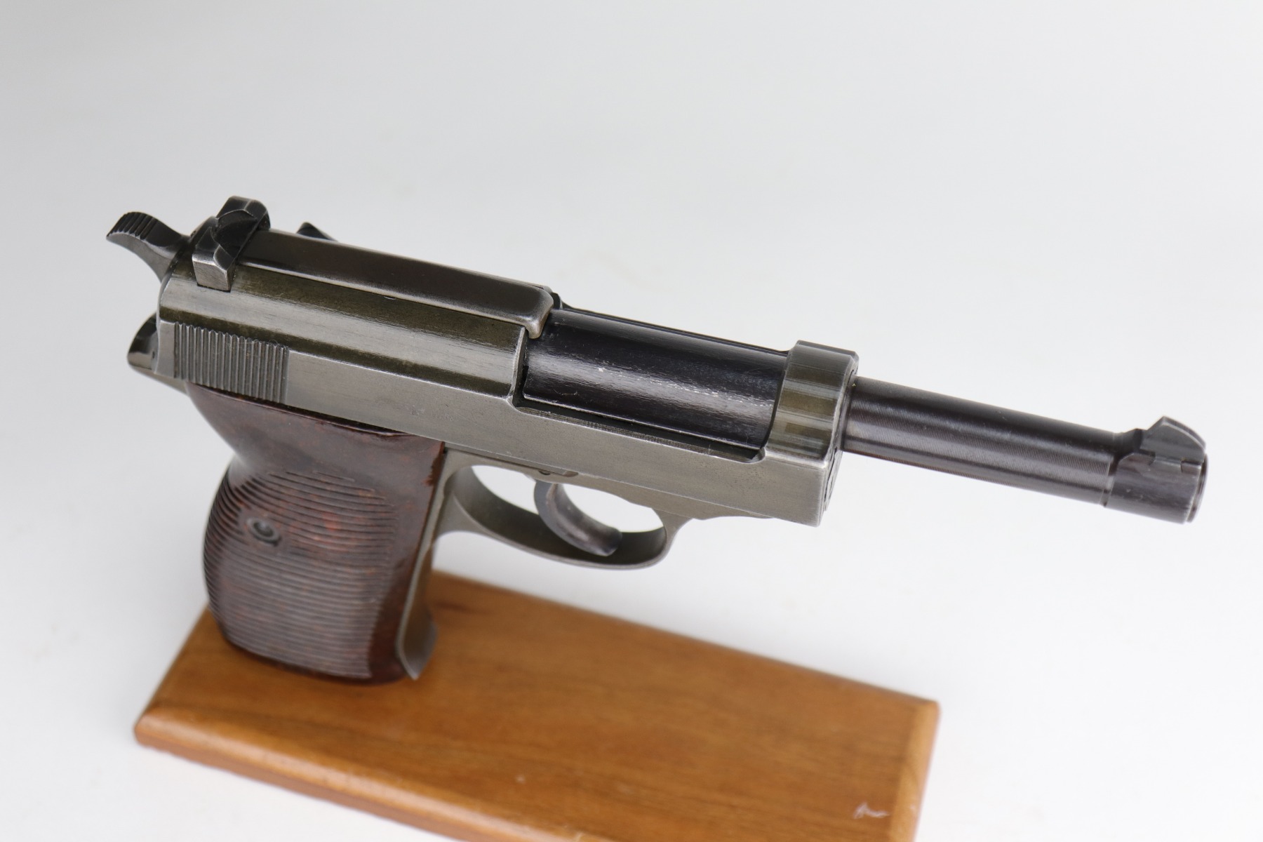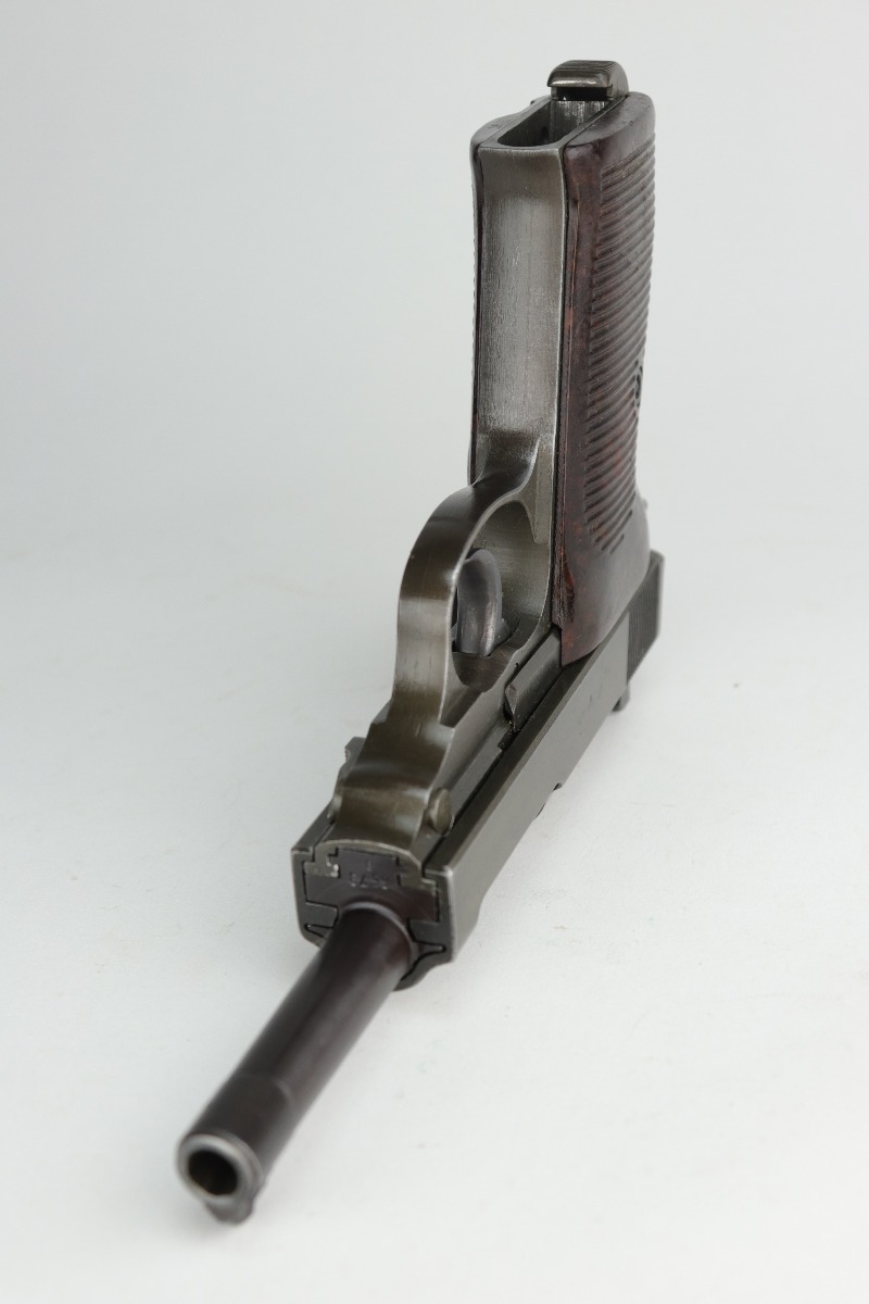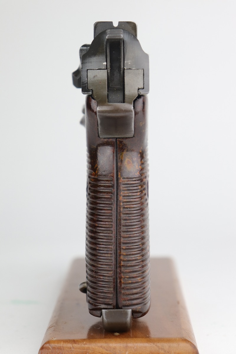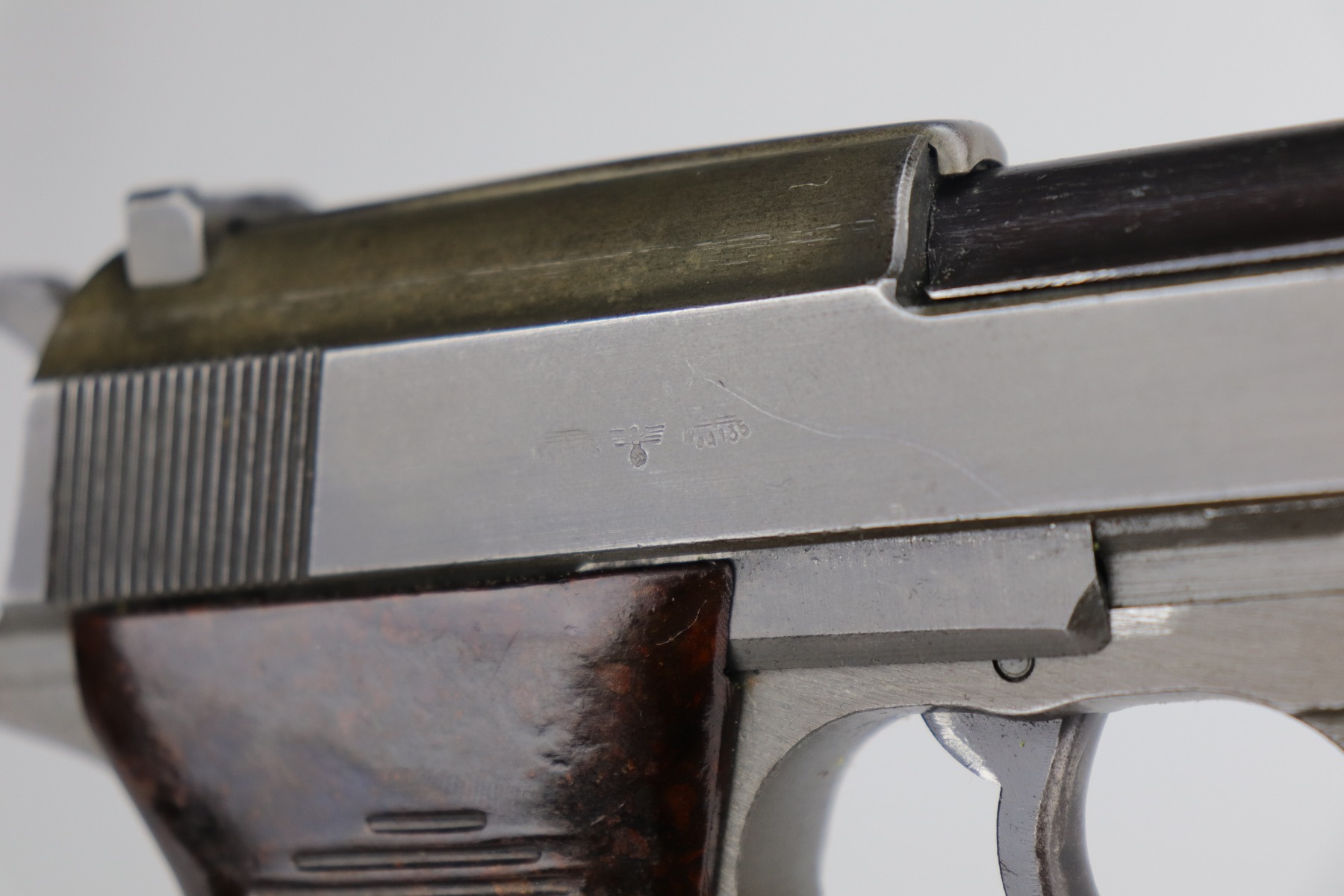 11/6/20 – This is an absolutely beautiful example of a dual-tone Mauser P.38 issued to the Nazi military in 1944. It get its dual-tone appearance from a phosphated frame and a blued barrel. This one is all matching and has the proper “Eagle 135” Nazi military acceptance proofs. It is minty, retaining more than 98% of its original finish. There is very minor wear around the muzzle and front edge of the slide. One surface scratch on the right side of the slide. Fully functional, including the de-cocker. Comes with excellent late-war grips and one period-correct magazine. The bore is excellent – shiny with very strong rifling and very minor freckling in the grooves.