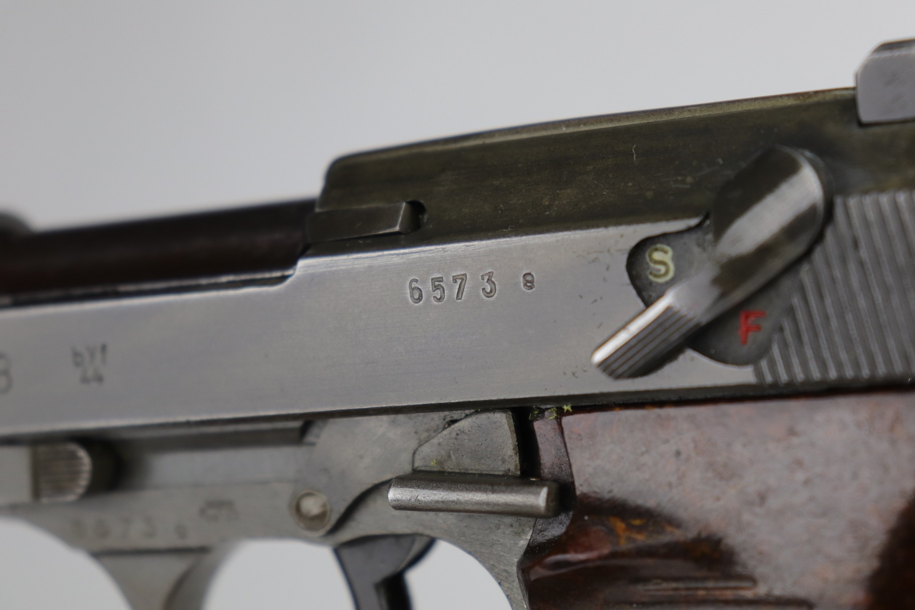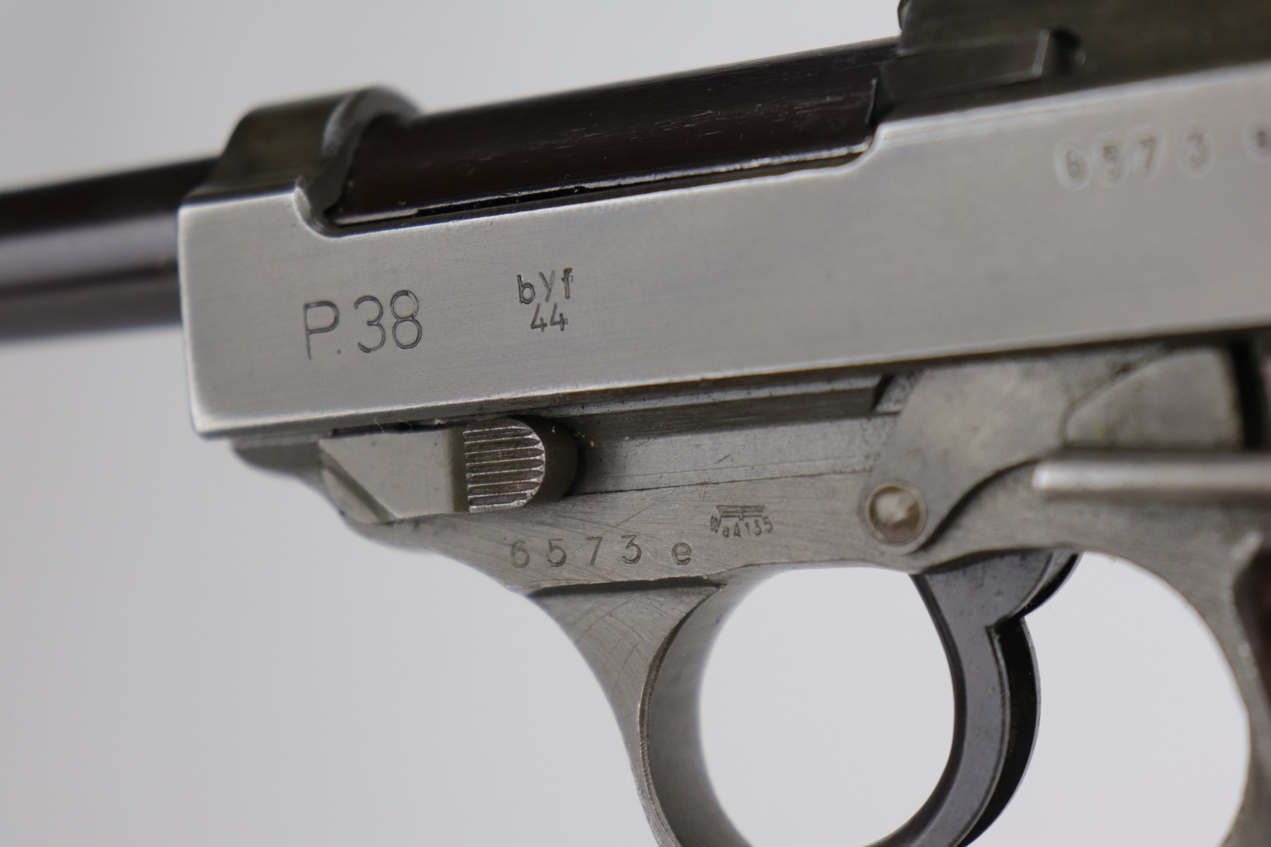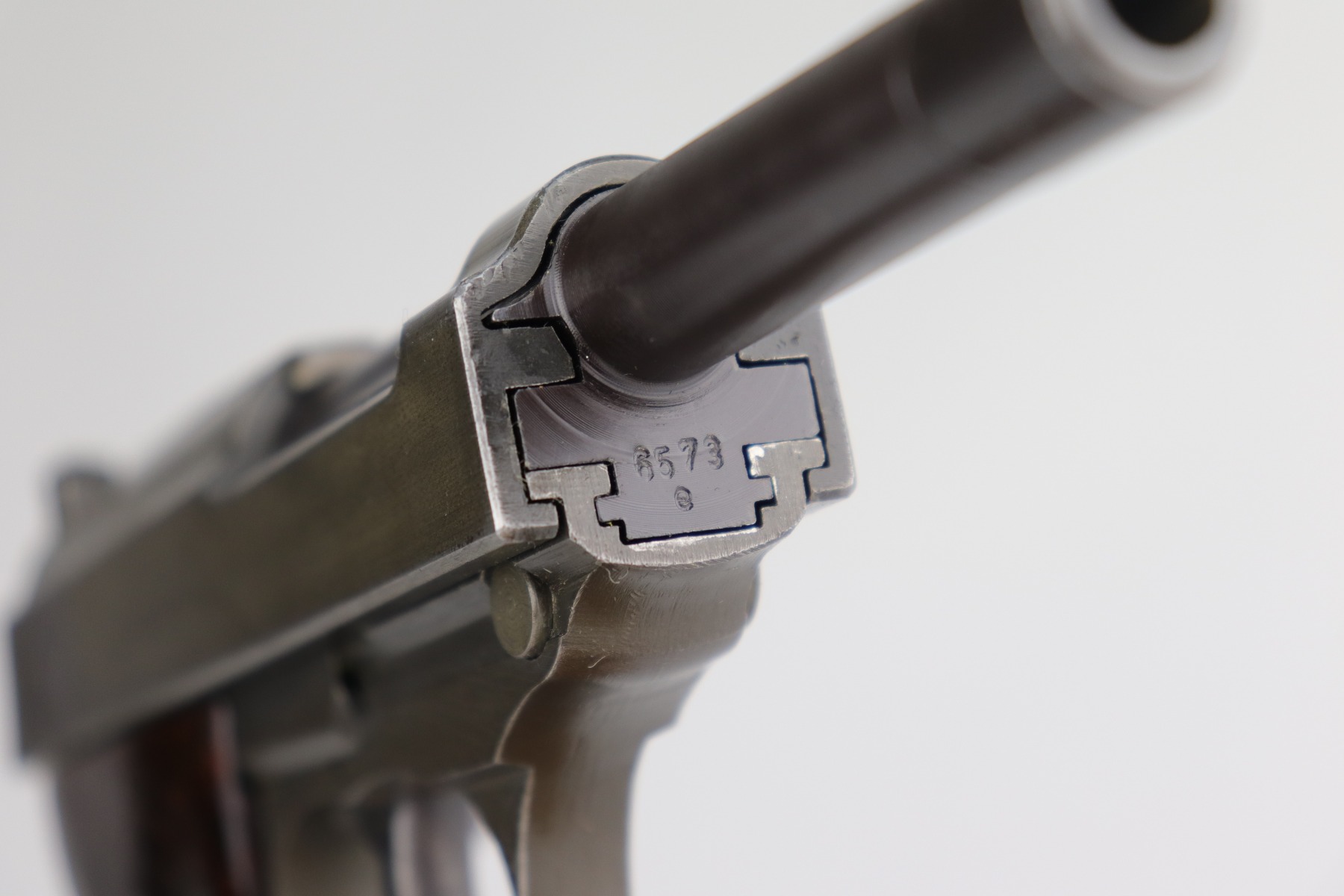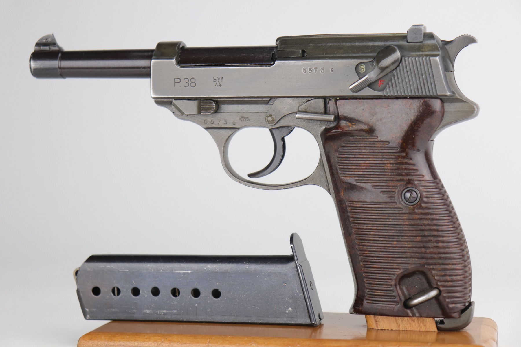 11/6/20 – This is an absolutely beautiful example of a dual-tone Mauser P.38 issued to the Nazi military in 1944. It get its dual-tone appearance from a phosphated frame and a blued barrel. This one is all matching and has the proper “Eagle 135” Nazi military acceptance proofs. It is minty, retaining more than 98% of its original finish. There is very minor wear around the muzzle and front edge of the slide. One surface scratch on the right side of the slide. Fully functional, including the de-cocker. Comes with excellent late-war grips and one period-correct magazine. The bore is excellent – shiny with very strong rifling and very minor freckling in the grooves.