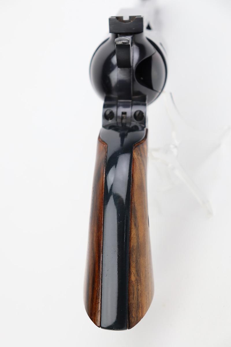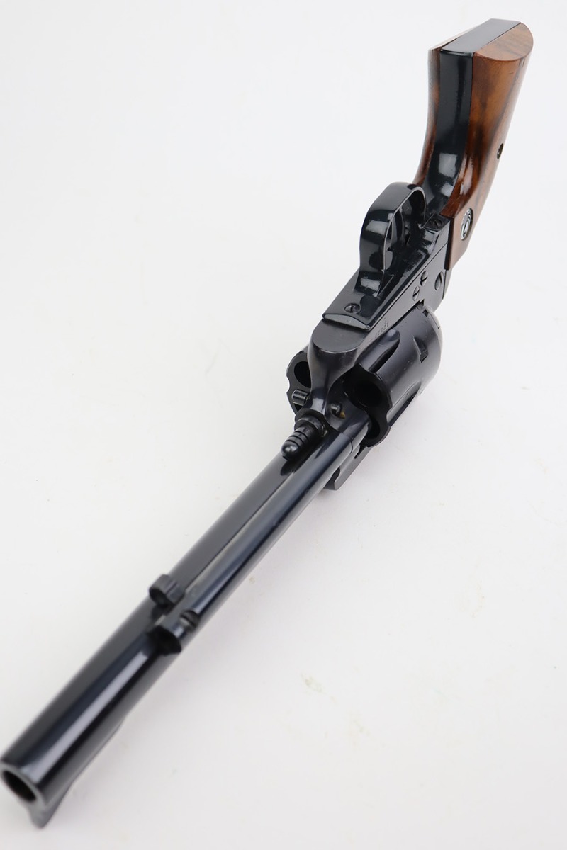 7/10/23 – This is a beautiful example of an early Ruger Blackhawk revolver, chambered in .44 Magnum with a 6.5″ barrel. This is an early 3 screw, flat-top example. No added transfer bar. According to the included factory letter, this gun was manufactured in September of 1958. It is in beautiful condition with essentially no signs of wear or use – barely even the slightest hint of a roll mark on the cylinder. Excellent wood grips. Like-new bore.
