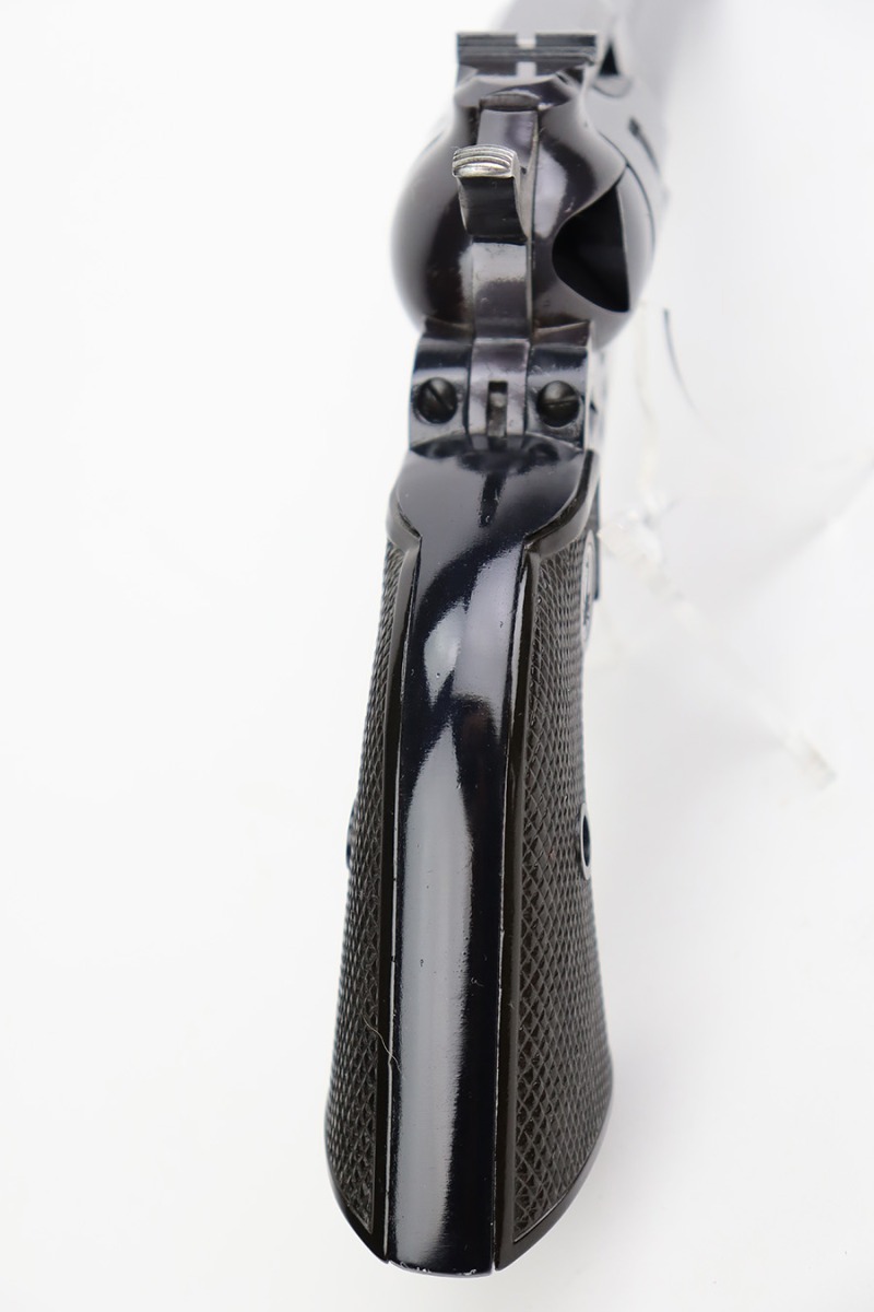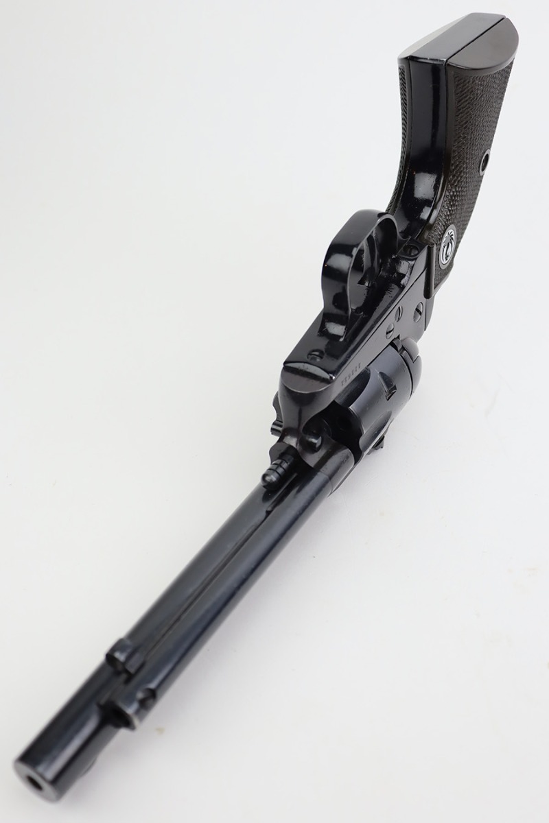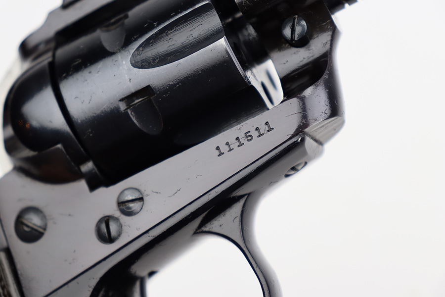7/10/23 – This is a beautiful example of an early Ruger Single-Six revolver, chambered in .22 LR with a 5.5″ barrel. This is an early 3 screw example. No added transfer bar. According to the included factory letter, it was manufactured in August of 1958. It is in beautiful condition with essentially no signs of wear or use – barely even the slightest hint of a roll mark on the cylinder and a hint of wear around the muzzle. Excellent black plastic grips. Like-new bore.