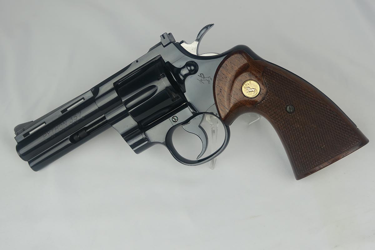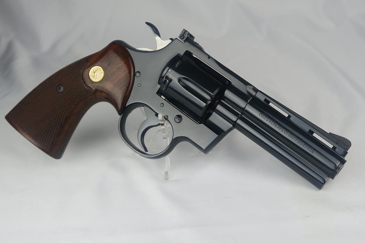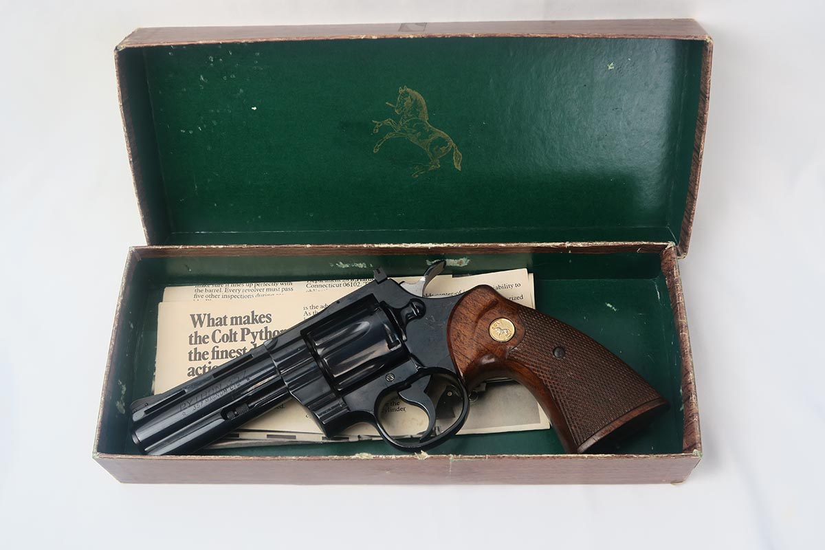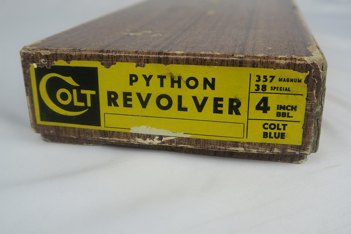 9/1/17 – This is an absolutely magnificent Colt Python, made in 1965, with a desirable 4-inch barrel and an original box. This early gun retains over 99% of the original deep luster blue that made the 1960’s Pythons such attractive guns for shooters and collectors alike. This particular specimen is nearly new with a very light turn line on the cylinder and no evidence of it being fired beyond test firing at the factory. It has beautiful original grips and a mint bore. It also comes with an original box and a page from a period magazine advertisement. The box appears to be unserialized and is in very good condition. The action on Colt Pythons is as smooth as butter, and these are often considered to have the best action of any out of the box revolver. The guns made in the 60’s are considered to be the best finished Pythons of all time, as the polishing and finish of these beautiful guns deteriorated in the 70’s, 80’s and 90’s, at which point production was terminated by Colt.