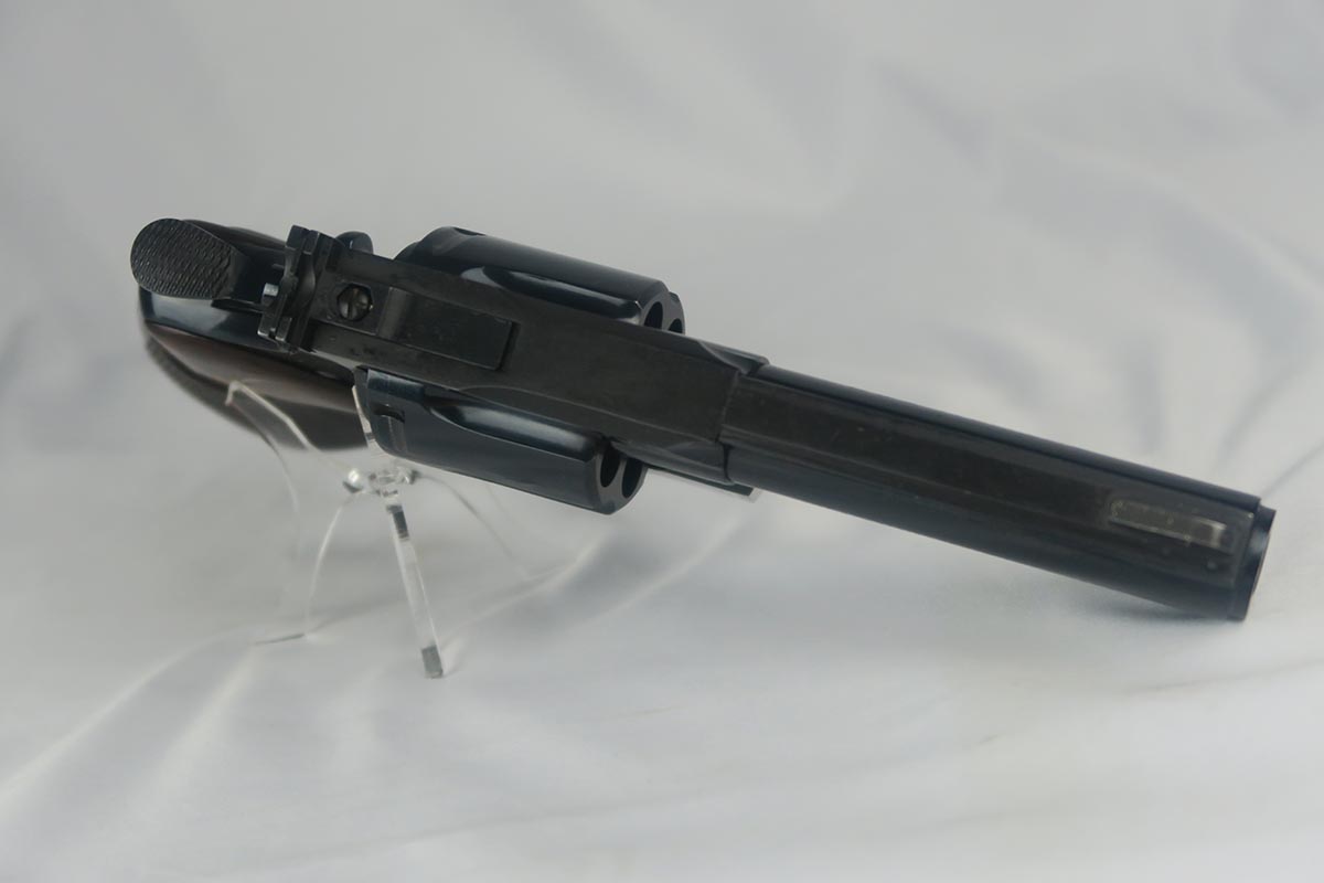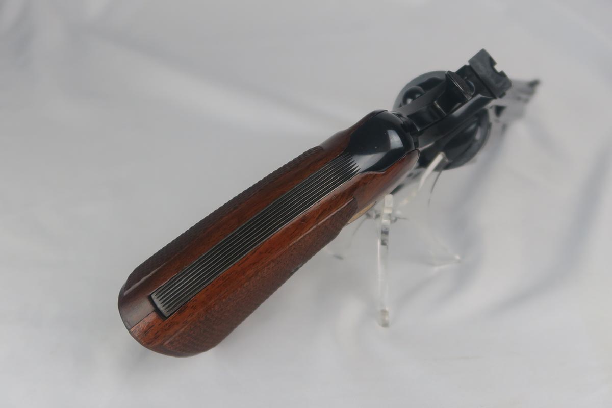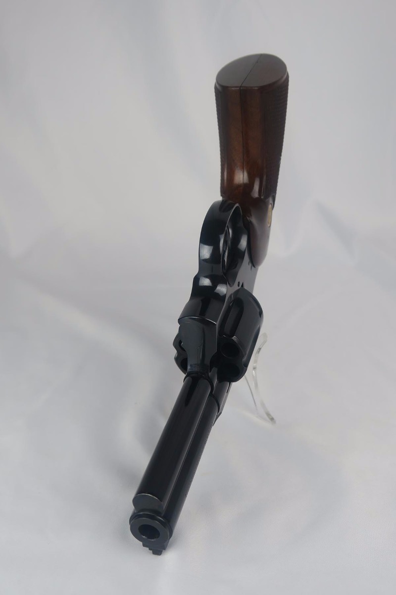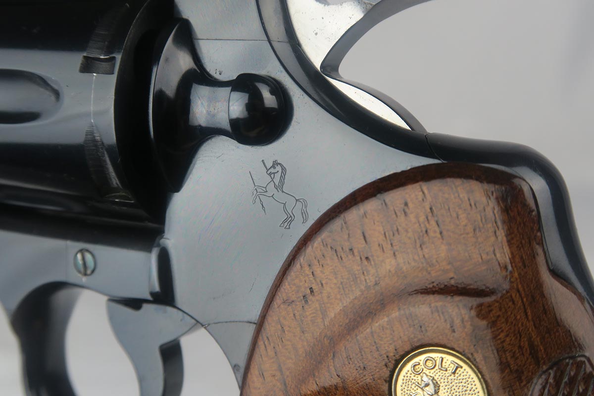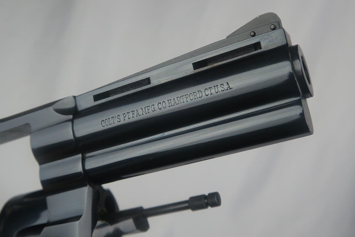 9/1/17 – This is an absolutely magnificent Colt Python, made in 1965, with a desirable 4-inch barrel and an original box. This early gun retains over 99% of the original deep luster blue that made the 1960’s Pythons such attractive guns for shooters and collectors alike. This particular specimen is nearly new with a very light turn line on the cylinder and no evidence of it being fired beyond test firing at the factory. It has beautiful original grips and a mint bore. It also comes with an original box and a page from a period magazine advertisement. The box appears to be unserialized and is in very good condition. The action on Colt Pythons is as smooth as butter, and these are often considered to have the best action of any out of the box revolver. The guns made in the 60’s are considered to be the best finished Pythons of all time, as the polishing and finish of these beautiful guns deteriorated in the 70’s, 80’s and 90’s, at which point production was terminated by Colt.