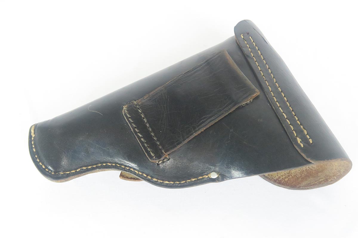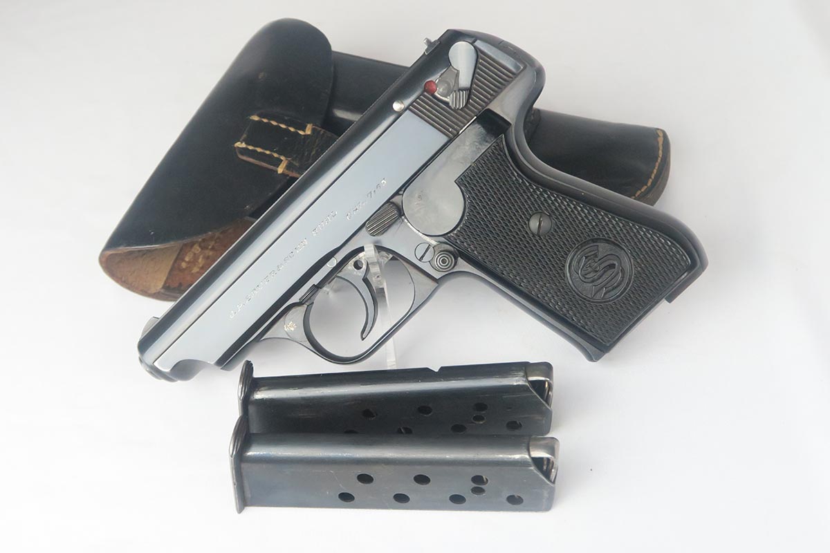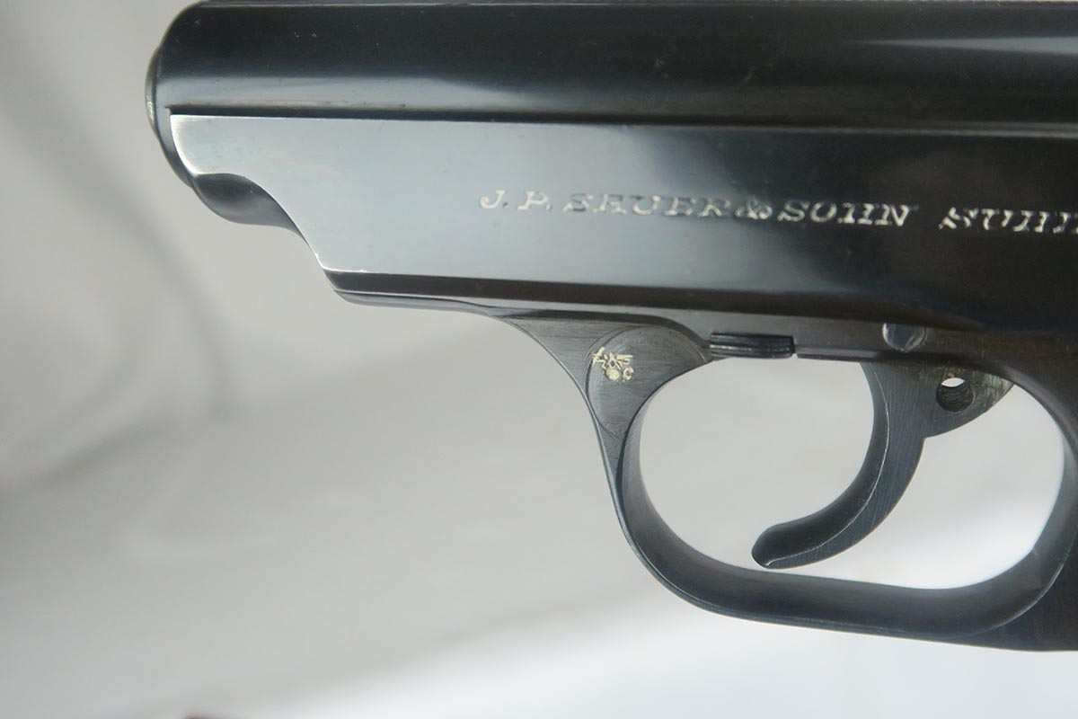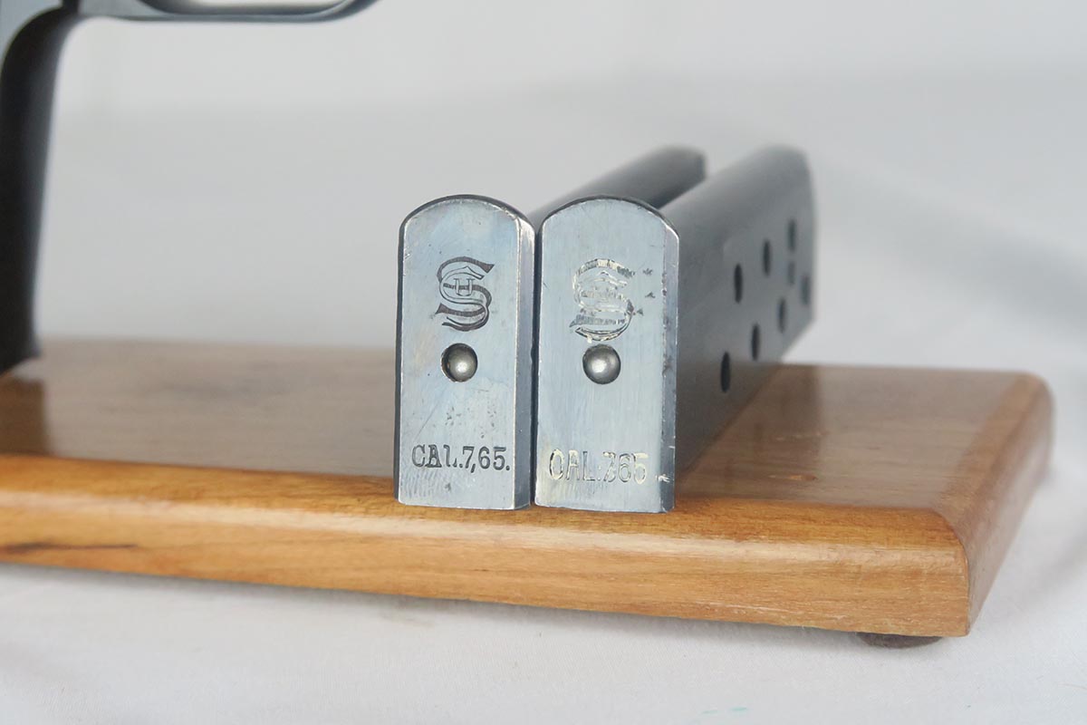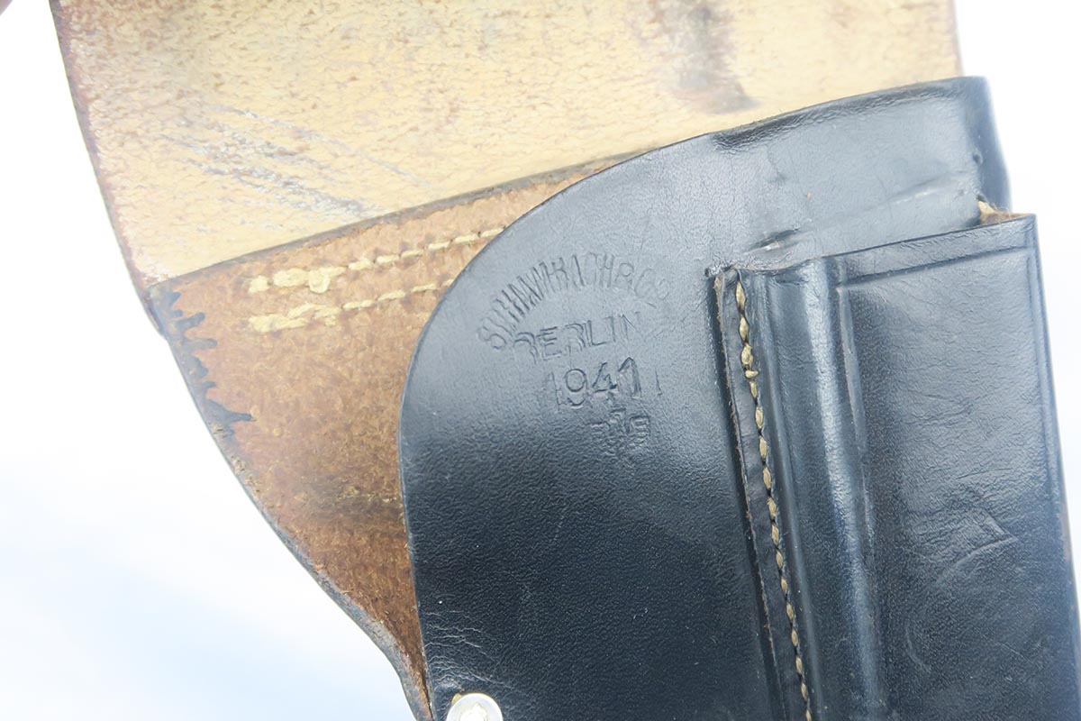 2/1/18 – This is an early, high-polish Sauer 38h rig with police proof on the left side frame. The pistol comes with an excellent 1941 Berlin holster and two total early-style magazines. The high-polish blue of the pistol is original and rates at 97% with minor edge wear and a spot of finish loss on the back of the slide. Excellent grips and a mirror bore. Mechanically sound, including the decocker.