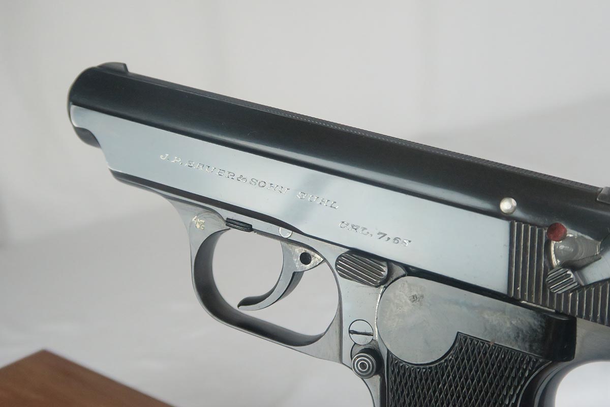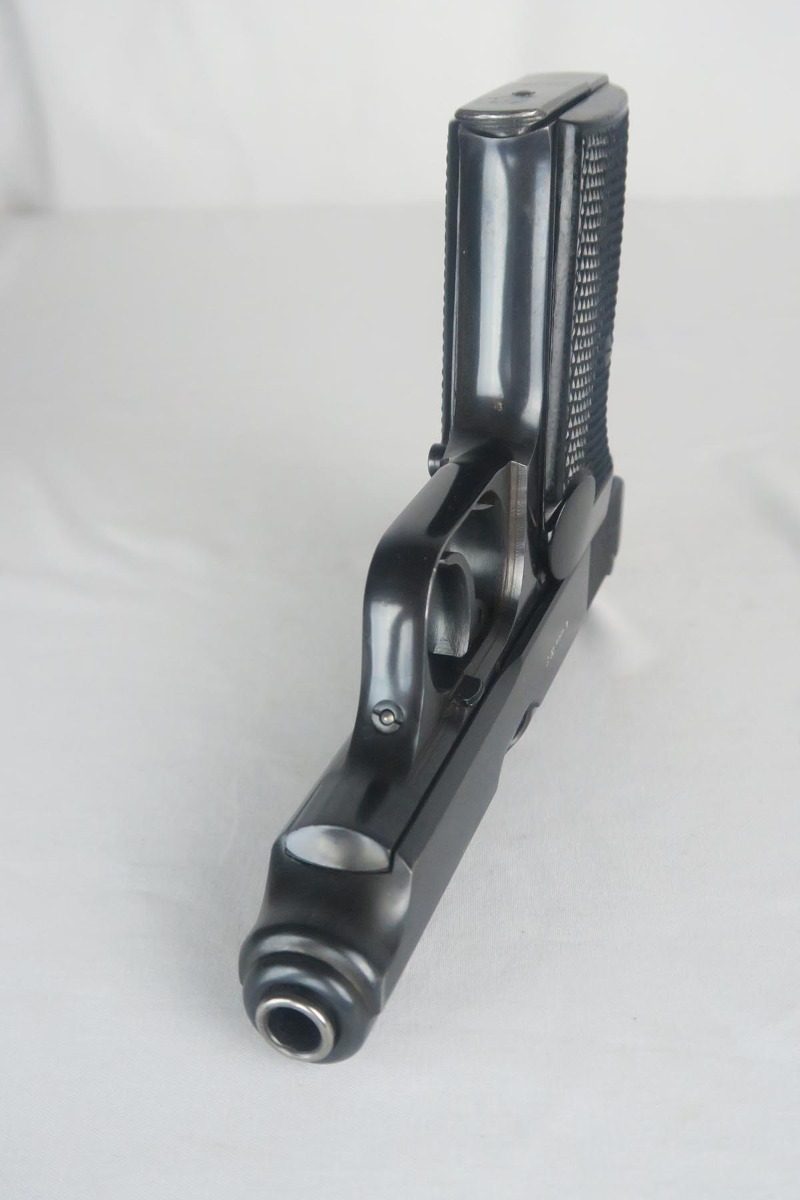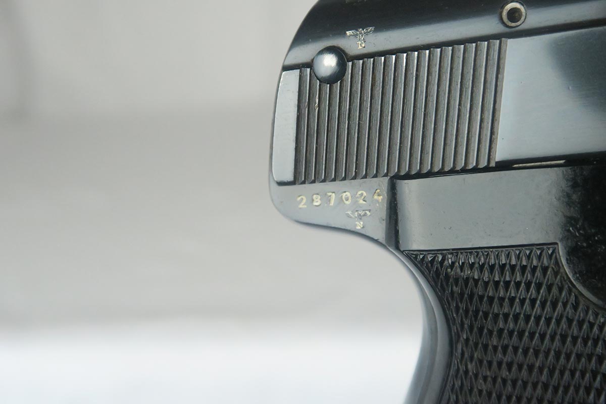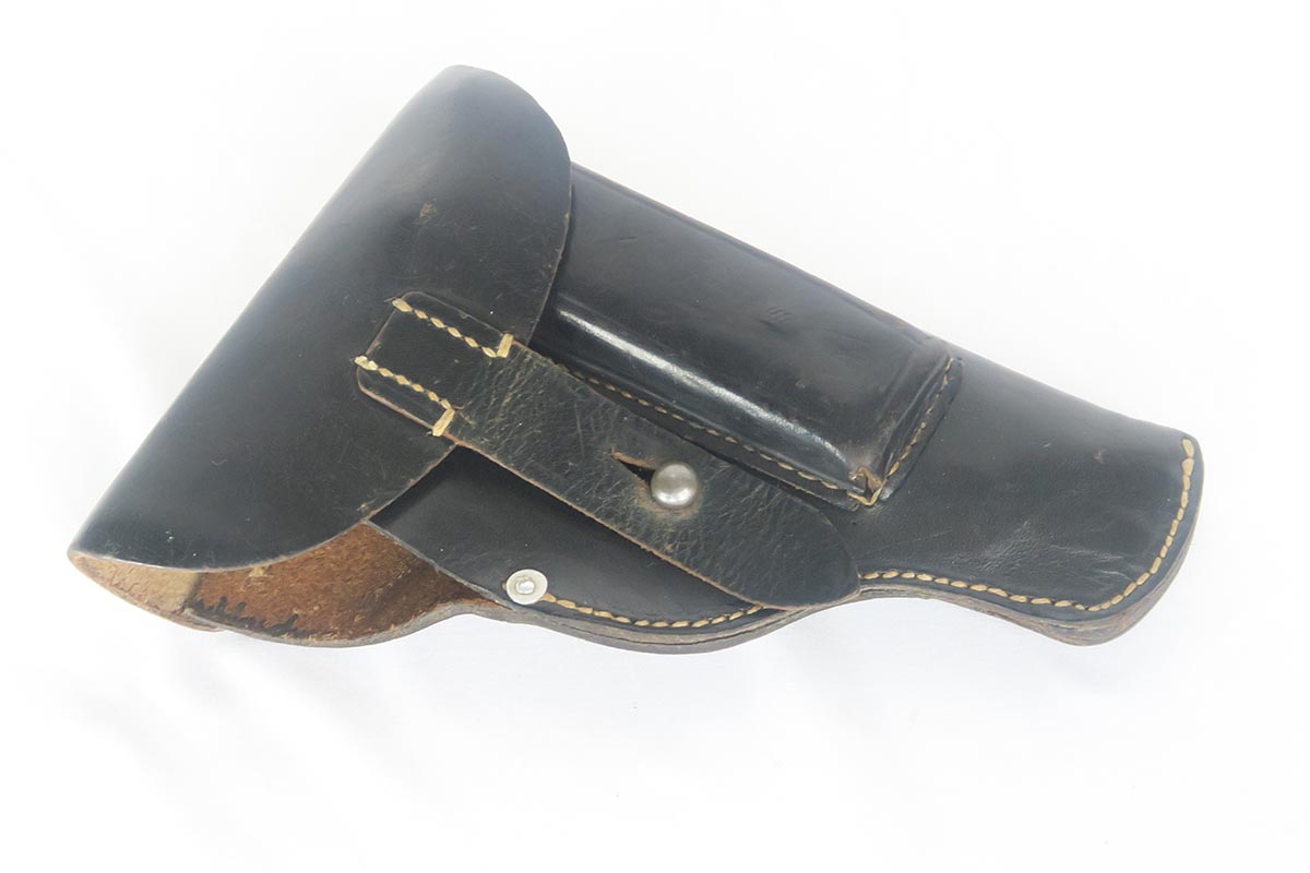 2/1/18 – This is an early, high-polish Sauer 38h rig with police proof on the left side frame. The pistol comes with an excellent 1941 Berlin holster and two total early-style magazines. The high-polish blue of the pistol is original and rates at 97% with minor edge wear and a spot of finish loss on the back of the slide. Excellent grips and a mirror bore. Mechanically sound, including the decocker.