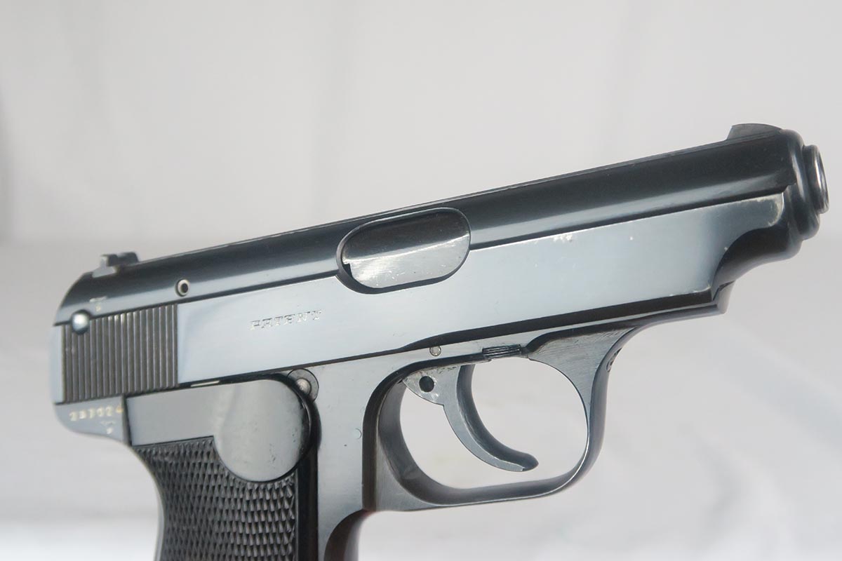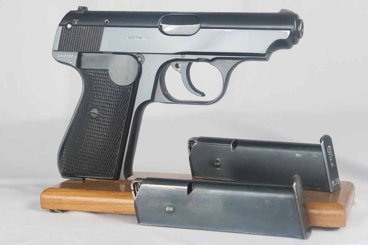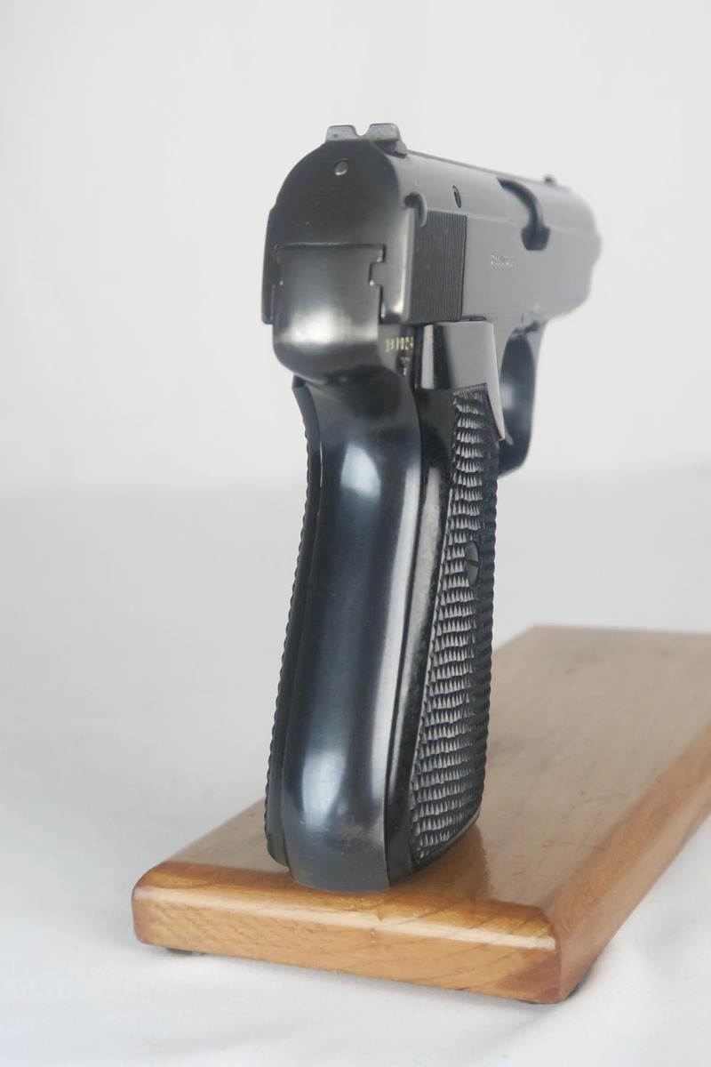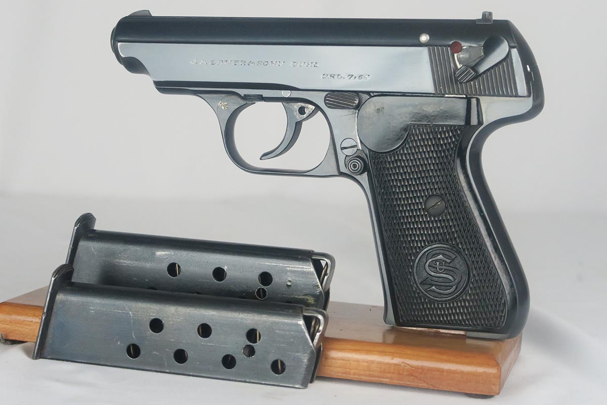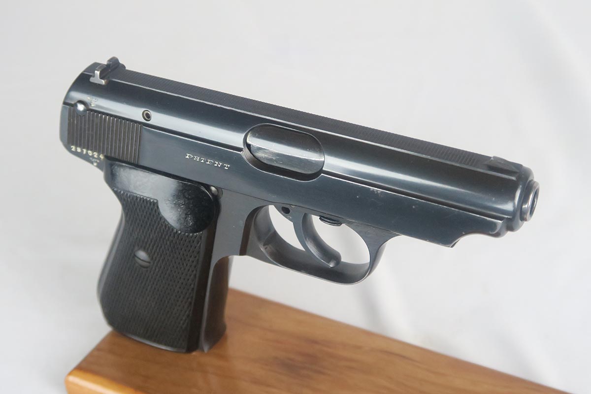 2/1/18 – This is an early, high-polish Sauer 38h rig with police proof on the left side frame. The pistol comes with an excellent 1941 Berlin holster and two total early-style magazines. The high-polish blue of the pistol is original and rates at 97% with minor edge wear and a spot of finish loss on the back of the slide. Excellent grips and a mirror bore. Mechanically sound, including the decocker.