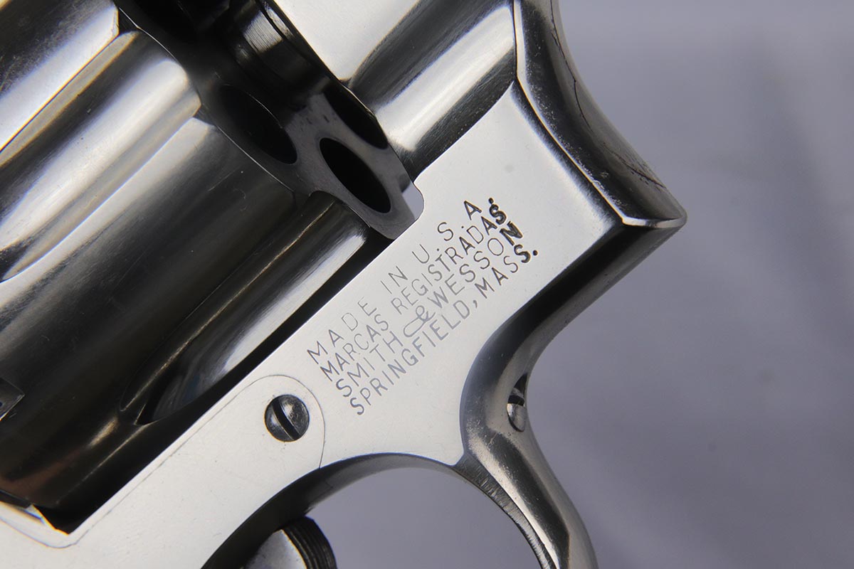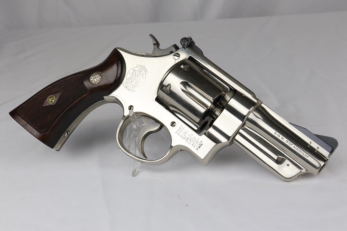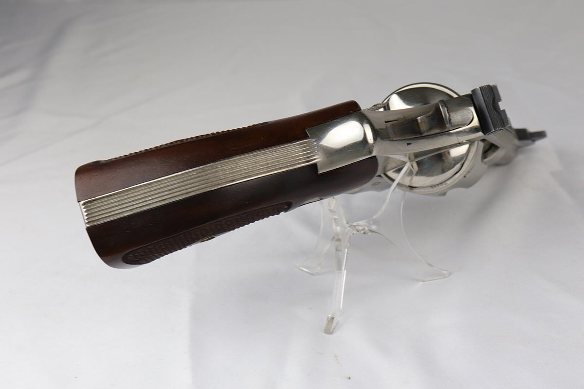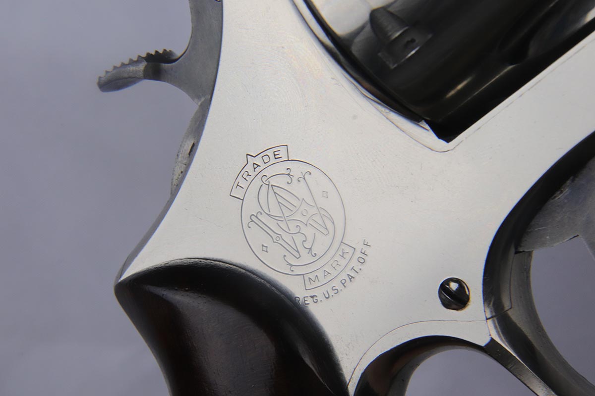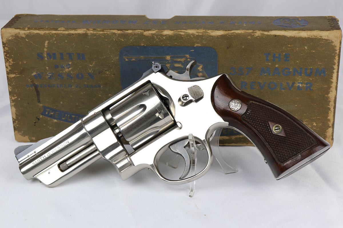 10/7/24 – This is a very scarce, original nickel finish Smith & Wesson Pre-27 revolver made in the late 1940s, and is probably a second year production gun.  It was made right after the war when S&W restarted production of .357 magnums as “Pre-27” model.  A very small percentage of the early guns were made both with very desirable 3.5 inch barrels and nickel finish. This revolver is in excellent original condition, with nearly all of the nickel finish present, with just a light cylinder ring. The sights are correctly blued and the cylinder and frame are marked with letter N, denoting the nickel finish. The frame, cylinder and barrel all match. The bore is mint. The grip are correct “high horn” early diamond magnas. The box is original to the gun and shows wear appropriate for the 70 year old gun, but is all original and is numbered faintly on the bottom with the full serial.  This stunning boxed set is worthy of any advanced S&W collection!
