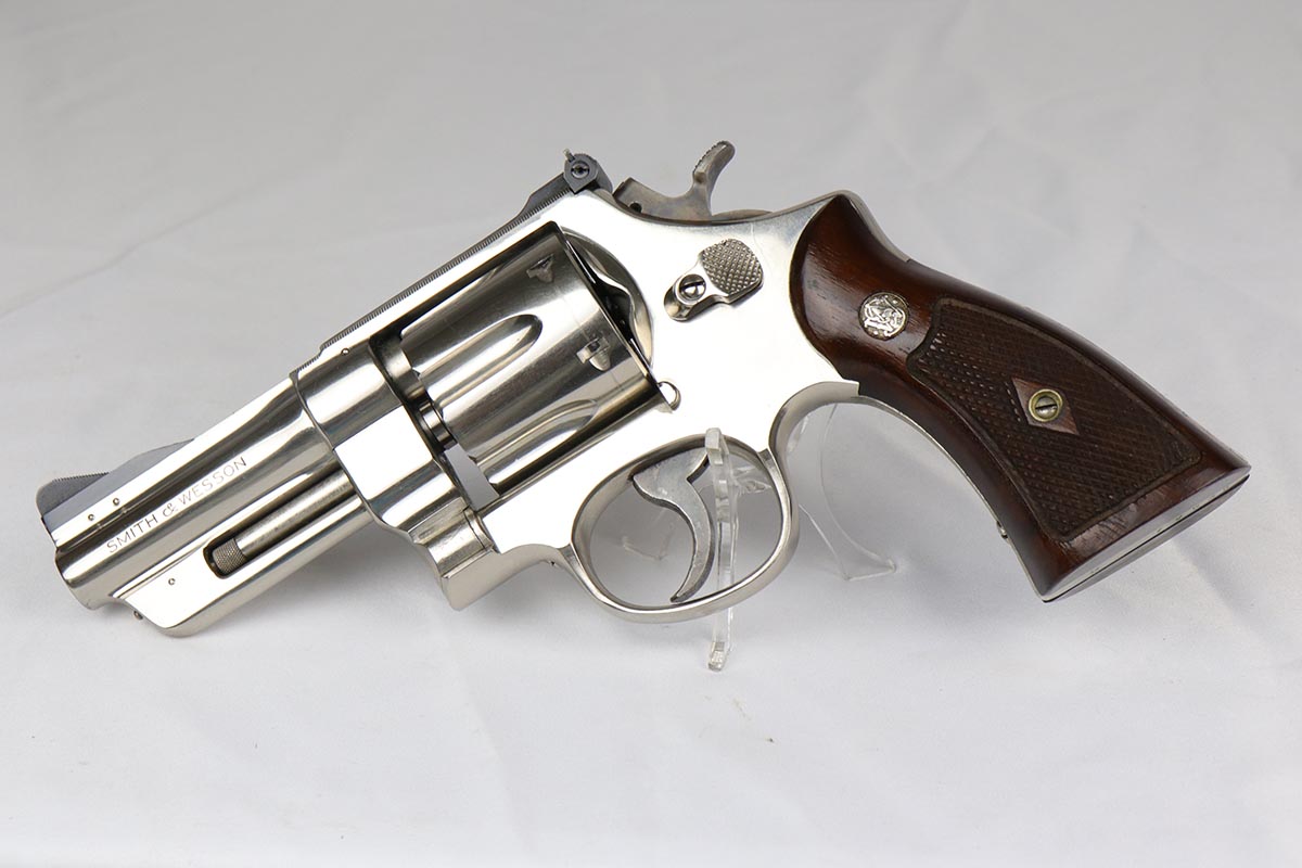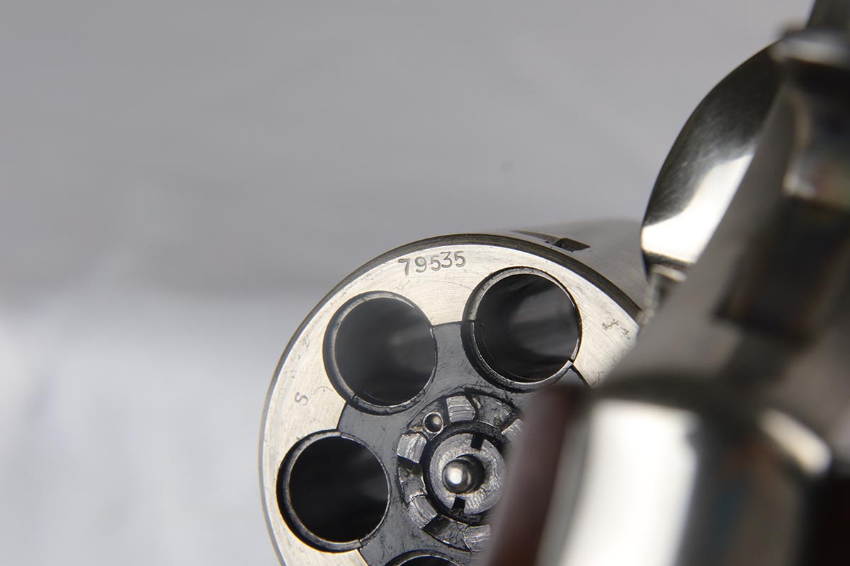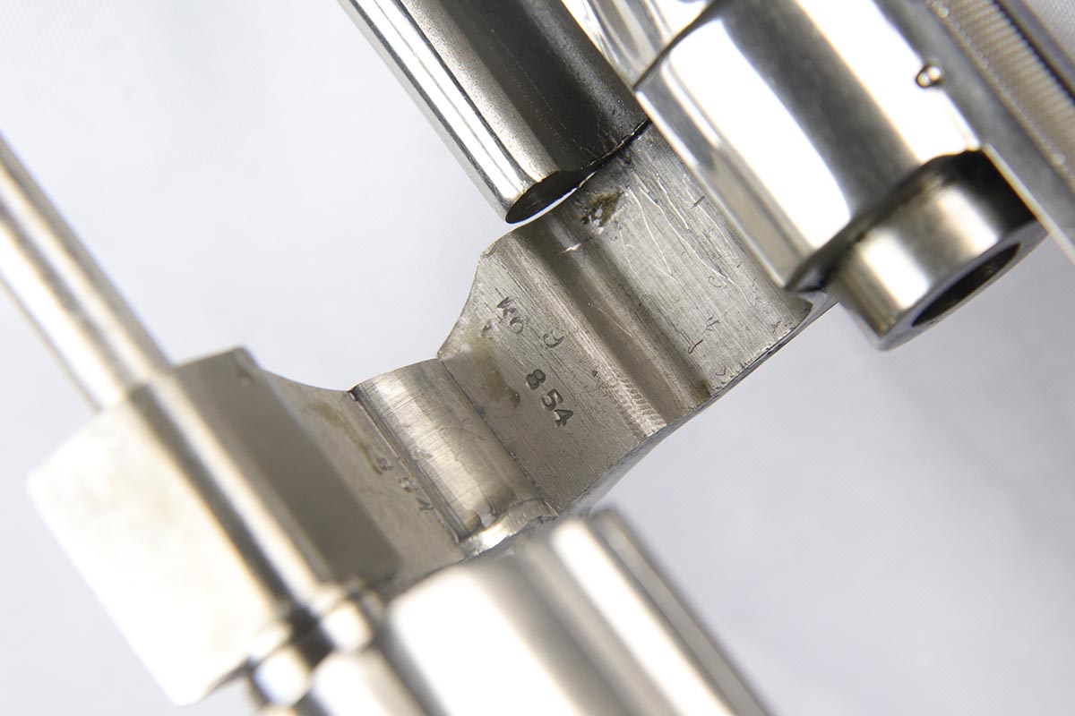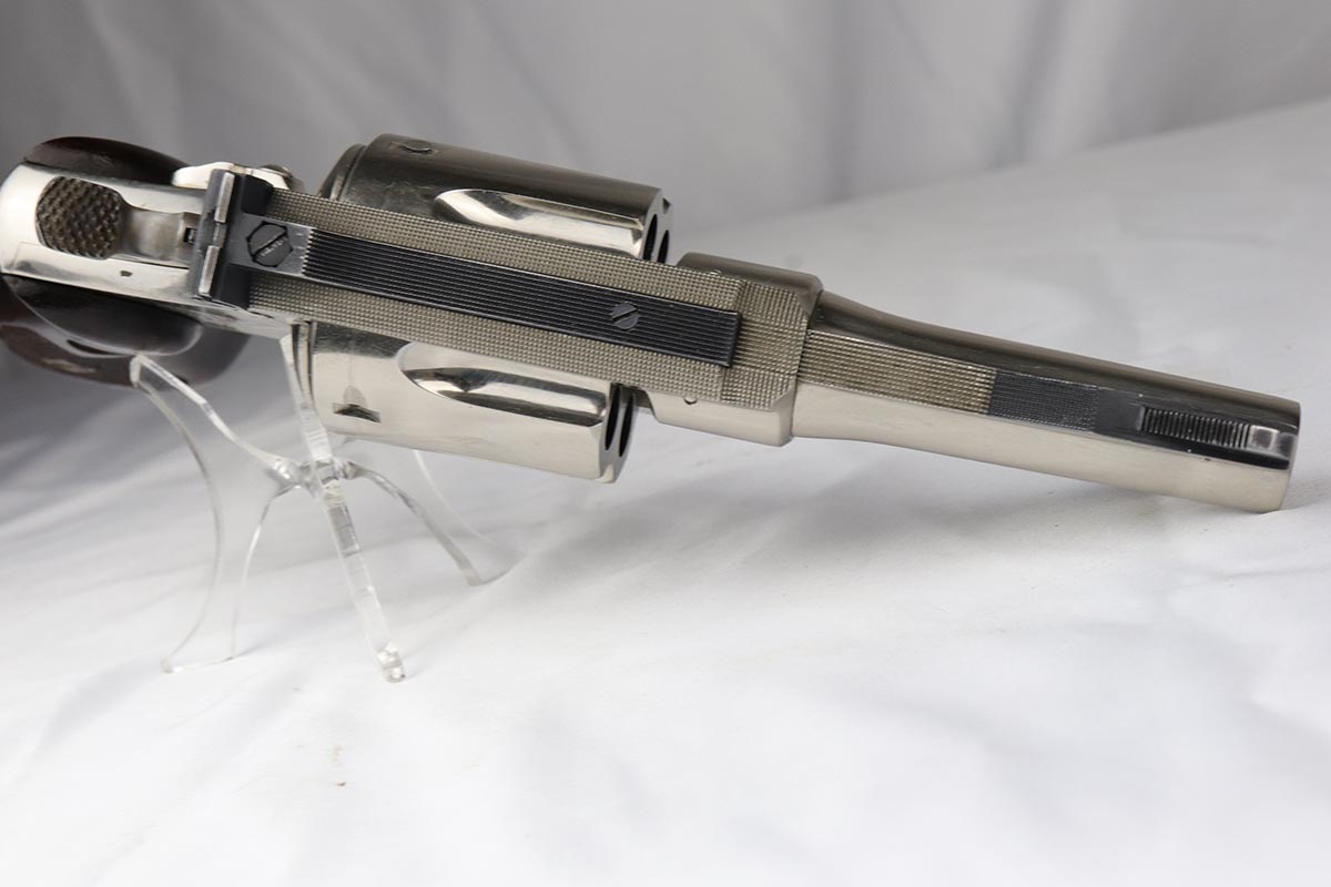 10/7/24 – This is a very scarce, original nickel finish Smith & Wesson Pre-27 revolver made in the late 1940s, and is probably a second year production gun.  It was made right after the war when S&W restarted production of .357 magnums as “Pre-27” model.  A very small percentage of the early guns were made both with very desirable 3.5 inch barrels and nickel finish. This revolver is in excellent original condition, with nearly all of the nickel finish present, with just a light cylinder ring. The sights are correctly blued and the cylinder and frame are marked with letter N, denoting the nickel finish. The frame, cylinder and barrel all match. The bore is mint. The grip are correct “high horn” early diamond magnas. The box is original to the gun and shows wear appropriate for the 70 year old gun, but is all original and is numbered faintly on the bottom with the full serial.  This stunning boxed set is worthy of any advanced S&W collection!