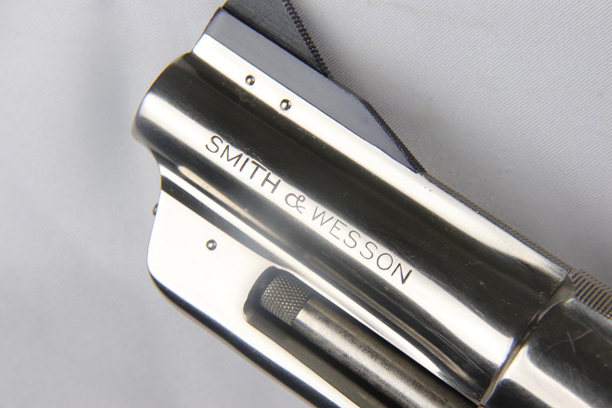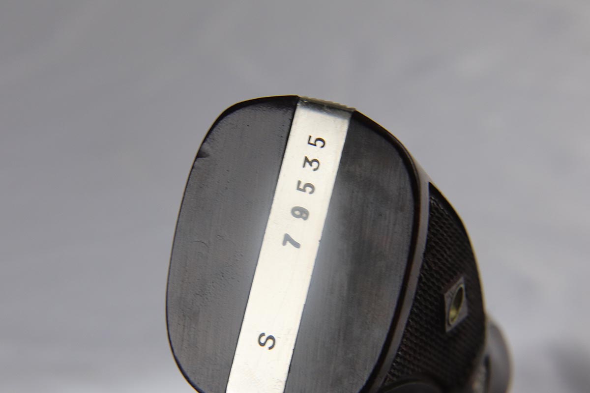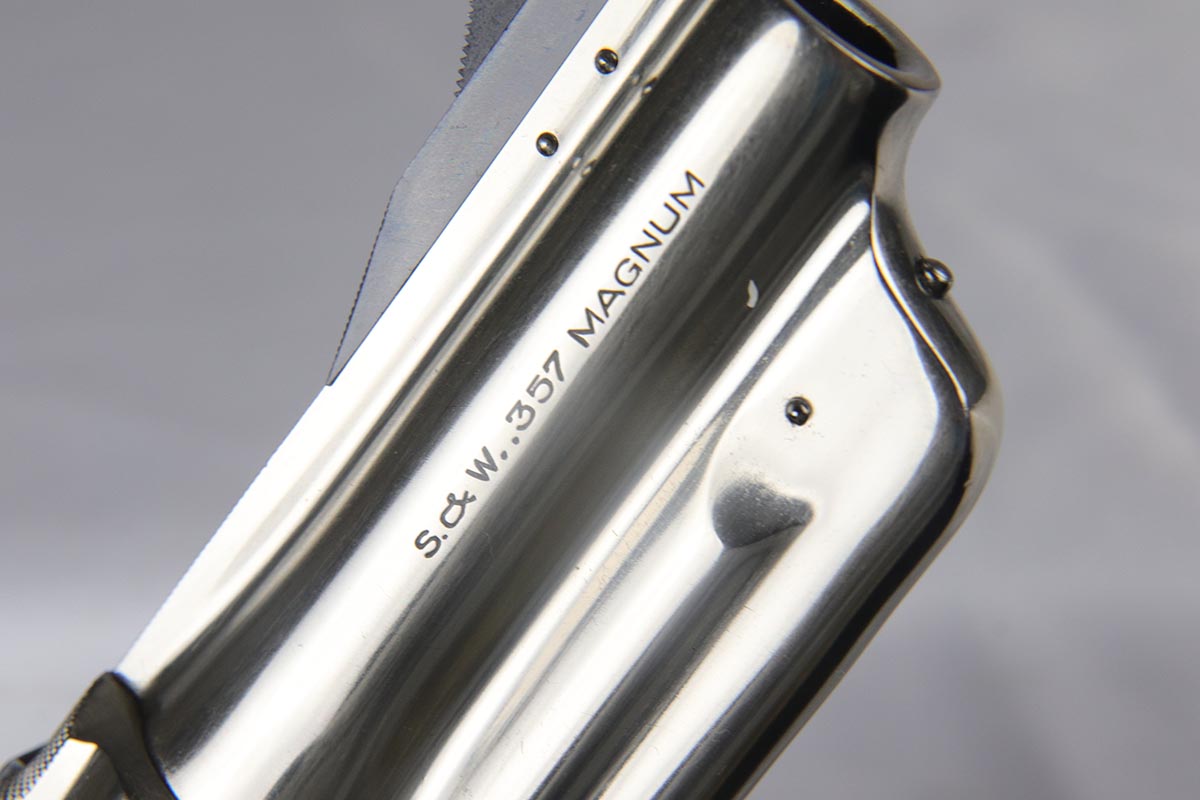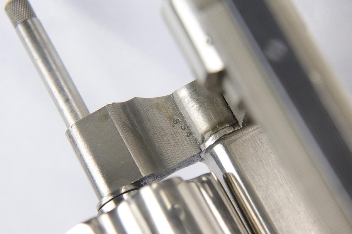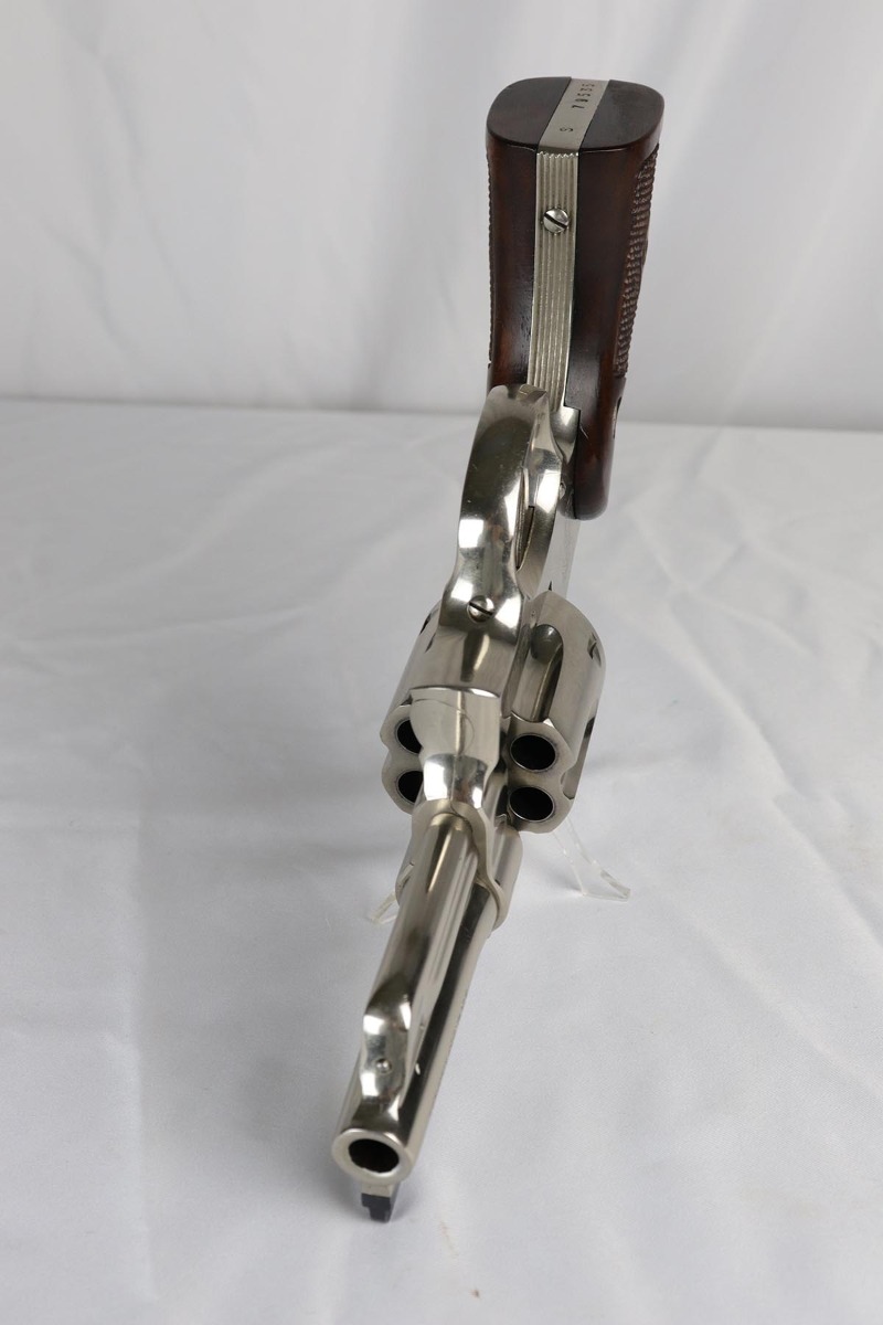 10/7/24 – This is a very scarce, original nickel finish Smith & Wesson Pre-27 revolver made in the late 1940s, and is probably a second year production gun.  It was made right after the war when S&W restarted production of .357 magnums as “Pre-27” model.  A very small percentage of the early guns were made both with very desirable 3.5 inch barrels and nickel finish. This revolver is in excellent original condition, with nearly all of the nickel finish present, with just a light cylinder ring. The sights are correctly blued and the cylinder and frame are marked with letter N, denoting the nickel finish. The frame, cylinder and barrel all match. The bore is mint. The grip are correct “high horn” early diamond magnas. The box is original to the gun and shows wear appropriate for the 70 year old gun, but is all original and is numbered faintly on the bottom with the full serial.  This stunning boxed set is worthy of any advanced S&W collection!