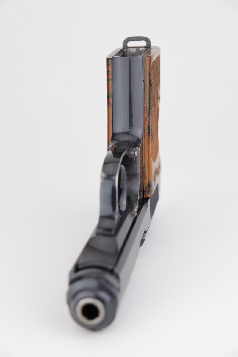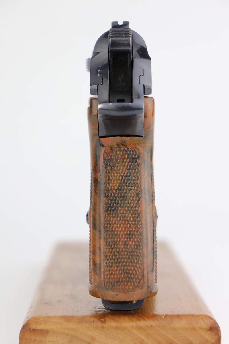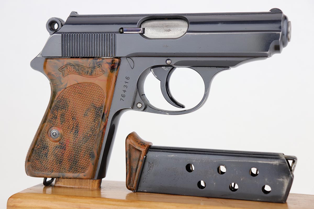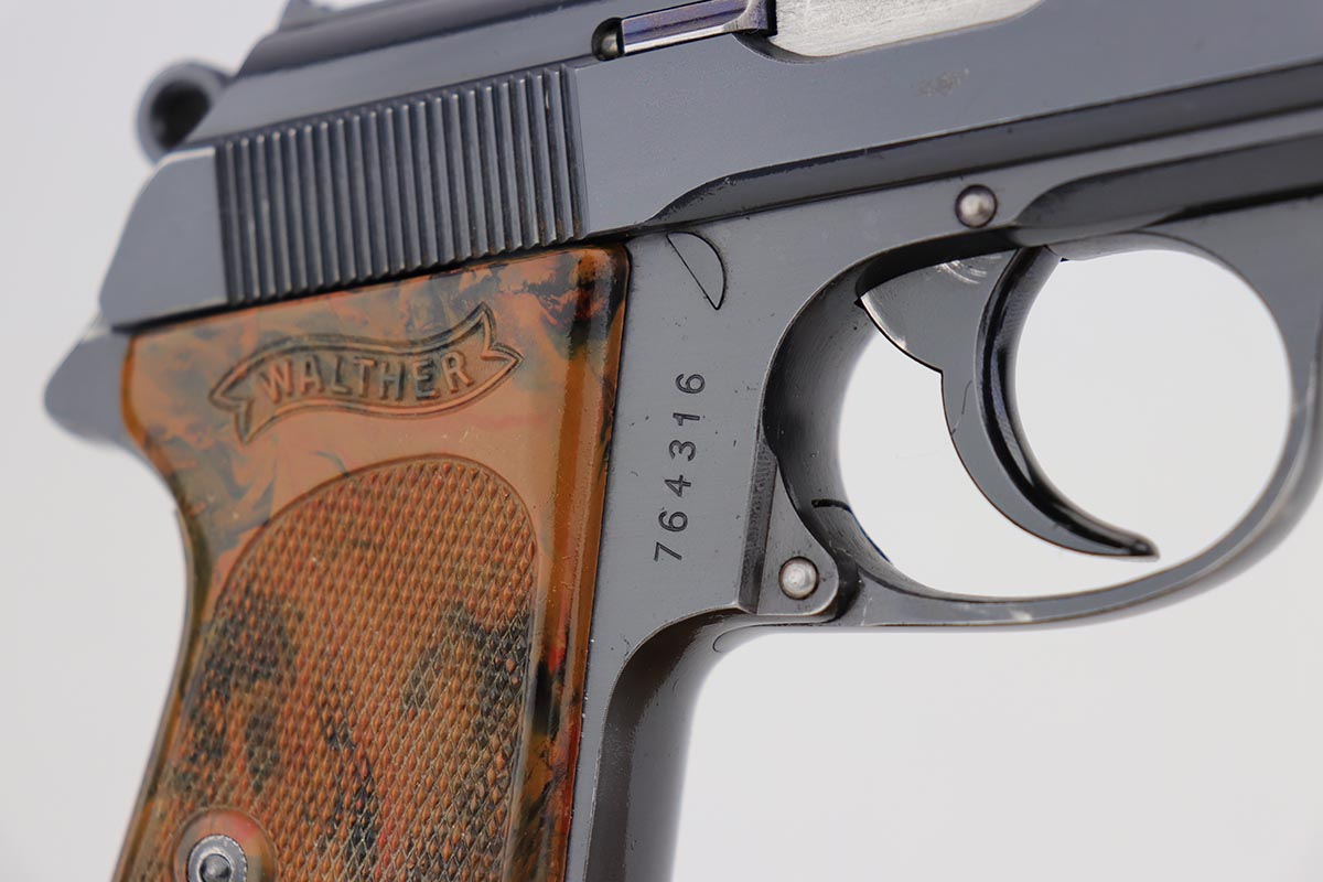 8/9/19 – This is very nice commercial PPK, made probably in the first year of production in 1932. The gun is all original, retaining about 97-98% of its high polished blue with just minimal high edge wear and a spot of finish loss on the trigger guard. Mint bore and beautifully mottled grips without defects. Also comes with its original finger extension “banner only” magazine with no defects.