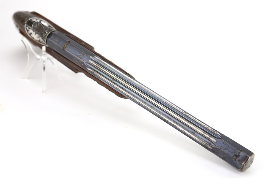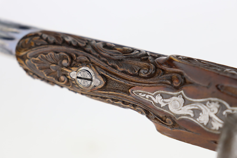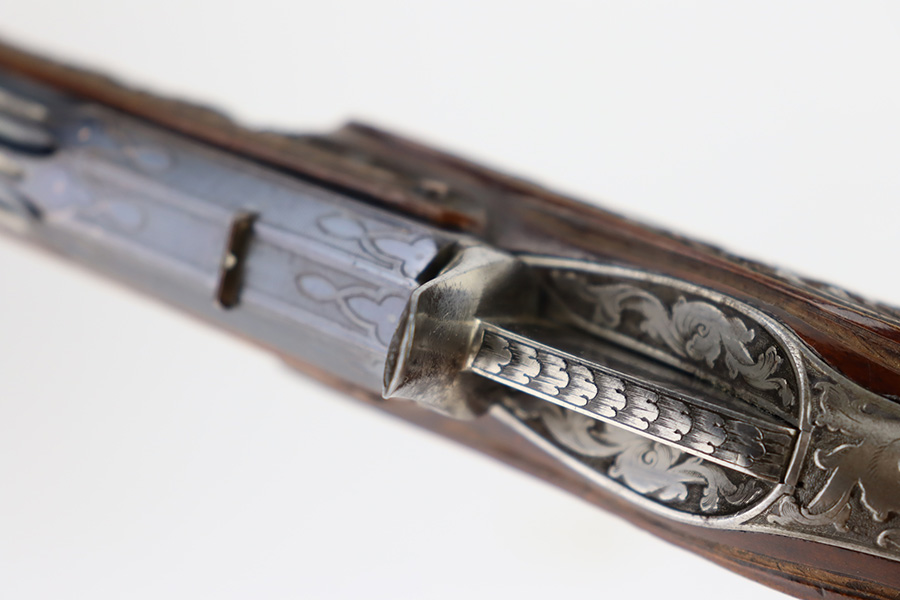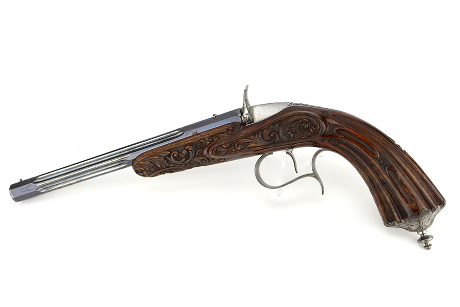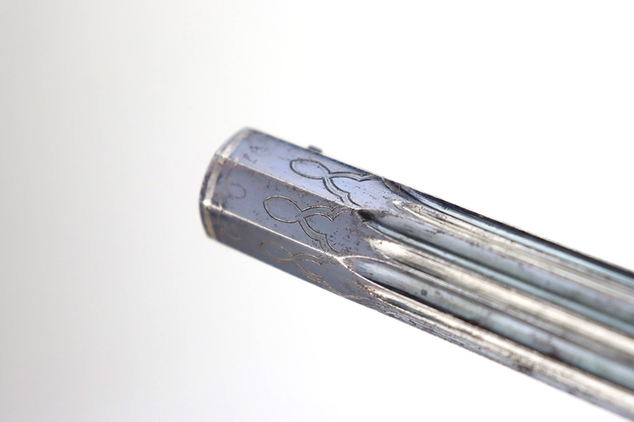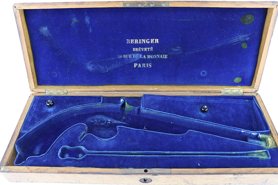 2/2/24 – This is a beautiful, engraved French single shot pistol, chambered in .22 Caliber and manufactured in the 19th century. We weren’t able to find much information on it, but the entire gun features a beautiful floral filigree engraving pattern, even on the wood. It is very intricate, deep, and clean. The barrel has really nice fluting. The remaining bluing is on the barrel. Seems to be no finish on the butt, trigger guard, or tangs. The wood is beautiful. It comes with a really nice blue velvet-lined wood presentation case and a cleaning rod. The inside of the case reads “Beringer Brevete 26 Rue De La Monnaie Paris”. The bore is generally shiny with strong rifling with a few small pits around the middle. Fully functional. No FFL required.