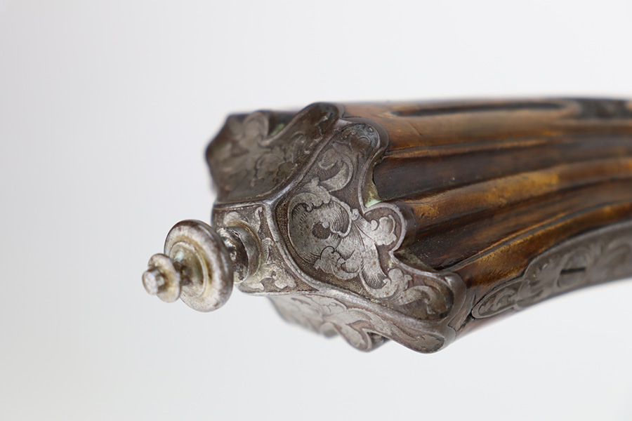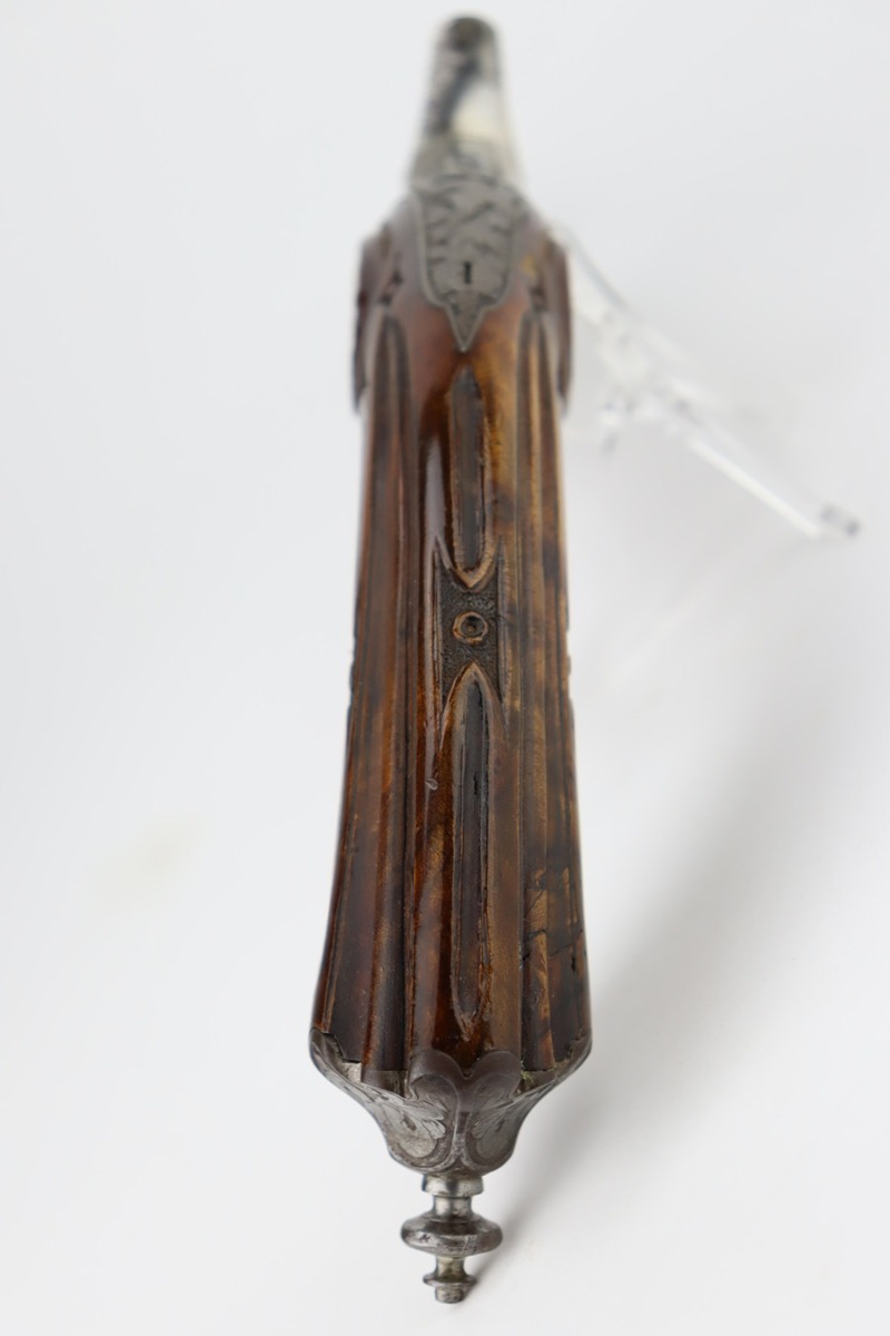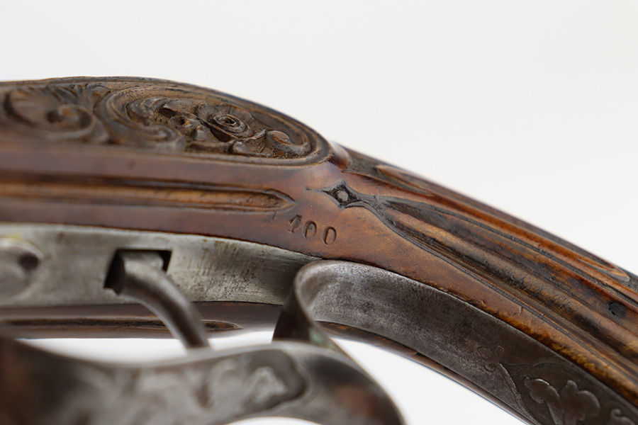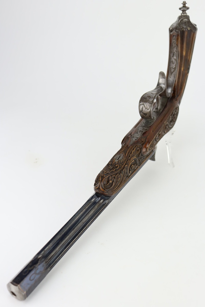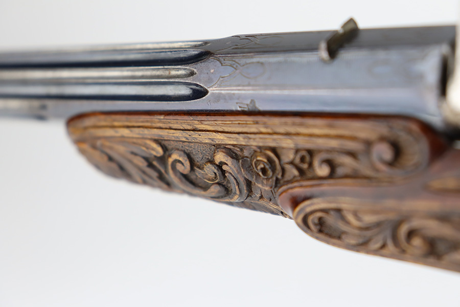 2/2/24 – This is a beautiful, engraved French single shot pistol, chambered in .22 Caliber and manufactured in the 19th century. We weren’t able to find much information on it, but the entire gun features a beautiful floral filigree engraving pattern, even on the wood. It is very intricate, deep, and clean. The barrel has really nice fluting. The remaining bluing is on the barrel. Seems to be no finish on the butt, trigger guard, or tangs. The wood is beautiful. It comes with a really nice blue velvet-lined wood presentation case and a cleaning rod. The inside of the case reads “Beringer Brevete 26 Rue De La Monnaie Paris”. The bore is generally shiny with strong rifling with a few small pits around the middle. Fully functional. No FFL required.