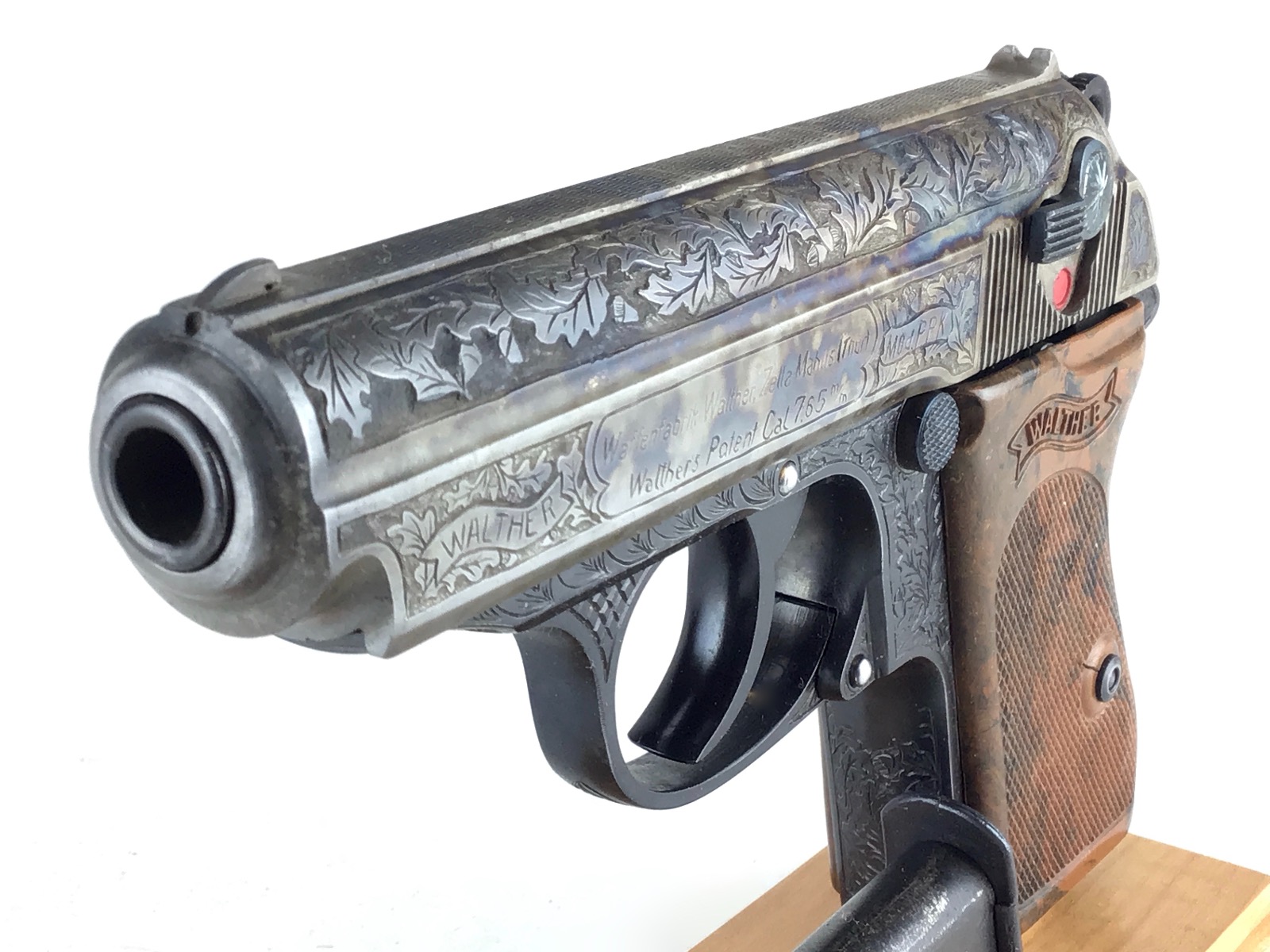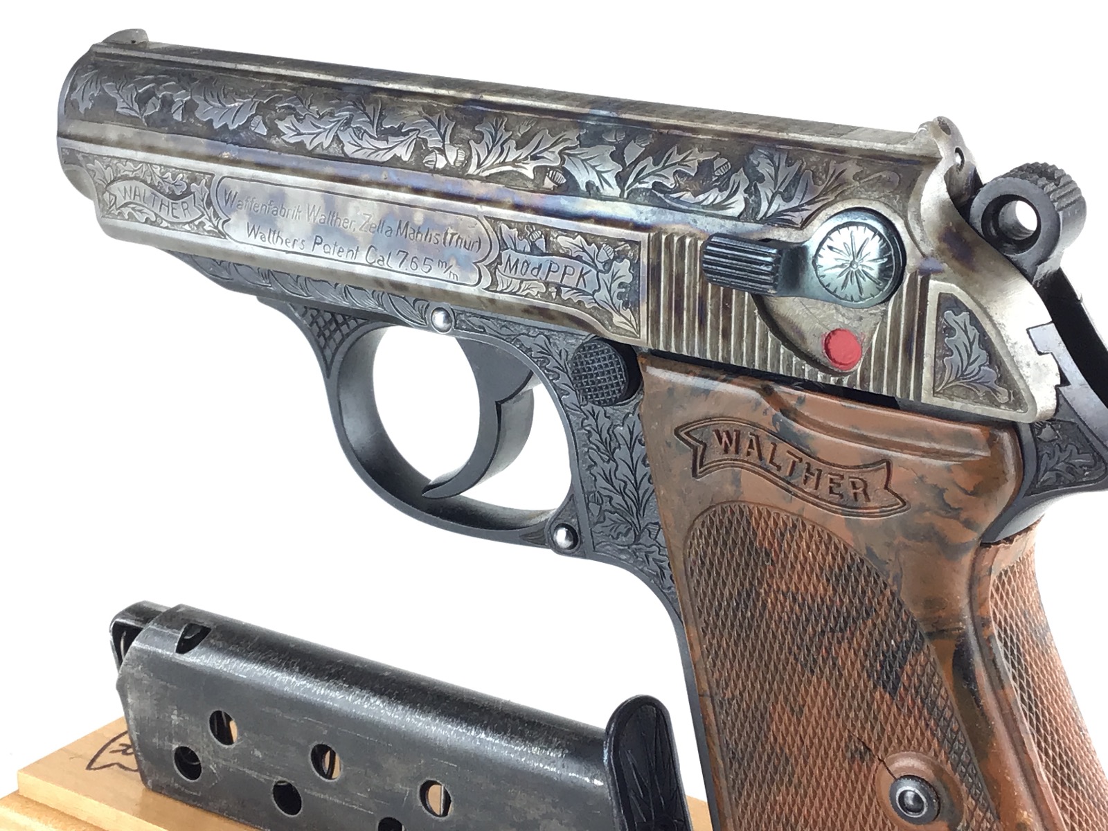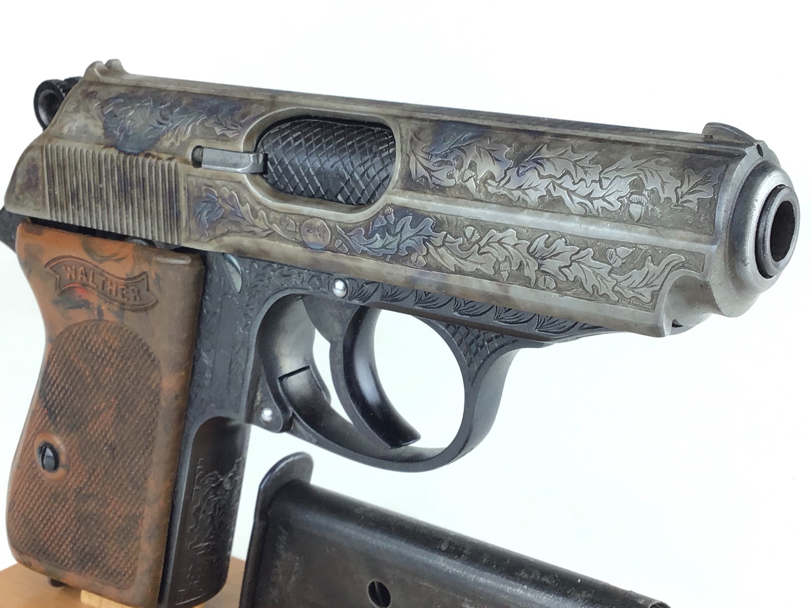 6/8/20 – Beautifully engraved, one of a kind Walther PPK. deep relief engraving following original germanic style of oak leaf and acorn. The piece has a unique color cased slide. Frame is rust blued. Safety, mag release and magazine base are fire blued. Mirror bore. Fully functional. Stand not included.