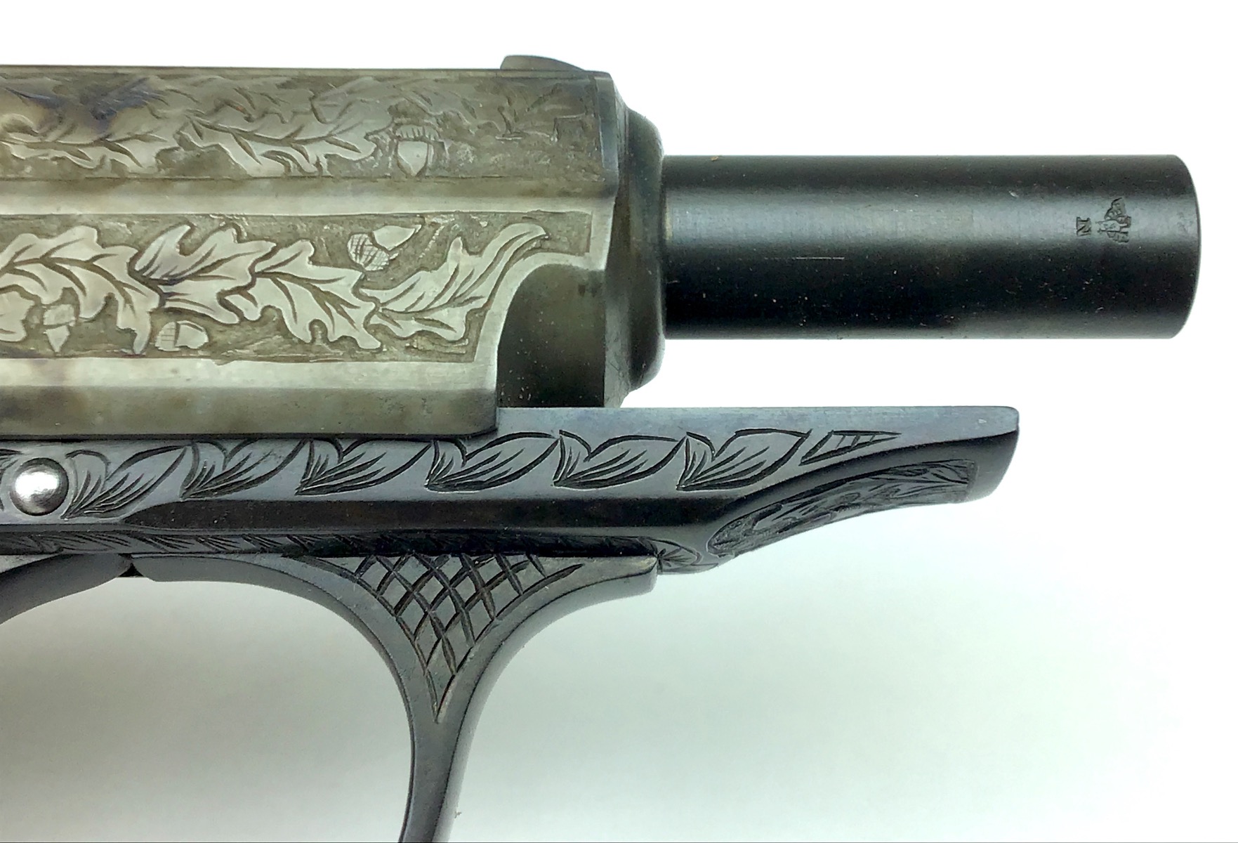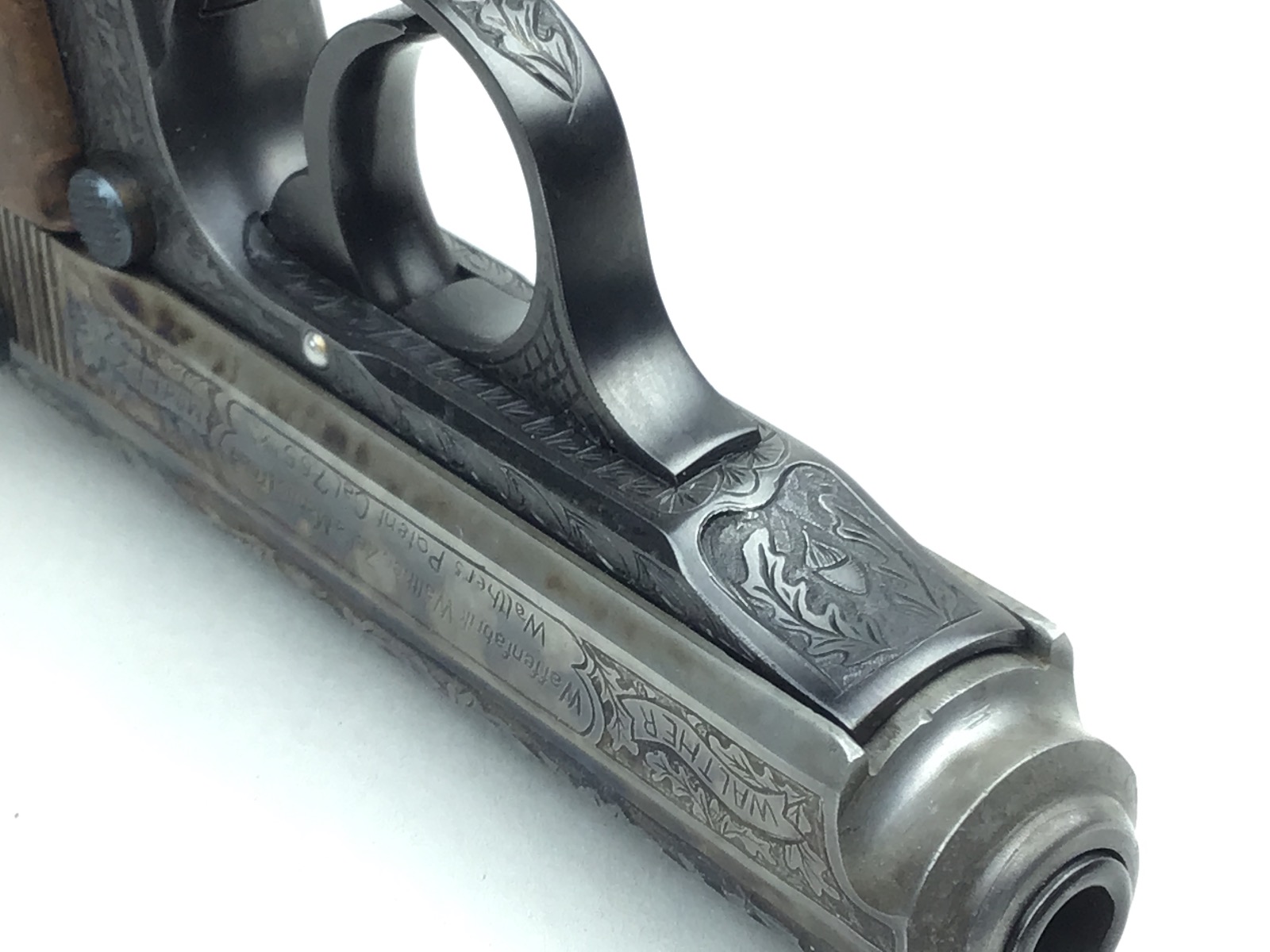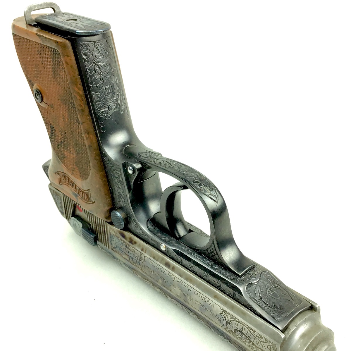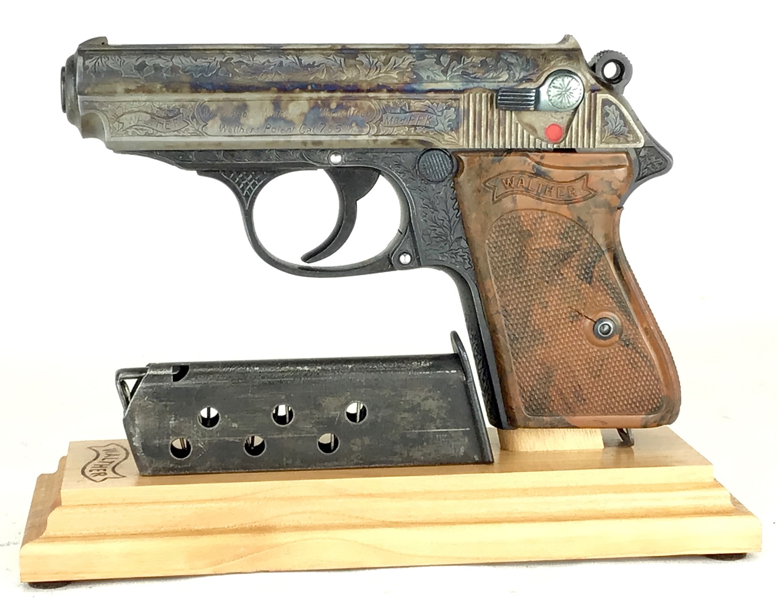 6/8/20 – Beautifully engraved, one of a kind Walther PPK. deep relief engraving following original germanic style of oak leaf and acorn. The piece has a unique color cased slide. Frame is rust blued. Safety, mag release and magazine base are fire blued. Mirror bore. Fully functional. Stand not included.