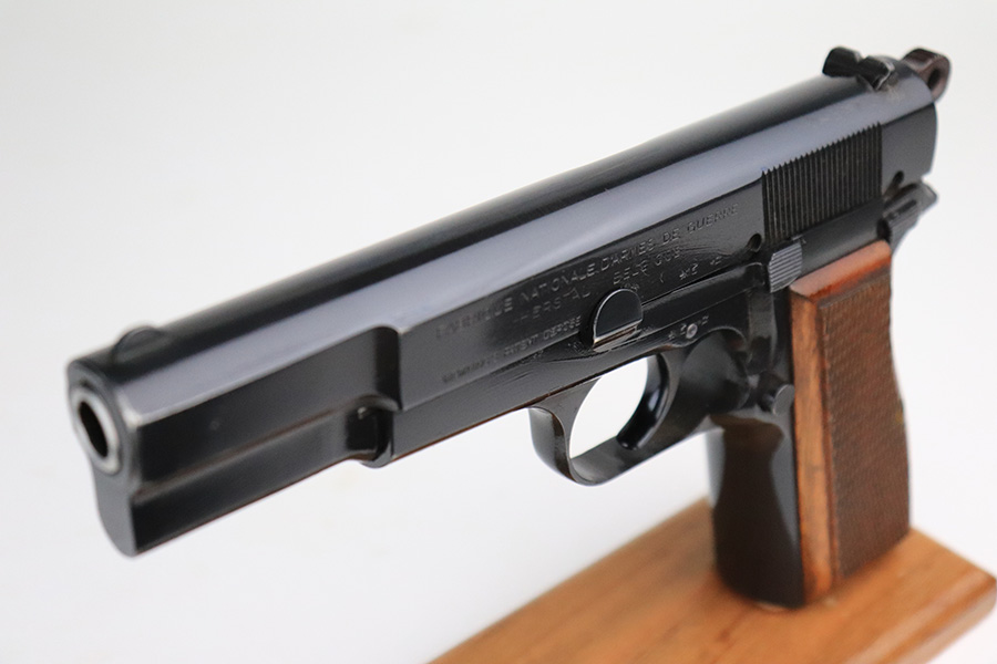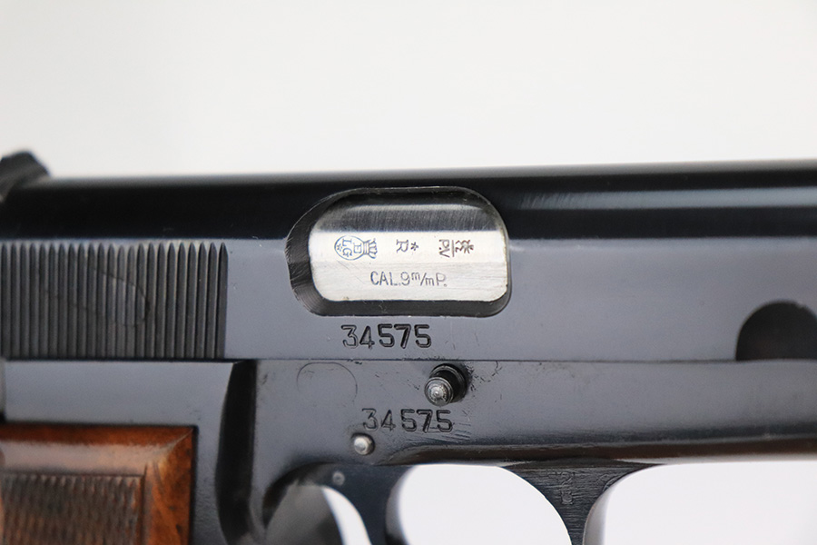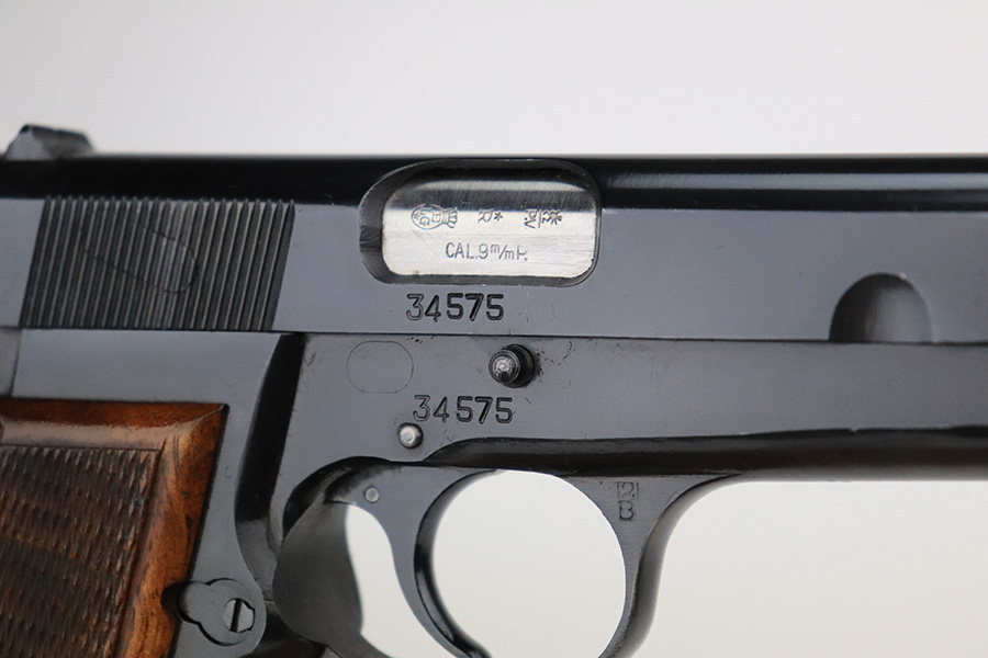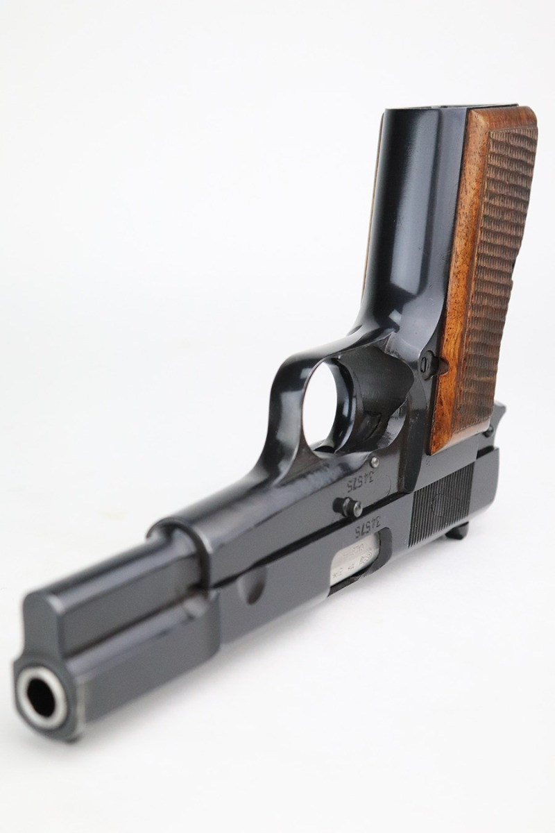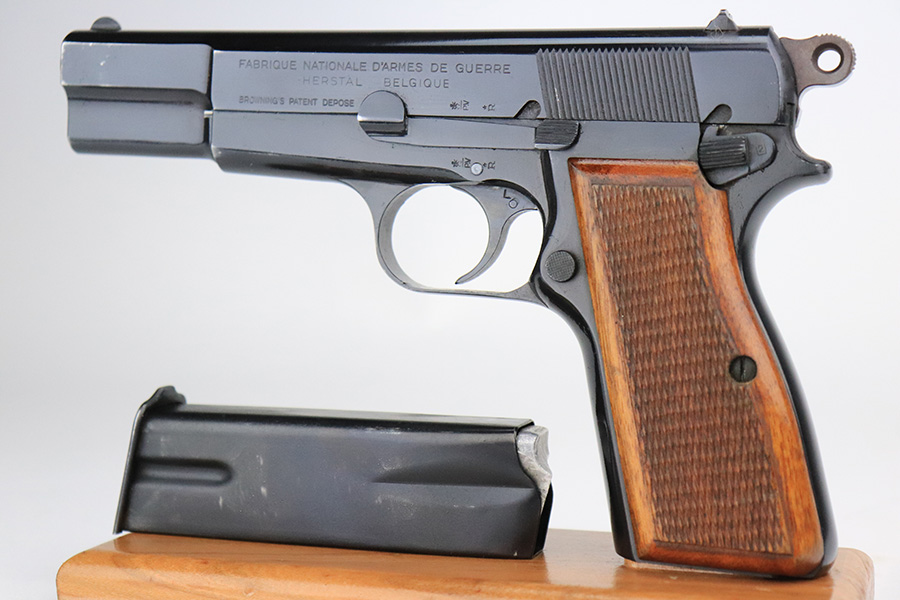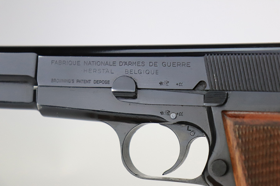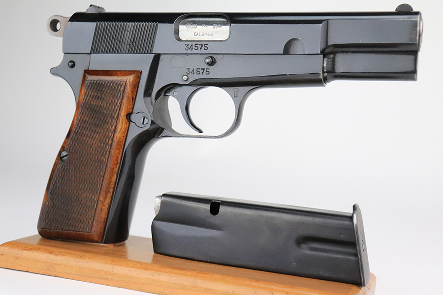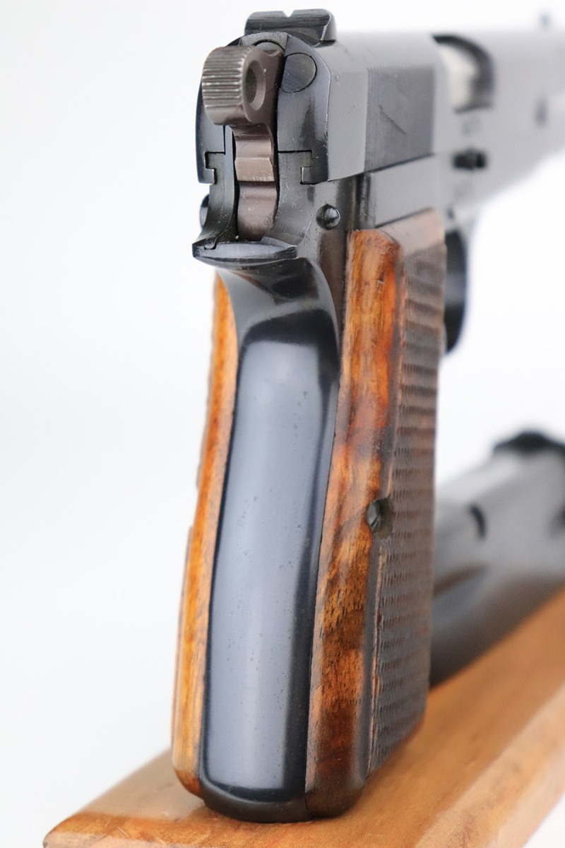 7/26/22 – This is a beautiful example of a Post-WW2 Belgian FN Browning Hi Power. It is all matching and has the proper Belgian proofs throughout. It has retained virtually all of its bluing with just the slightest hints of wear on some of the high edges and a few tiny handling marks here and there. Some very light freckling on the back strap. Comes with minty wood grips and one proper magazine that is electro-numbered to match the gun. The bore is like-new.