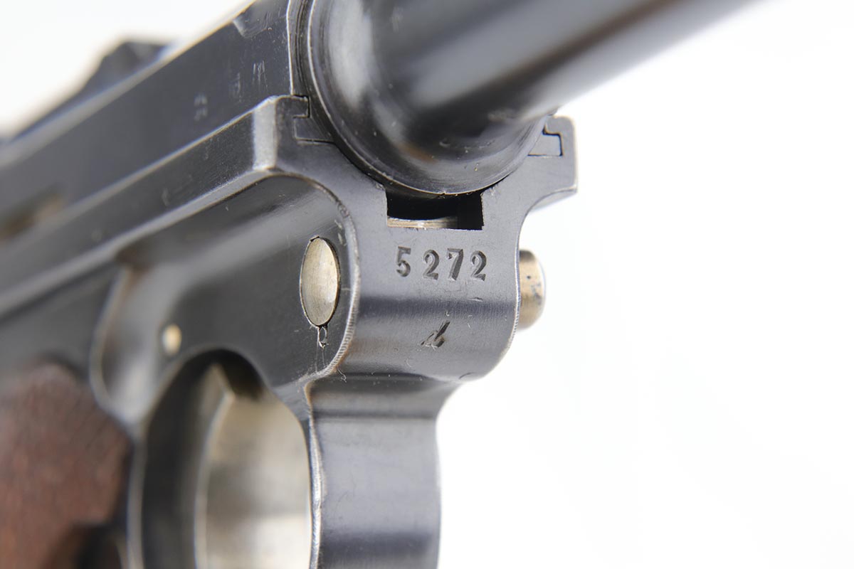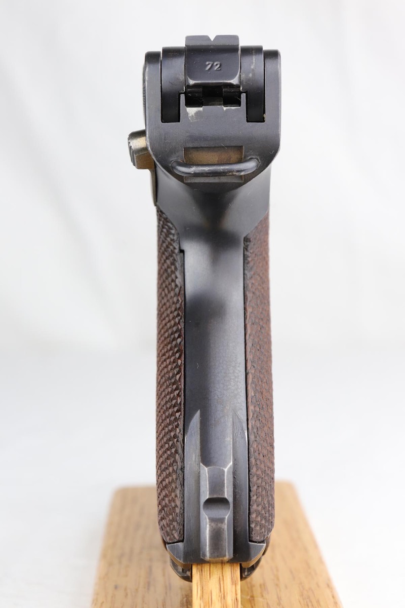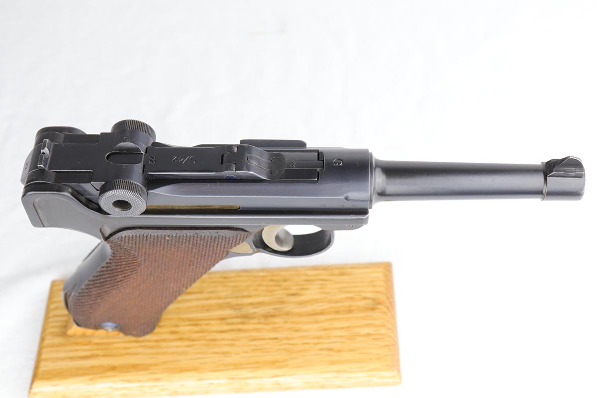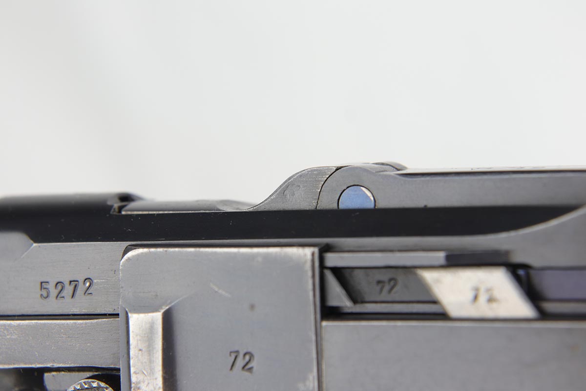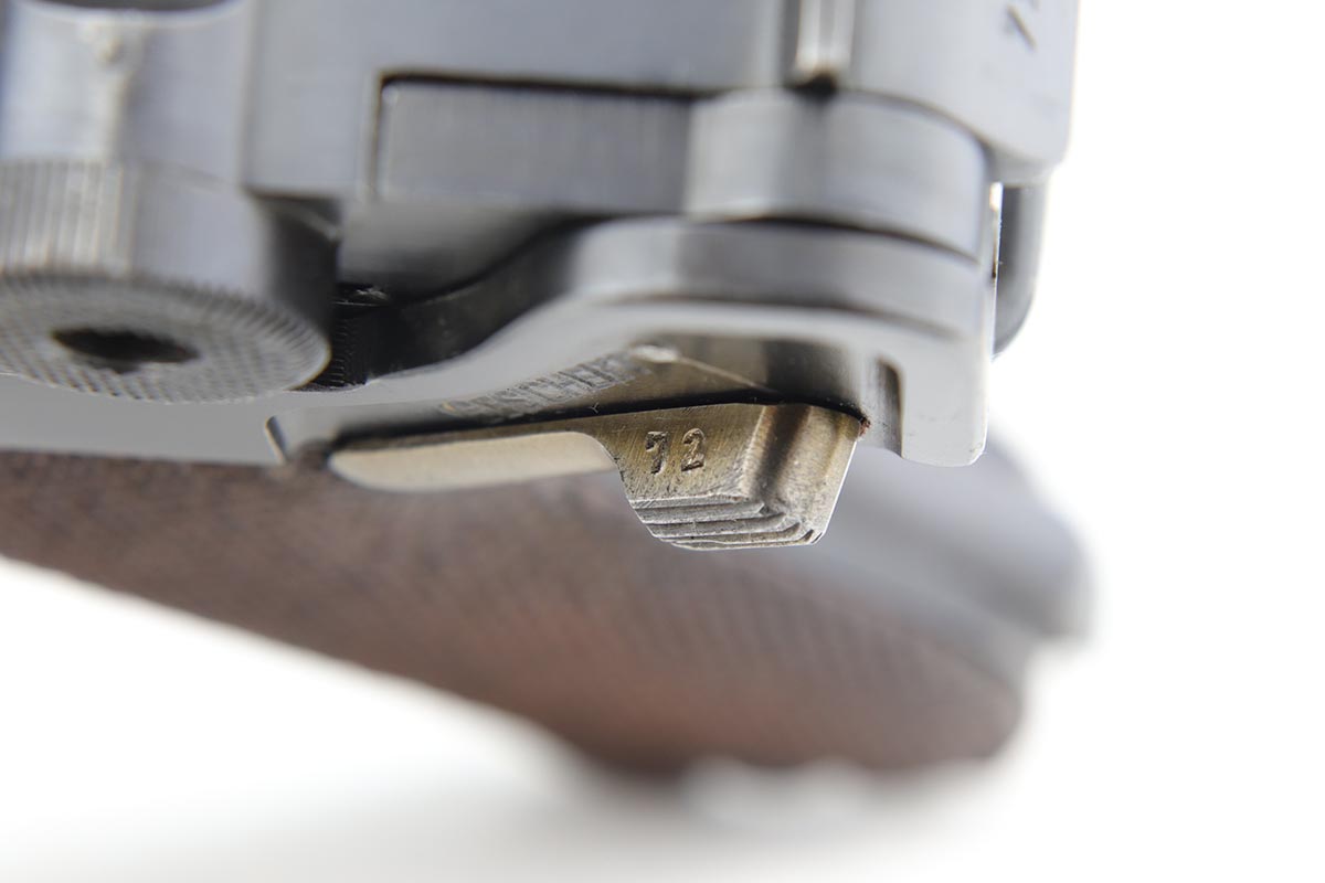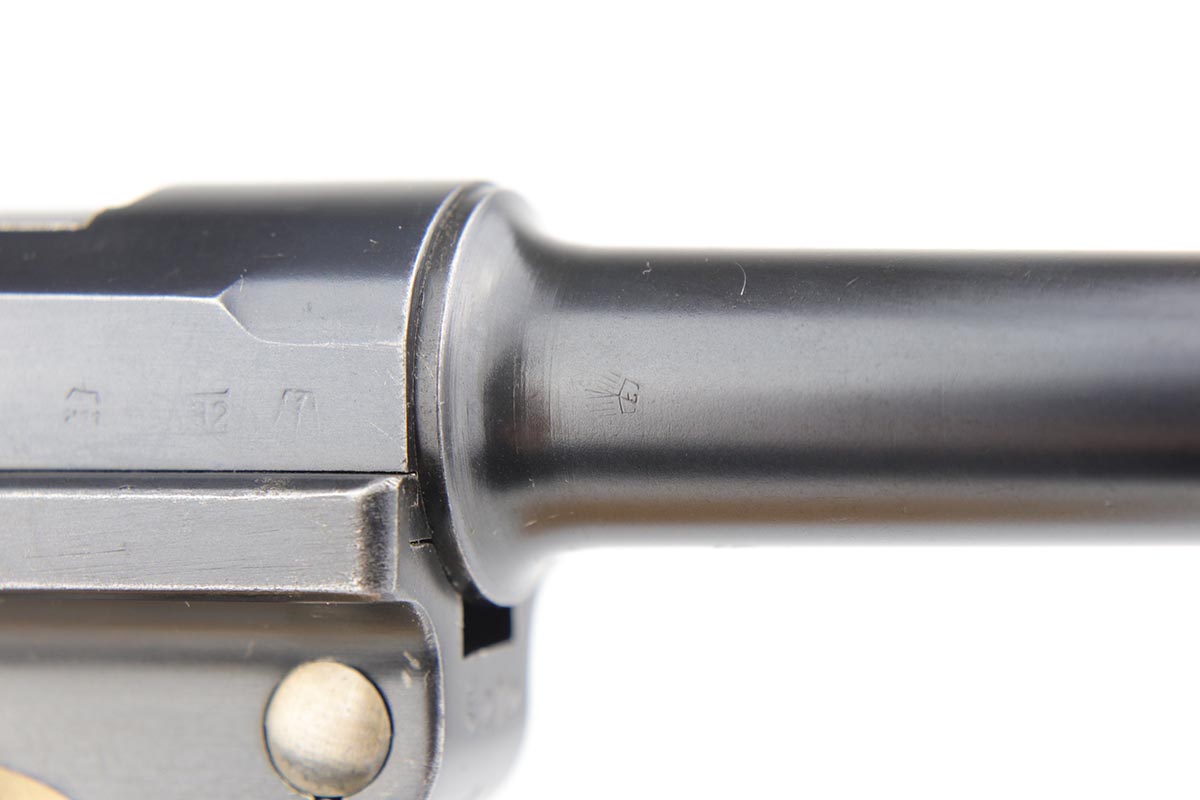 1/14/19 – This is an all matching and original Nazi Mauser Luger from 1935, with the designated ‘G Date’ code over the chamber. The grips are properly unnumbered, and the gun has the highly desirable original magazine. Bluing rates at 95-96% with minor muzzle and sideplate wear, as well as some finish loss on the bottom of the front strap. The small parts show a decent amount of the original straw. The bore is beautiful and shiny. Sharp grips.