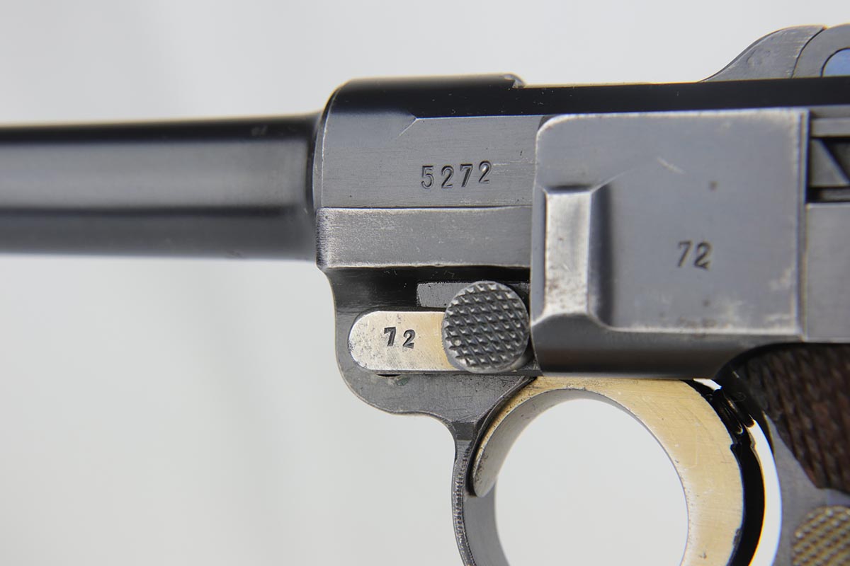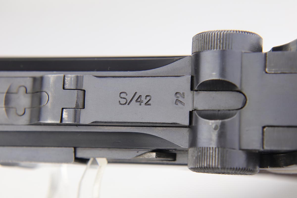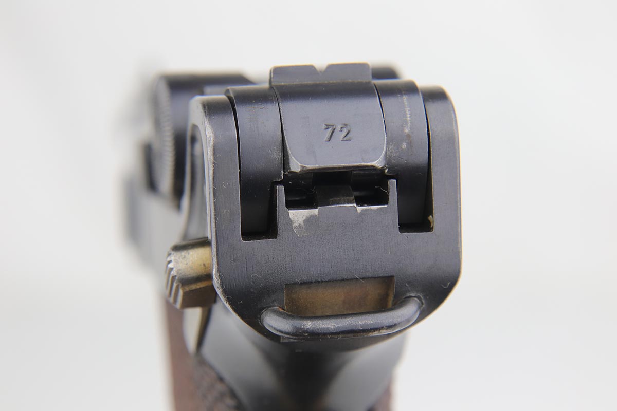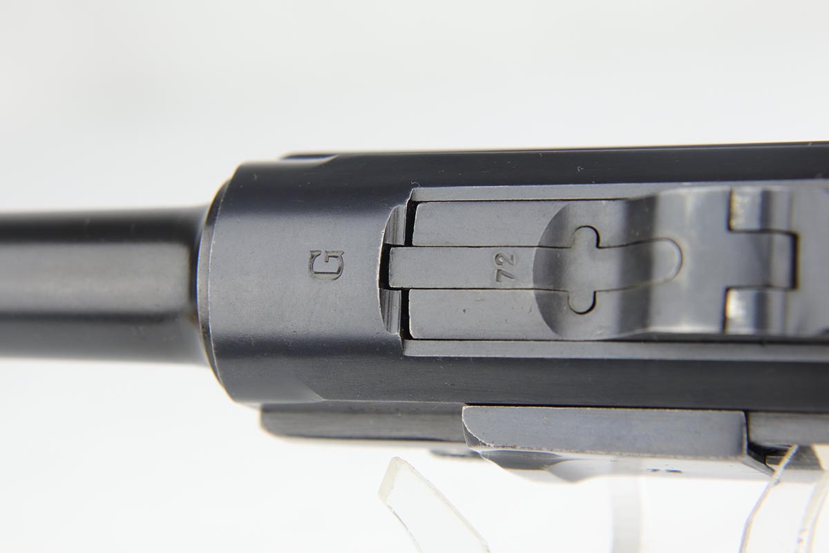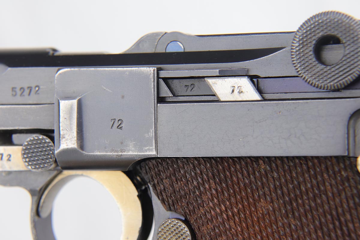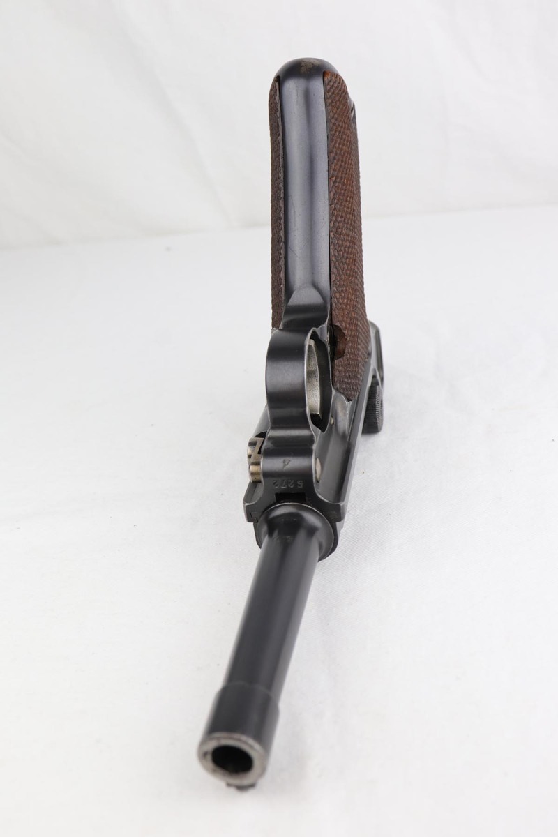 1/14/19 – This is an all matching and original Nazi Mauser Luger from 1935, with the designated ‘G Date’ code over the chamber. The grips are properly unnumbered, and the gun has the highly desirable original magazine. Bluing rates at 95-96% with minor muzzle and sideplate wear, as well as some finish loss on the bottom of the front strap. The small parts show a decent amount of the original straw. The bore is beautiful and shiny. Sharp grips.