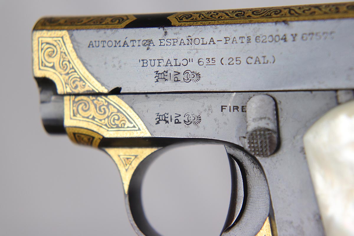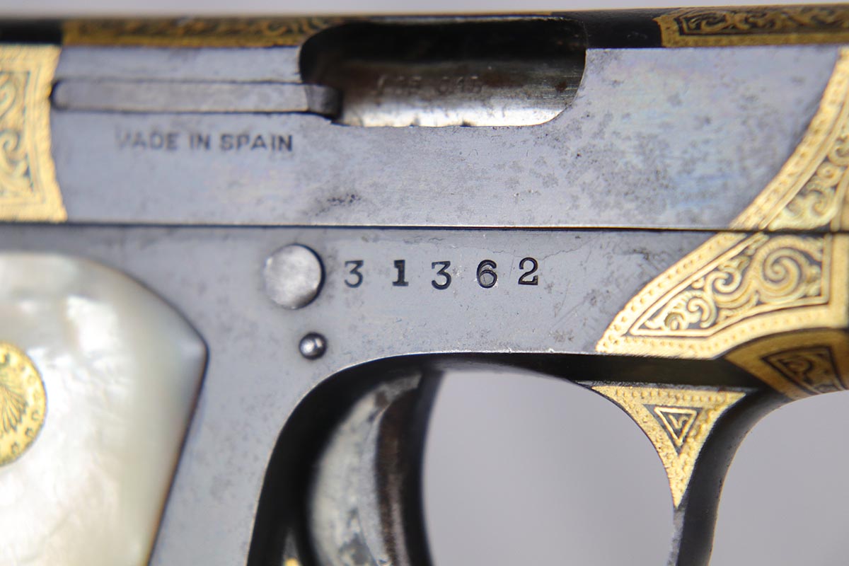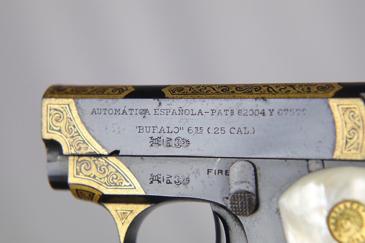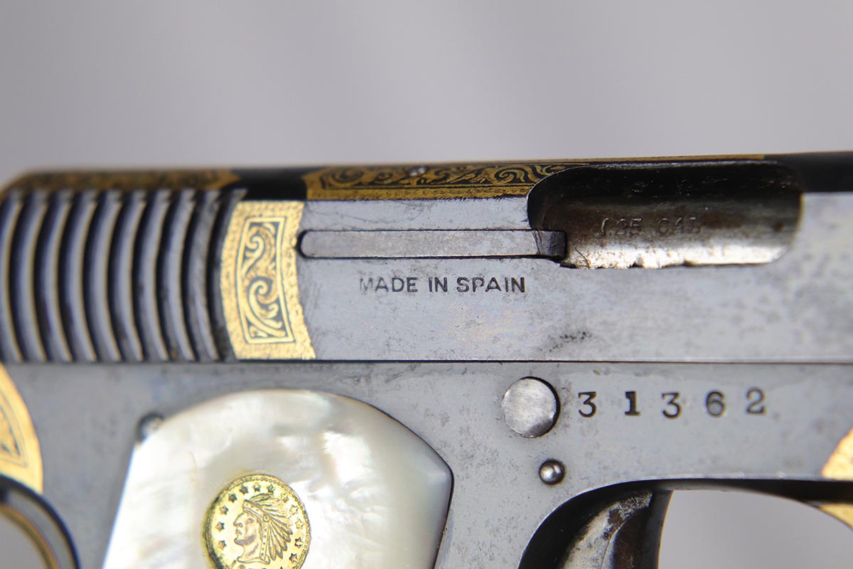 3/1/18 – This is an exquisite example of a pre-war Spanish Bufalo pocket pistol, chambered in .25 cal. It has about 40% coverage of very good quality Gold Damascening, which was essentially an engraving with gold foil pressed into the engraving lines in Cloisonné style. Very few were embellished in this fashion as the process was very labor intensive and pricey. The gun is in excellent original condition and has all of its damascening work intact with about 95% of original blue remaining. The grips are real MOP grips with “Indian Head Penny” medallions and are without defects. Bore has some corrosion in the grooves. A true piece of art!