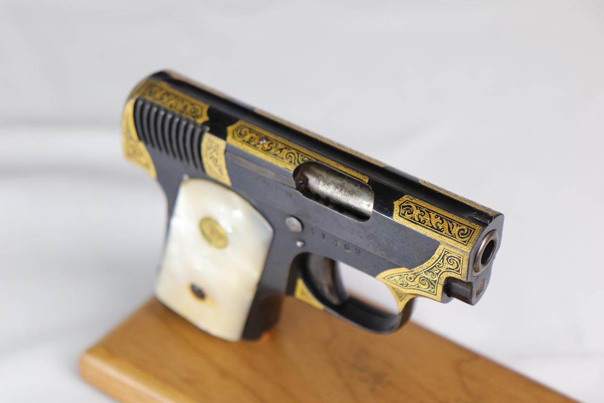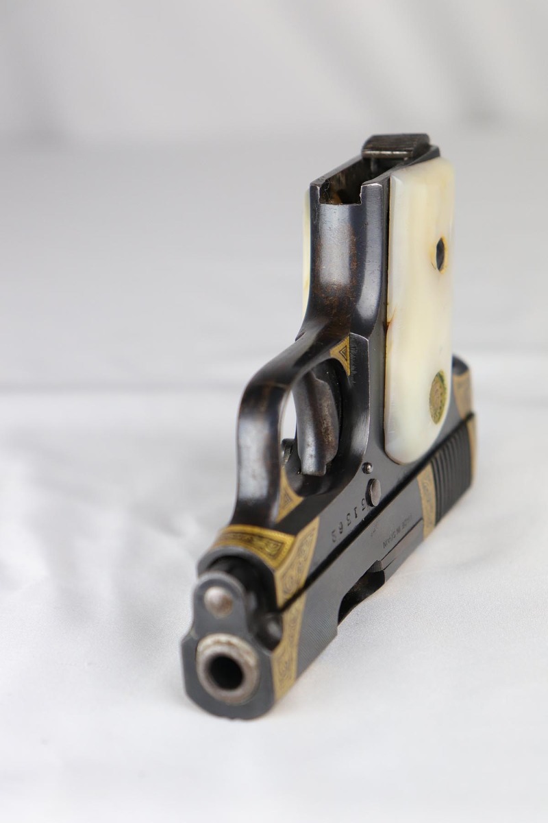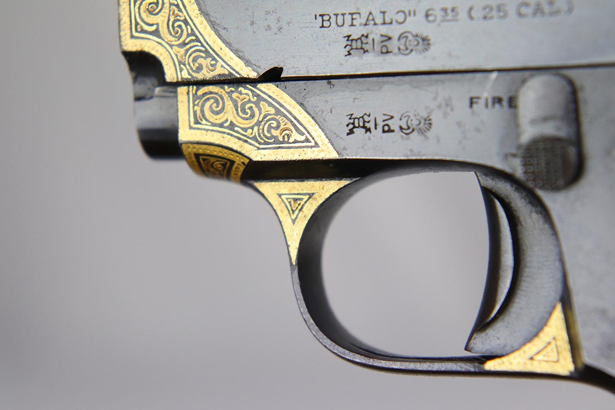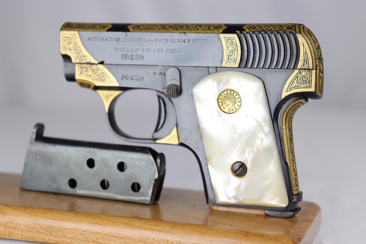 3/1/18 – This is an exquisite example of a pre-war Spanish Bufalo pocket pistol, chambered in .25 cal. It has about 40% coverage of very good quality Gold Damascening, which was essentially an engraving with gold foil pressed into the engraving lines in Cloisonné style. Very few were embellished in this fashion as the process was very labor intensive and pricey. The gun is in excellent original condition and has all of its damascening work intact with about 95% of original blue remaining. The grips are real MOP grips with “Indian Head Penny” medallions and are without defects. Bore has some corrosion in the grooves. A true piece of art!