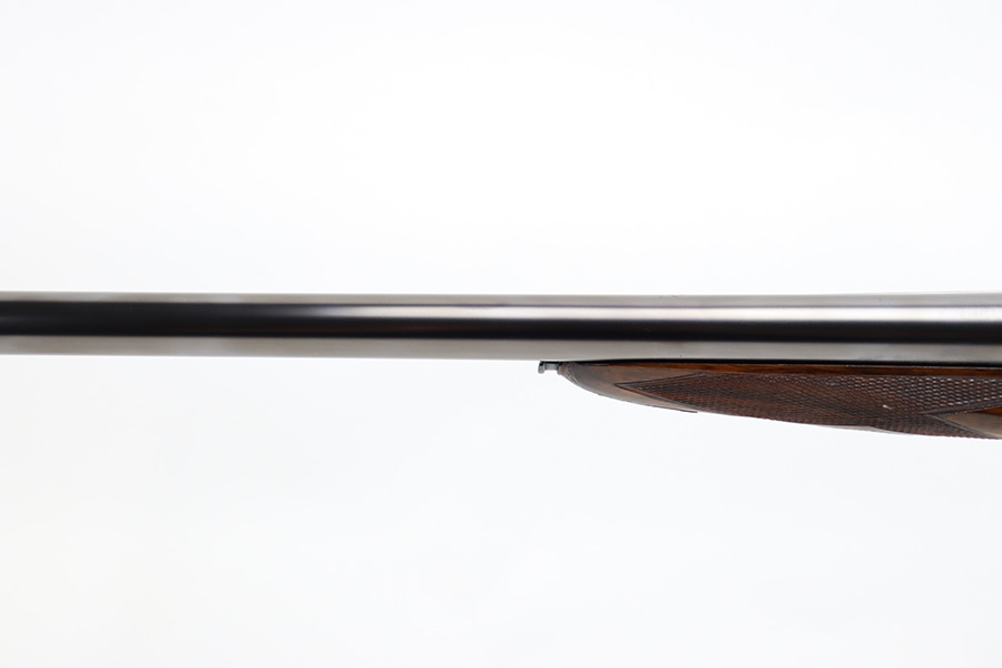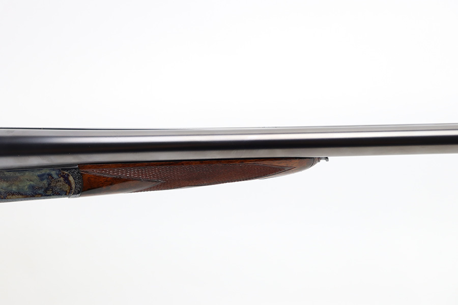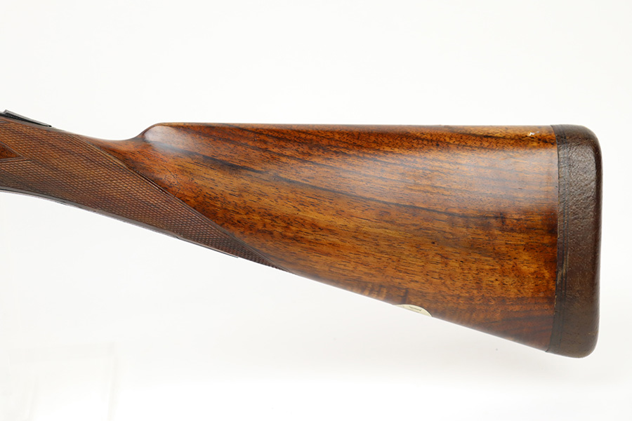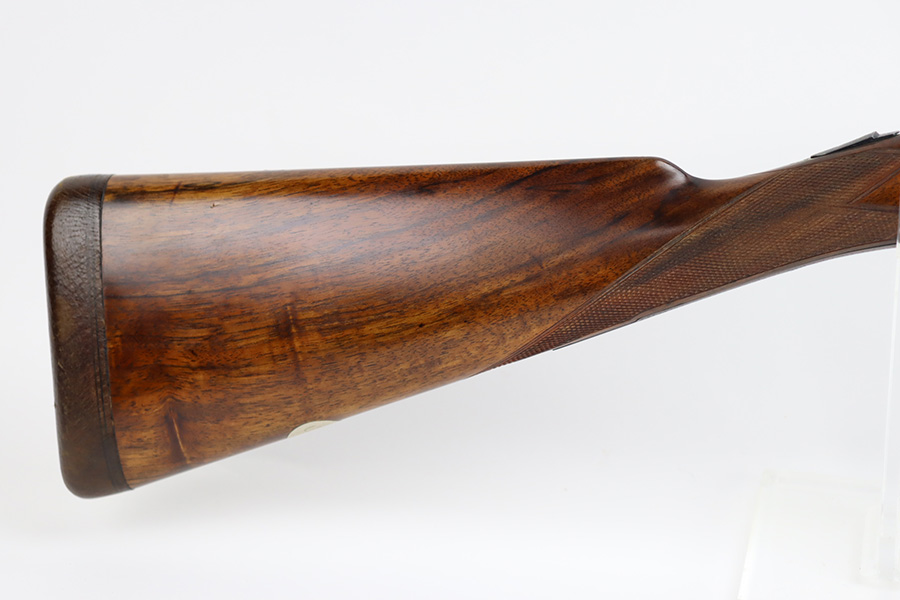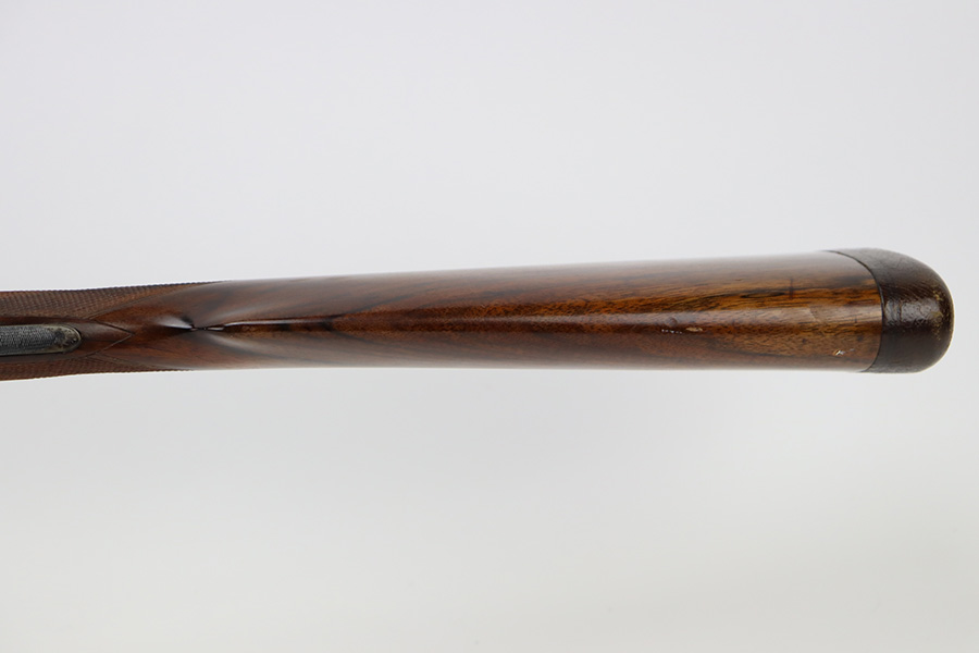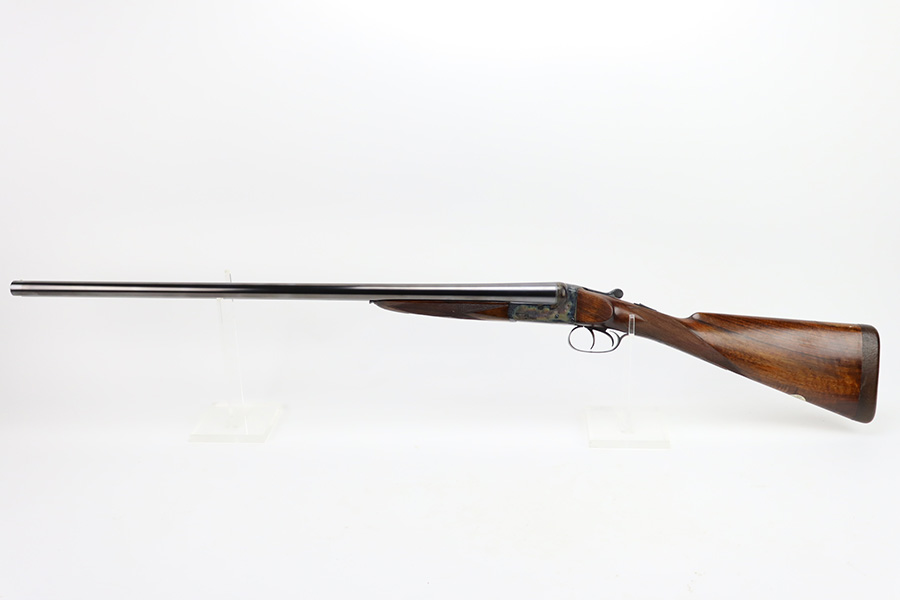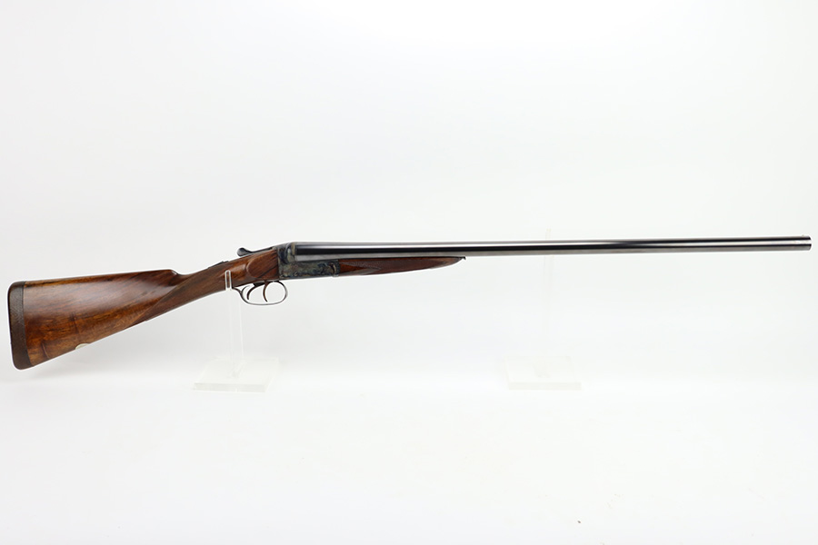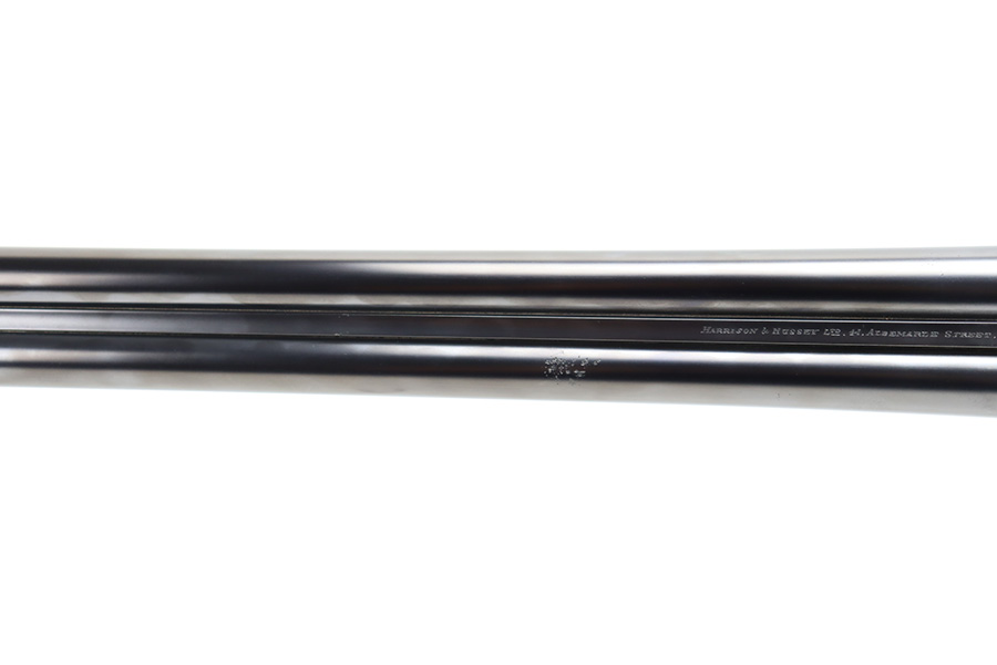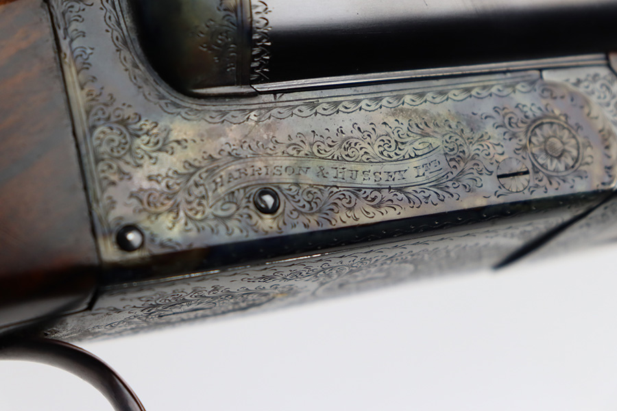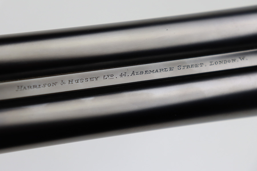 1/10/24 – This is a beautiful example of a Harrison & Hussey Side by Side Shotgun, manufactured in England in the early 1900’s and chambered in 12 GA. All matching, 28″ barrels, 15″ LOP. The barrels are blued, and the receiver is case-hardened with engraved details. The underside of the butt stock has a disc with the initials “CPM”. There are virtually no signs of wear except for a small area of pitting on the left side of the barrels. Excellent wood furniture, but there is a repaired hairline crack around the wrist of the stock. Minty, shiny bores.