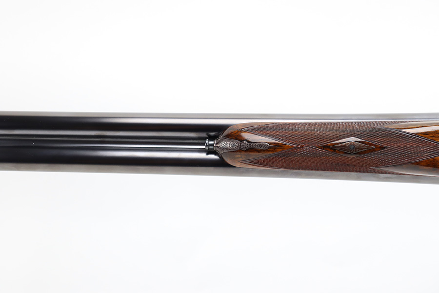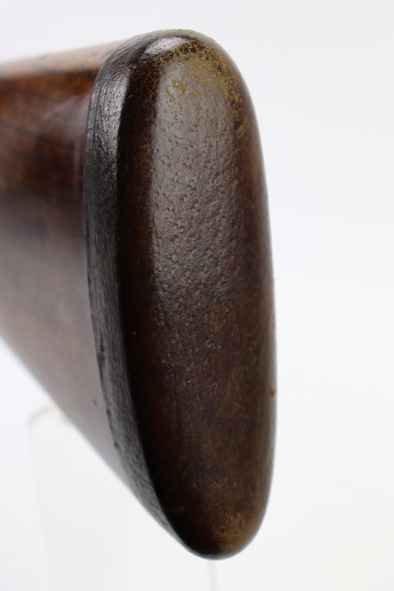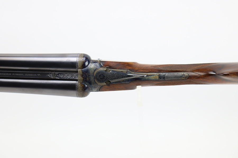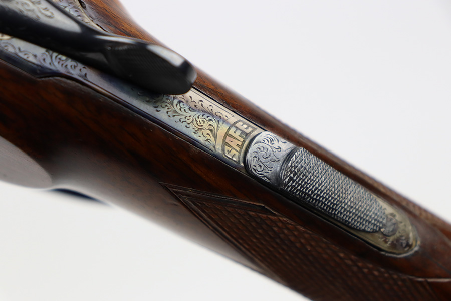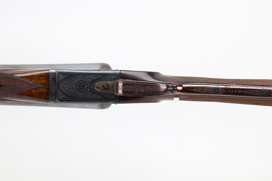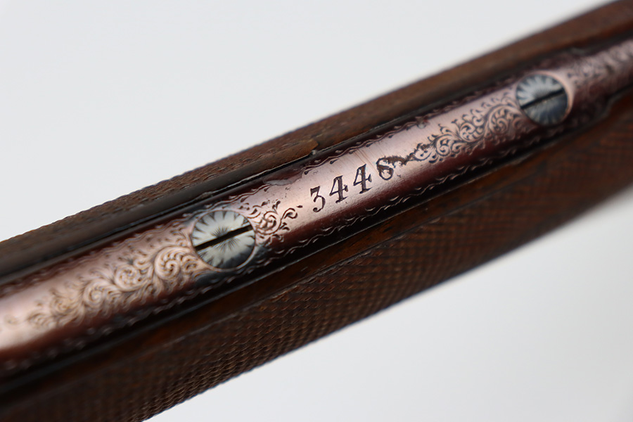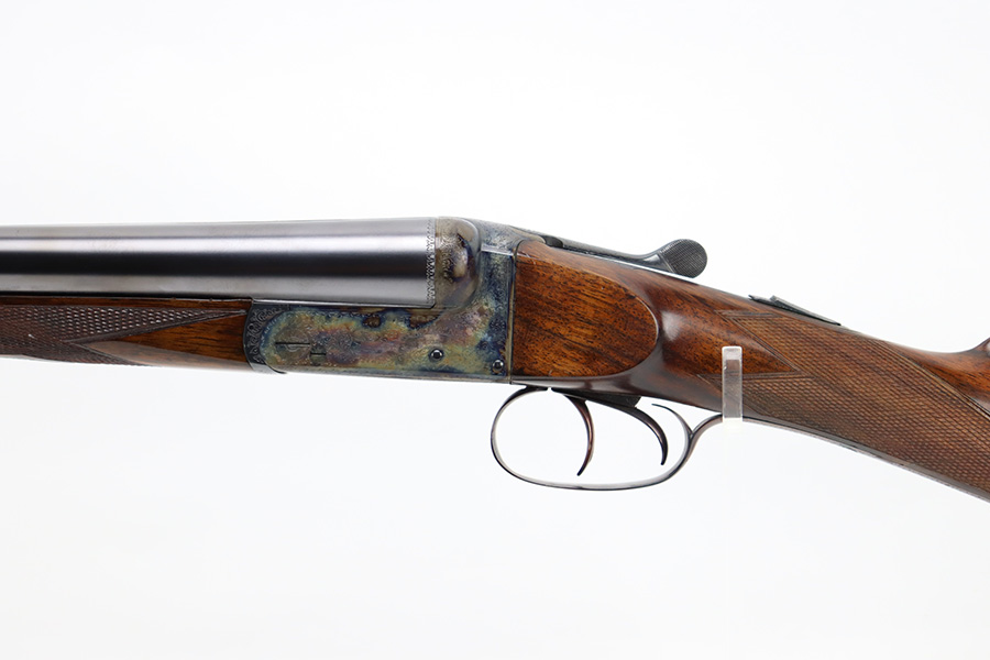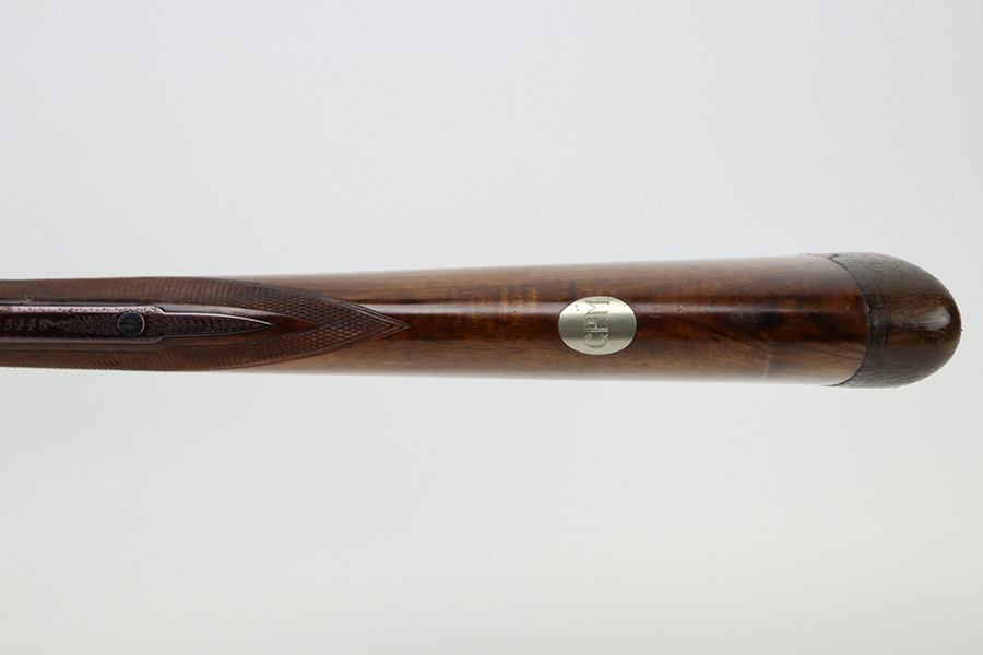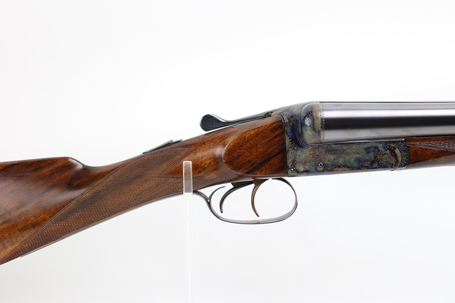 1/10/24 – This is a beautiful example of a Harrison & Hussey Side by Side Shotgun, manufactured in England in the early 1900’s and chambered in 12 GA. All matching, 28″ barrels, 15″ LOP. The barrels are blued, and the receiver is case-hardened with engraved details. The underside of the butt stock has a disc with the initials “CPM”. There are virtually no signs of wear except for a small area of pitting on the left side of the barrels. Excellent wood furniture, but there is a repaired hairline crack around the wrist of the stock. Minty, shiny bores.
