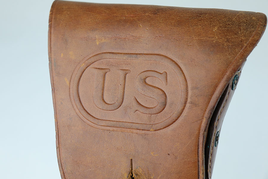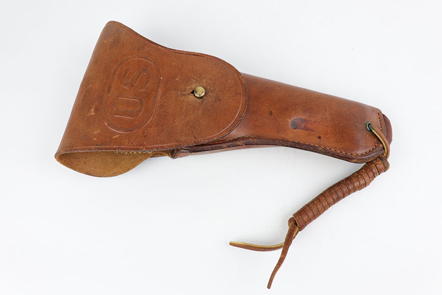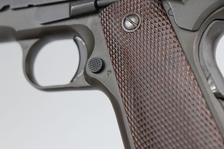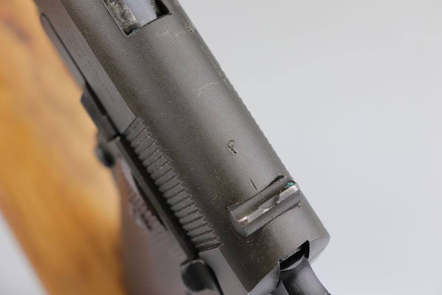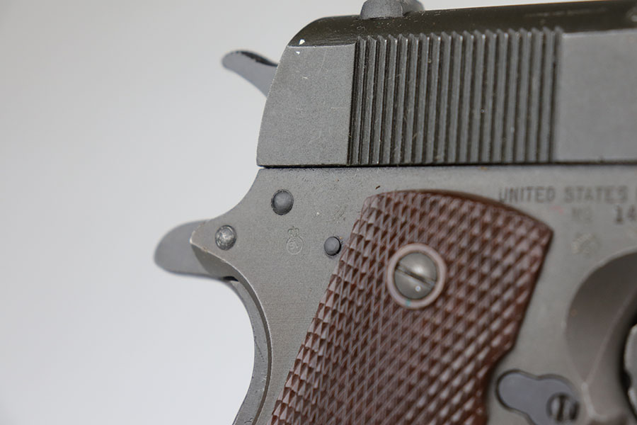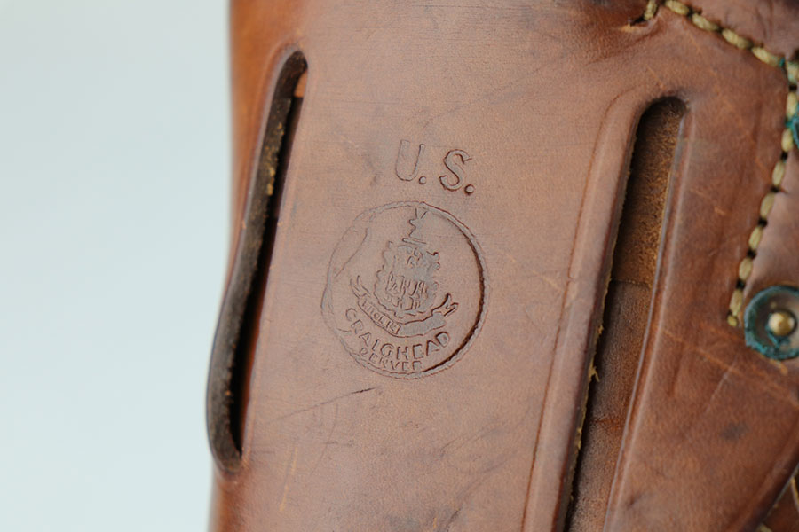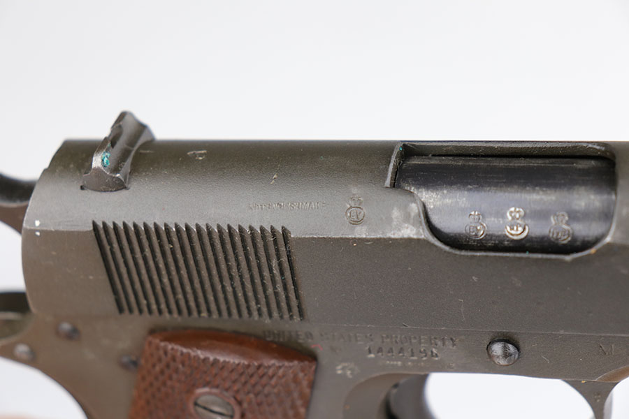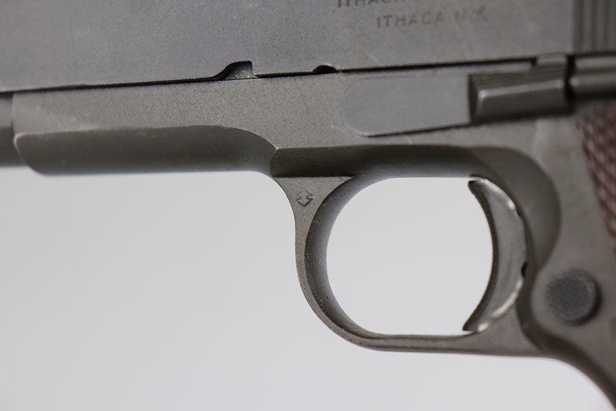 6/12/20 – This is a terrific example of an Ithaca 1911A1 rig from late in 1943 that was part of the British Lend-Lease program as indicated by the proofs on the barrel and upper portion of the slide. The finish is excellent with a minty profile, but a little bit of thinning on the front strap and trigger guard, and just a small area of finish loss on the slide near the ejection port. Flannery barrel with strong bore. Minty grips. ‘L’ marked magazine. Comes with an excellent original holster that was produced by Craighead.