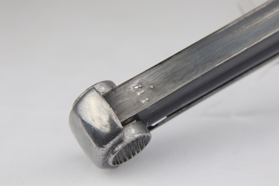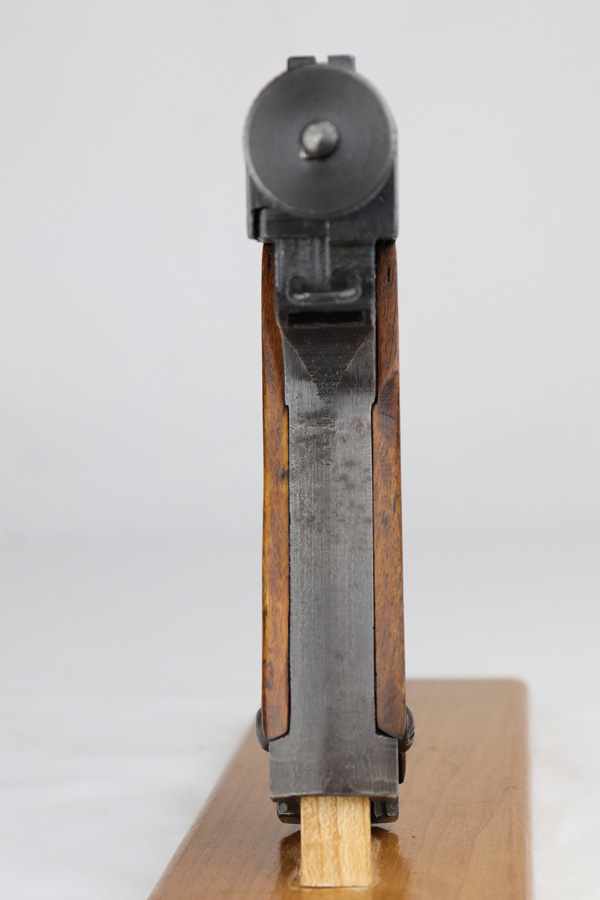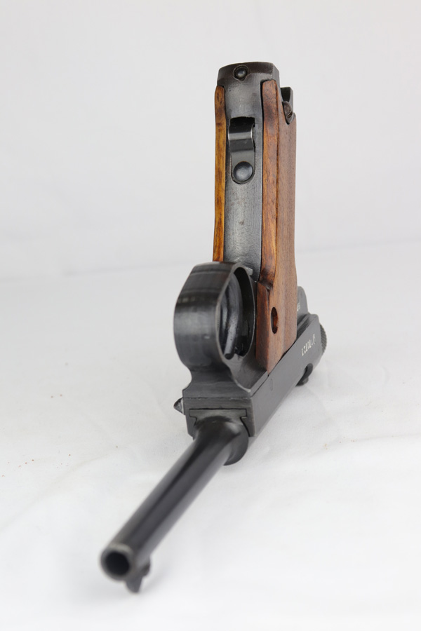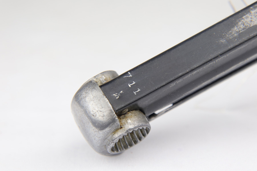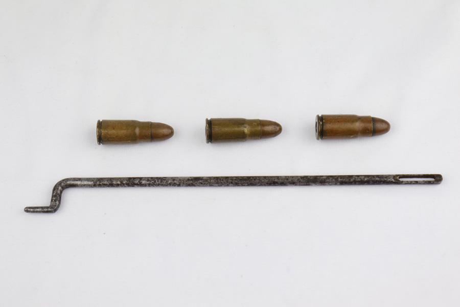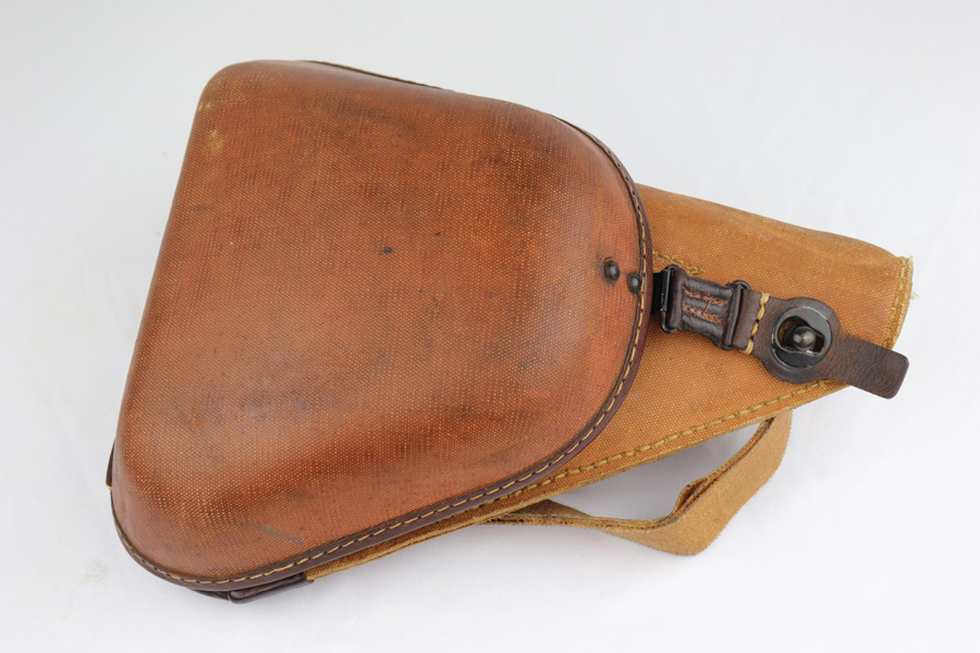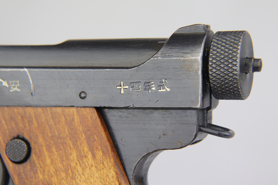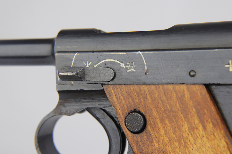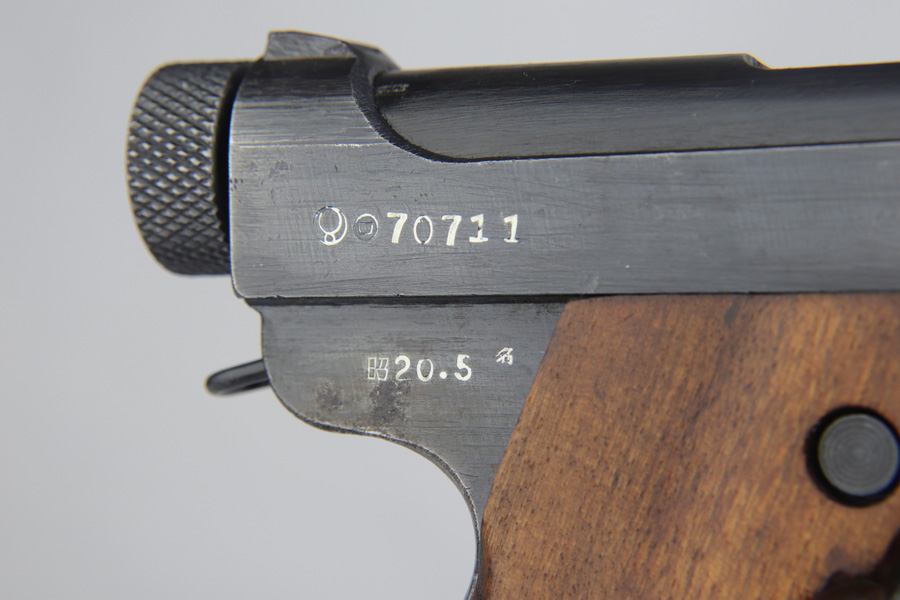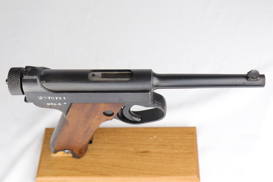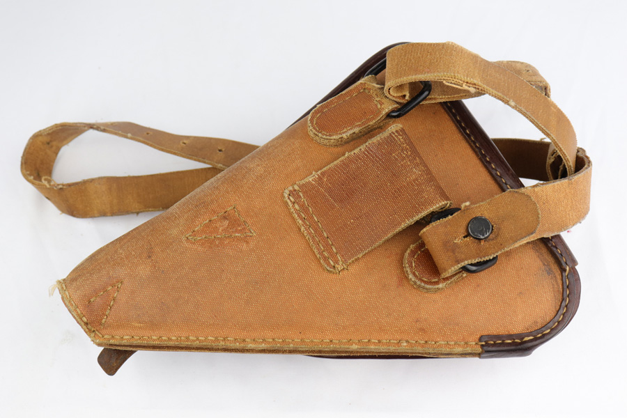 1/25/19 – This is an excellent and complete Type 14 Nambu rig from near the very end of the war, with manufacture date of May of 1945. This rig is complete with excellent canvas holster with original shoulder strap, both original matching magazines, cleaning rod, and even three rounds of original ammo. The bluing on the pistol rates at about 95-97% with some high point rub wear from the holster, and a little thinning of the back strap. Terrific bore, hardly used. Large trigger guard and slab style grips. The grips are matching numbered to the pistol. The holster is in fantastic condition and has some kanji written inside the top flap.