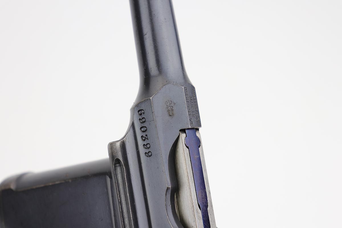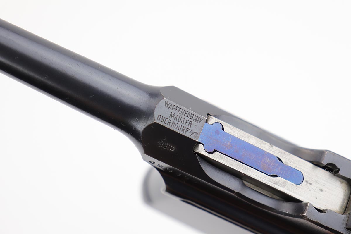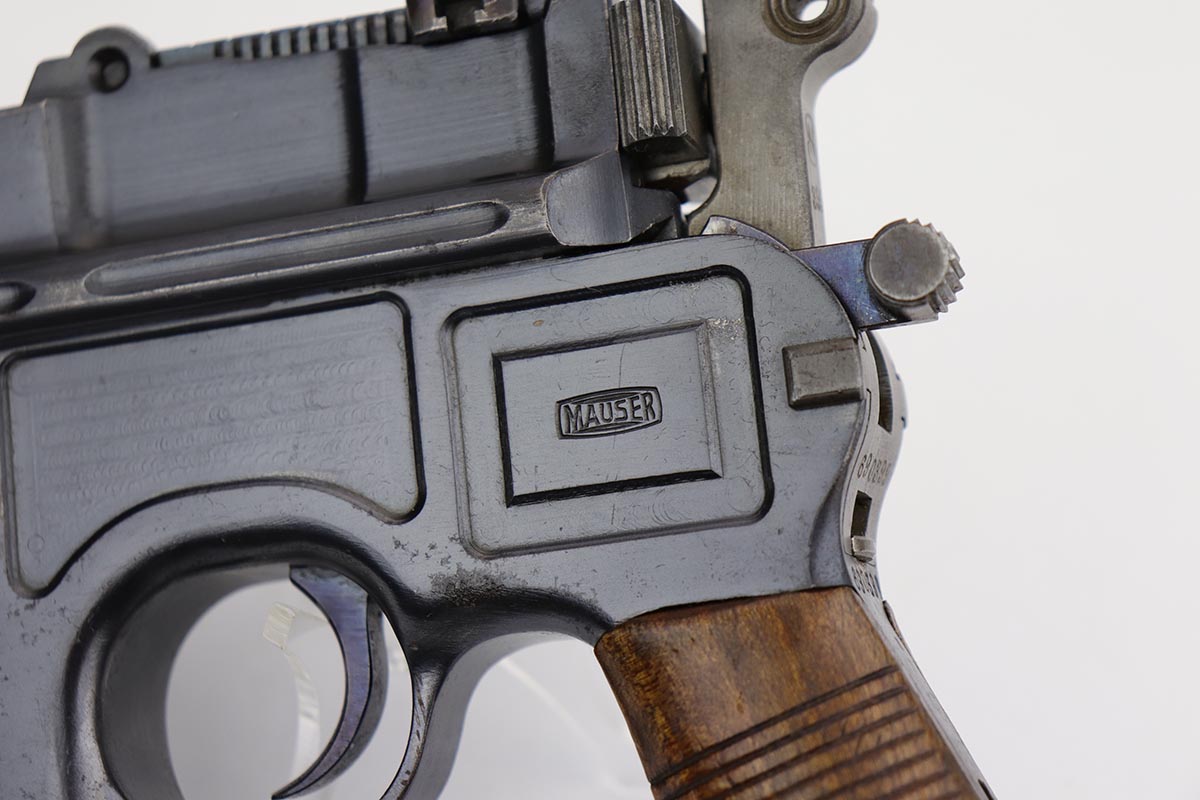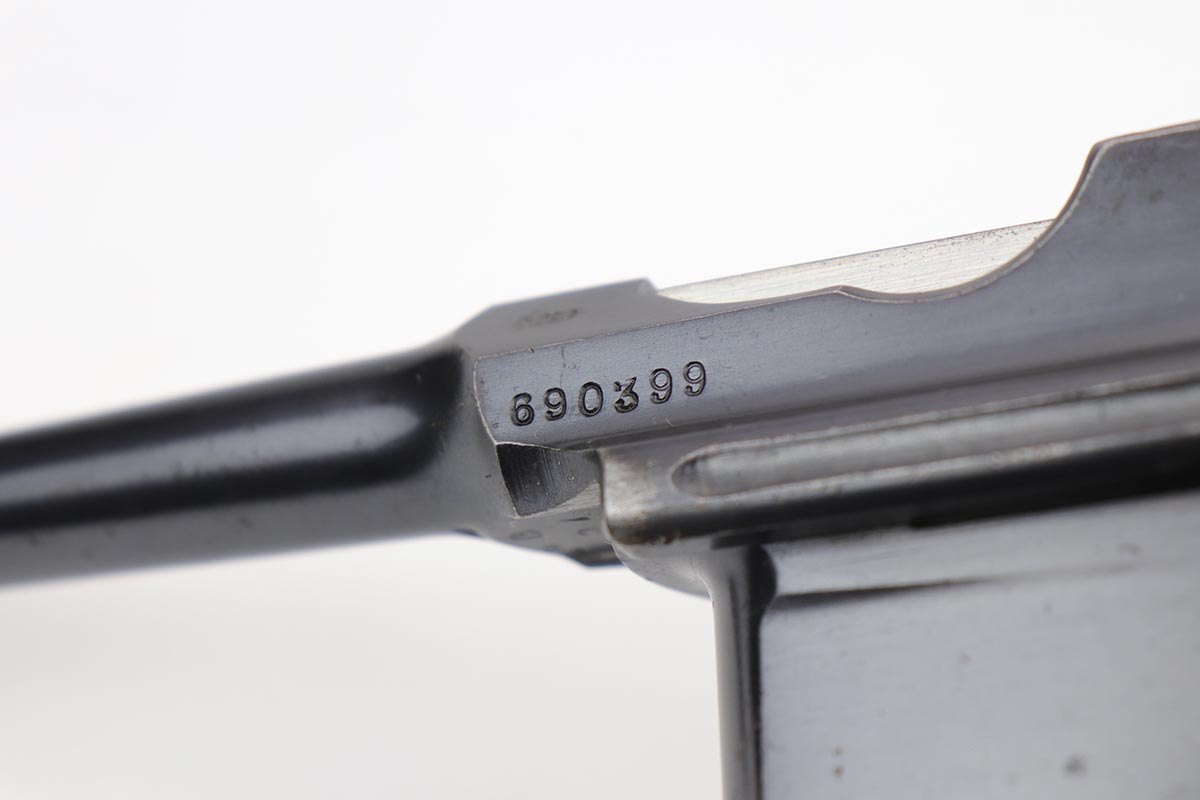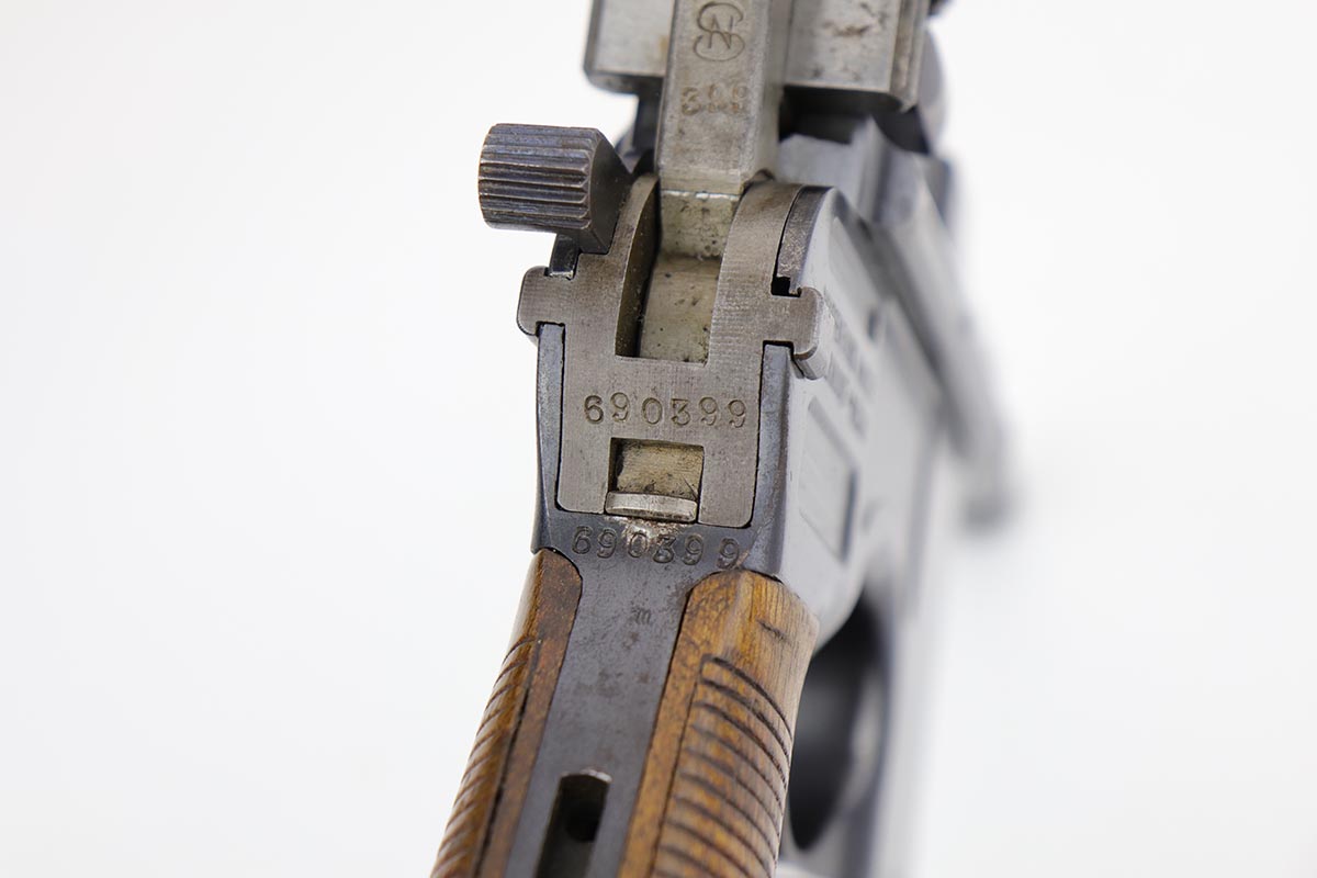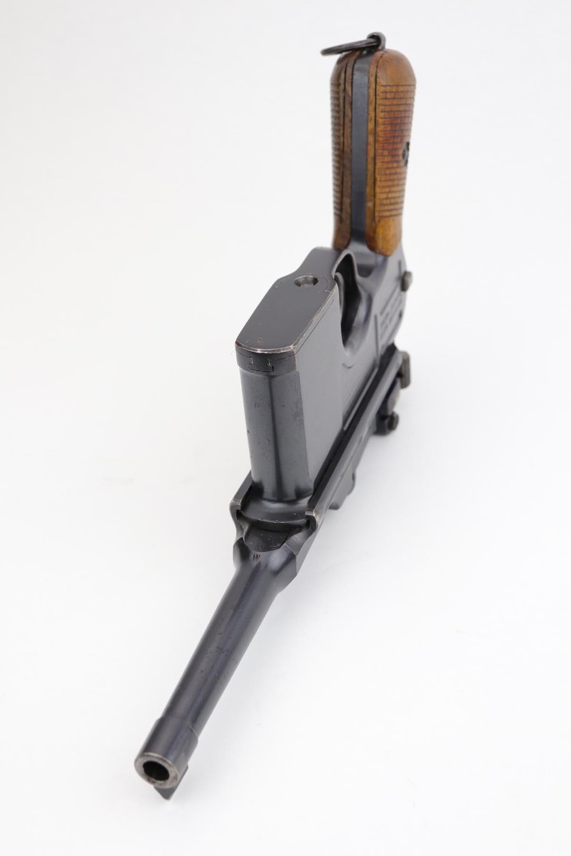2/28/23 – This is an excellent and all original M1921 Mauser “Bolo”, manufactured some time in the 1920s. The Treaty of Versailles, signed in 1919, imposed restrictions on pistol barrel lengths and calibers on German arms manufacturers. Mauser began manufacturing a compliant version of the C96 for commercial sale with shorter, 3.9 inch barrel. Serial dates this pistol to 1923-30. The pistol is all matching, including the grips. The original blue rates at about 97-98% with only minor muzzle and high edge wear. There is very minor surface spotting in a couple areas. Bore is shiny with strong rifling. Very nice fire blue is still present on small parts.