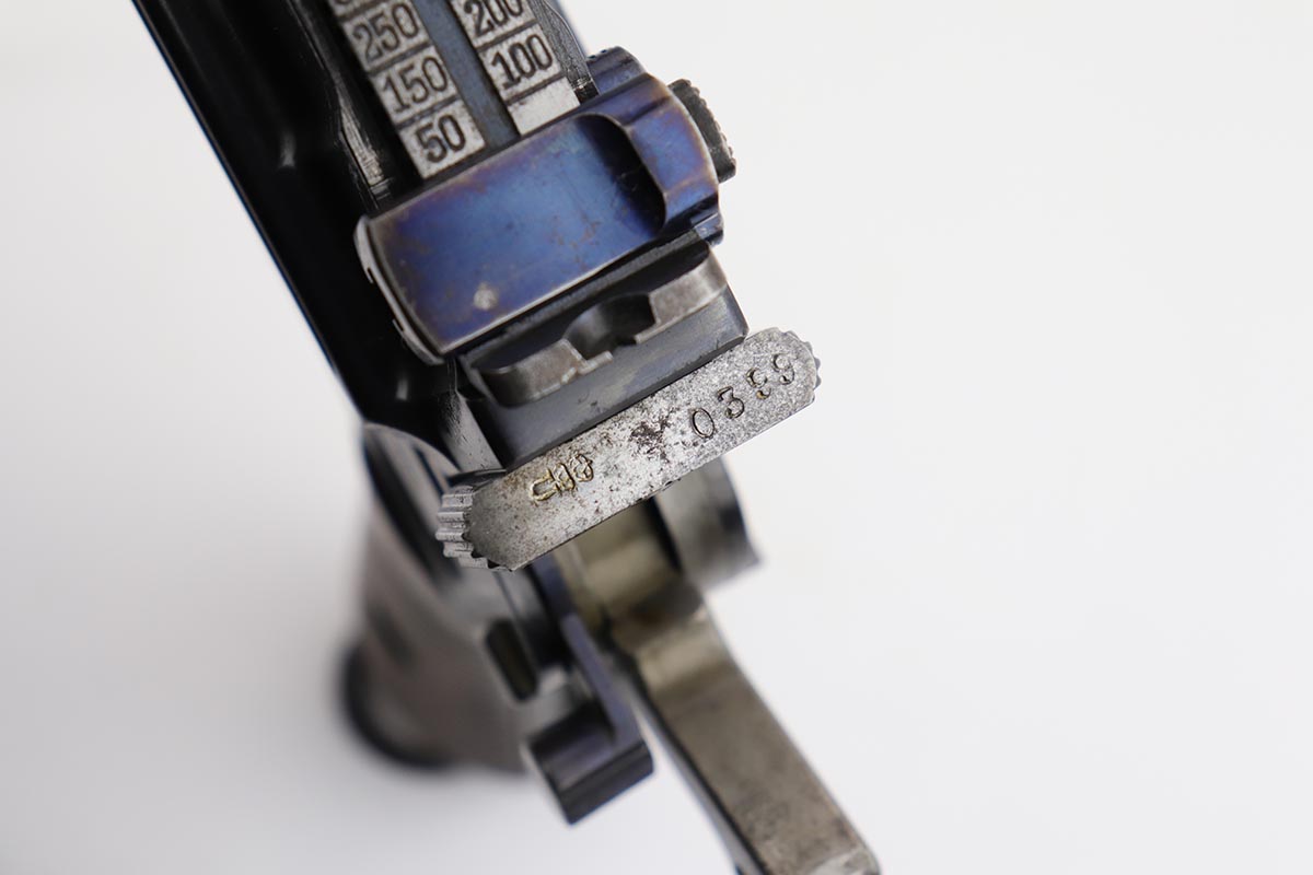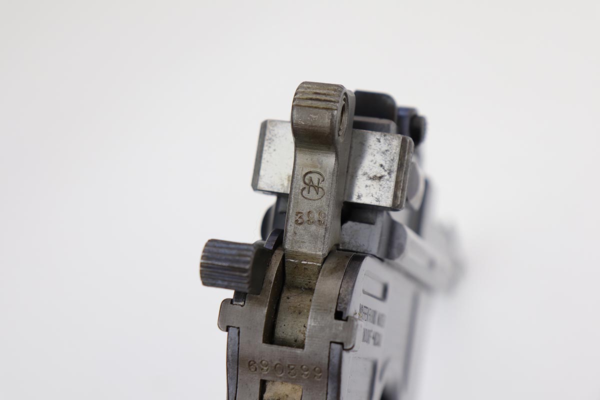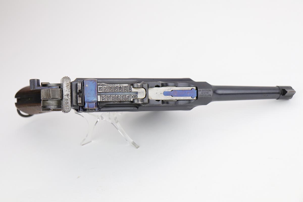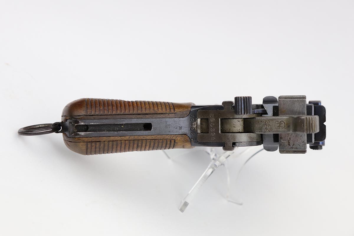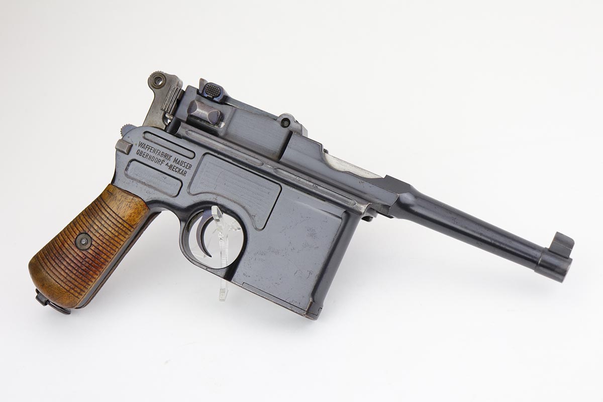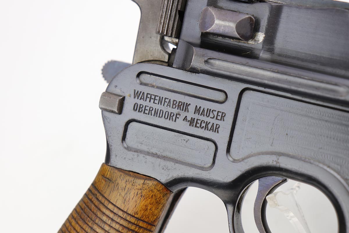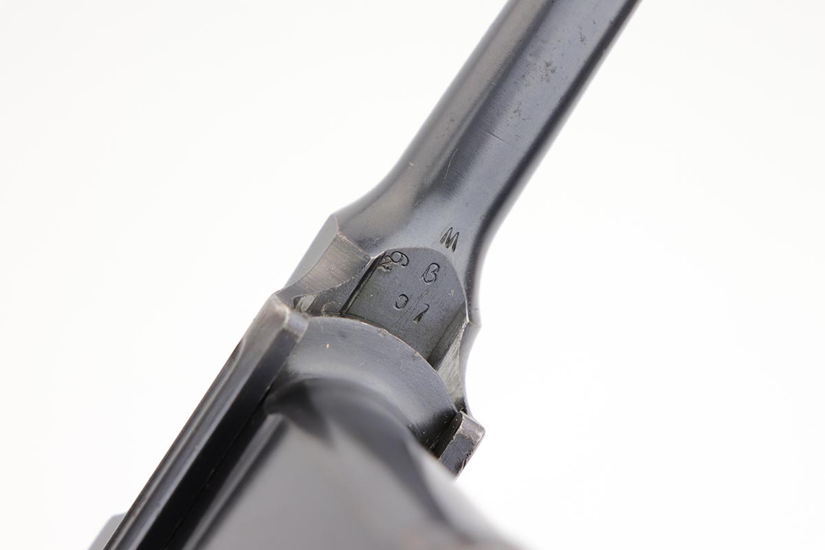 2/28/23 – This is an excellent and all original M1921 Mauser “Bolo”, manufactured some time in the 1920s. The Treaty of Versailles, signed in 1919, imposed restrictions on pistol barrel lengths and calibers on German arms manufacturers. Mauser began manufacturing a compliant version of the C96 for commercial sale with shorter, 3.9 inch barrel. Serial dates this pistol to 1923-30. The pistol is all matching, including the grips. The original blue rates at about 97-98% with only minor muzzle and high edge wear. There is very minor surface spotting in a couple areas. Bore is shiny with strong rifling. Very nice fire blue is still present on small parts.