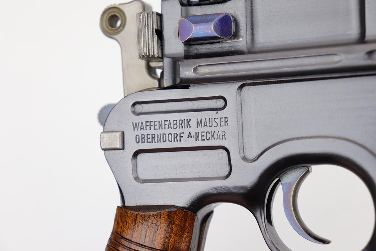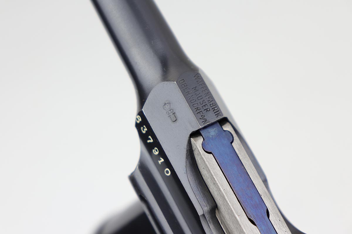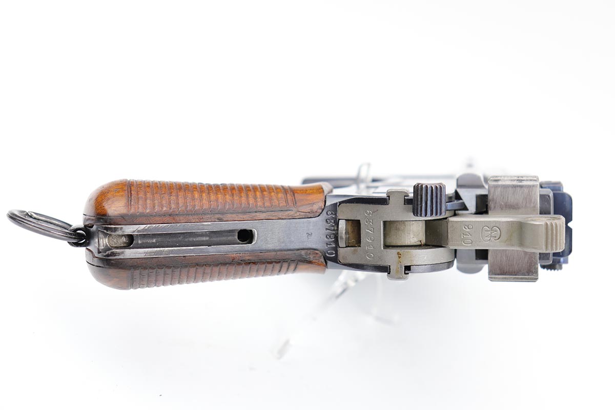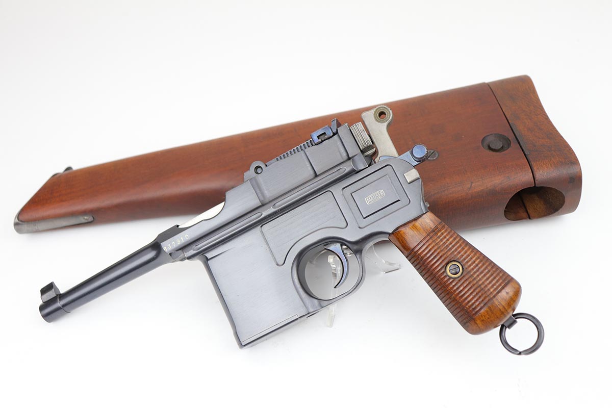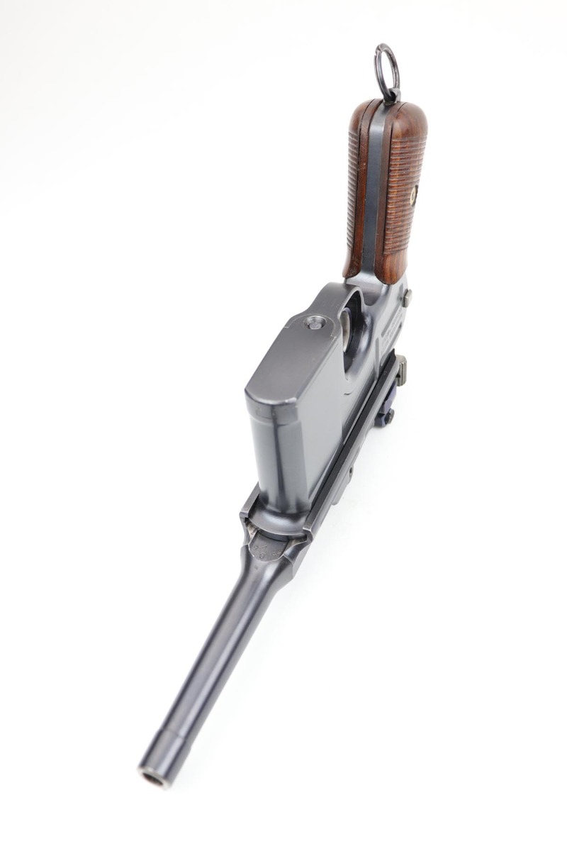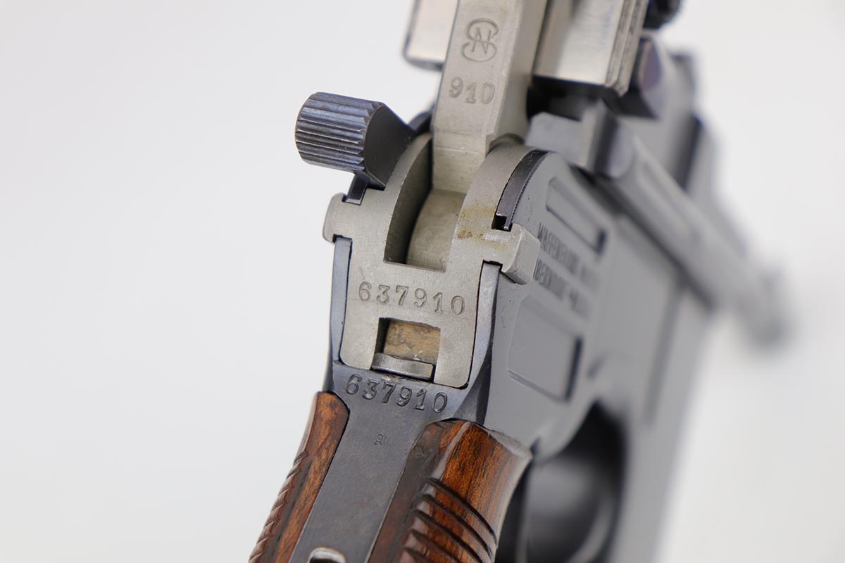 2/25/20 – This is just an outstanding mint example of a Mauser “Broomhandle” pistol, made in the mid-twenties, after WWI, most likely for commercial market. This a less frequently seen “Bolo” model, with a shorter grip and barrel. Chambered in powerful .30 Mauser bottleneck cartridge caliber, “Bolo” Mausers were favorite of the Russian Bolshevics during and after the revolution , thus earning a “Bolo” nickname. This particular gun looks nearly new, with over 99% of its original blue present, with just a hint of wear on the tips of the frame rails and on the rear strap. The fire blue on small parts is nearly all there and is vivid and bright. The gun is all matching, including the mint grips and internals. Mint bore. The original shoulder stock is in fantastic shape with a Mauser banner on one side and the gun’s serial last 3 digits on the iron. Impossible to upgrade set.