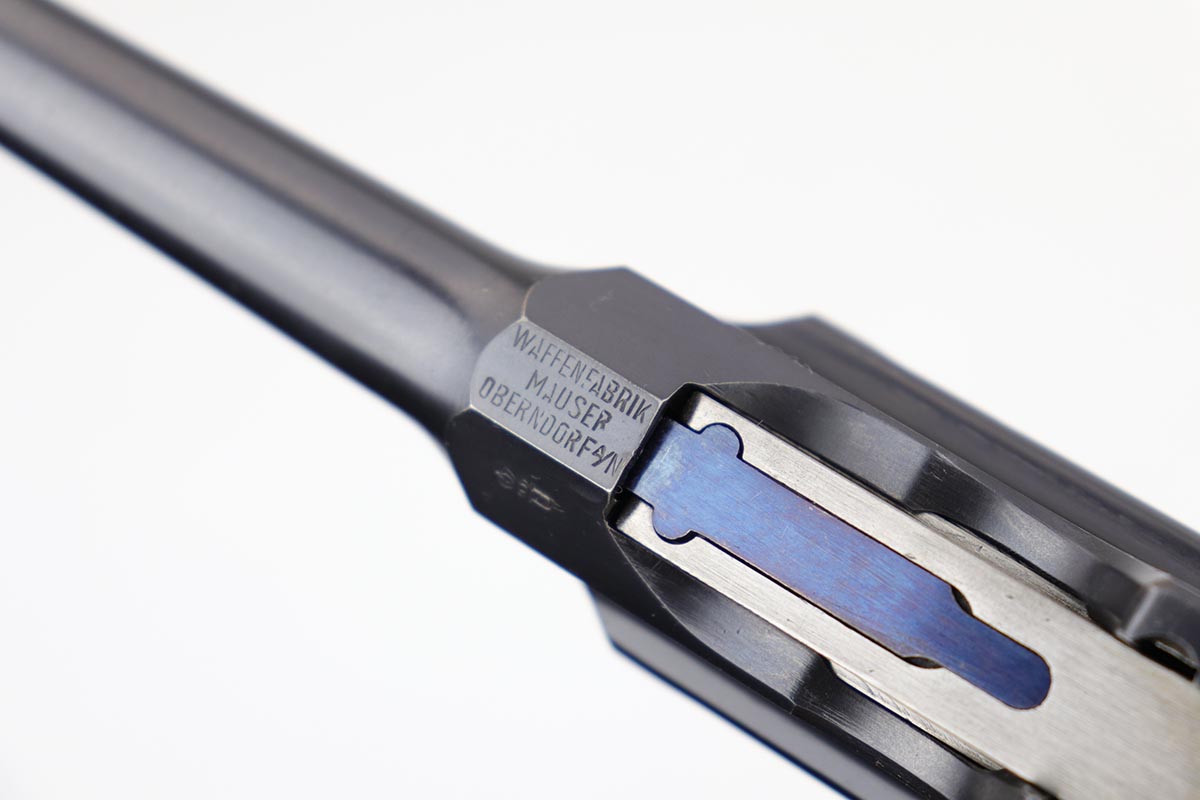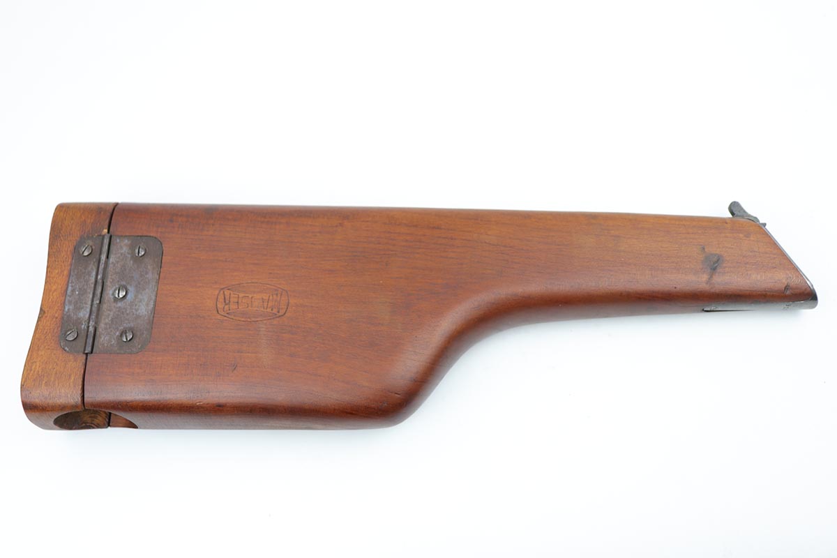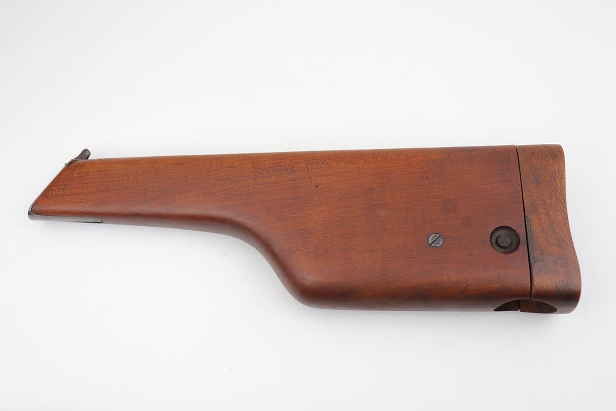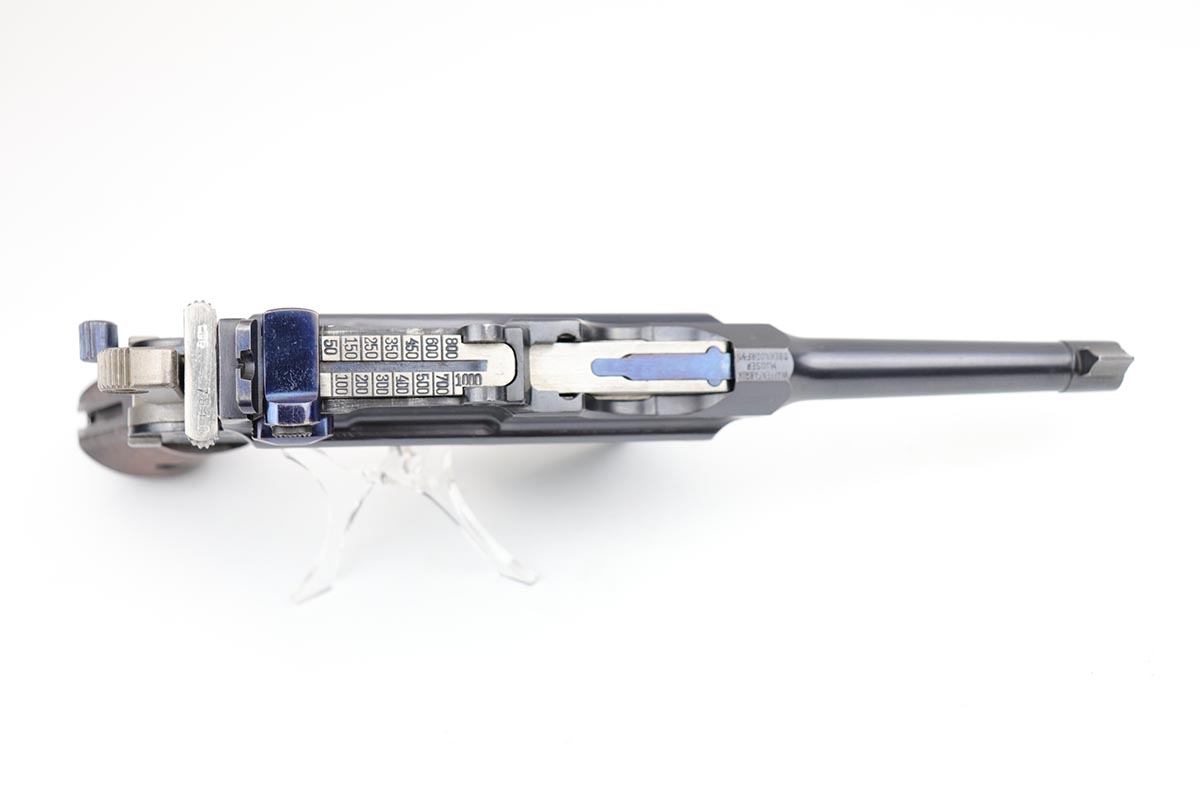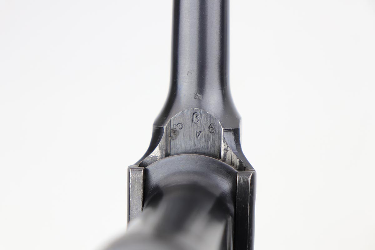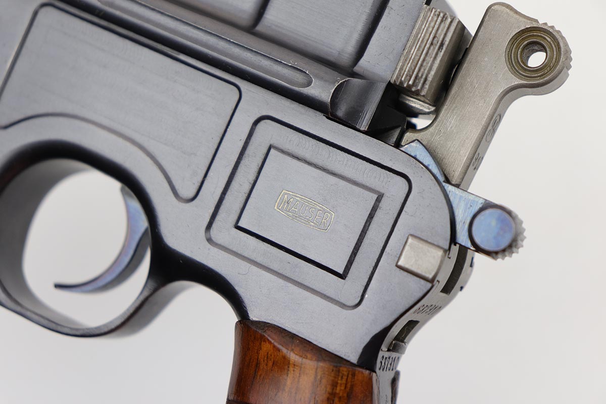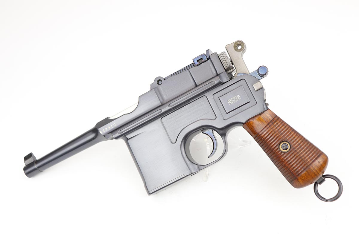 2/25/20 – This is just an outstanding mint example of a Mauser “Broomhandle” pistol, made in the mid-twenties, after WWI, most likely for commercial market. This a less frequently seen “Bolo” model, with a shorter grip and barrel. Chambered in powerful .30 Mauser bottleneck cartridge caliber, “Bolo” Mausers were favorite of the Russian Bolshevics during and after the revolution , thus earning a “Bolo” nickname. This particular gun looks nearly new, with over 99% of its original blue present, with just a hint of wear on the tips of the frame rails and on the rear strap. The fire blue on small parts is nearly all there and is vivid and bright. The gun is all matching, including the mint grips and internals. Mint bore. The original shoulder stock is in fantastic shape with a Mauser banner on one side and the gun’s serial last 3 digits on the iron. Impossible to upgrade set.