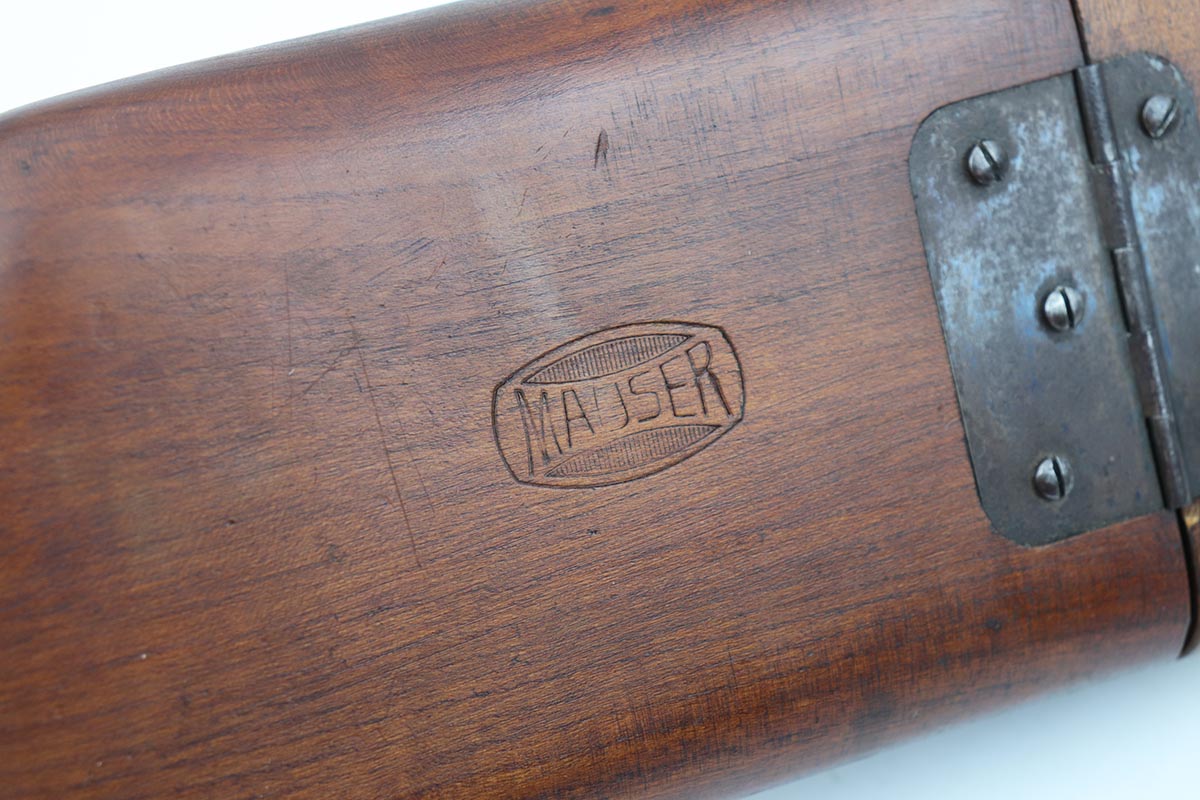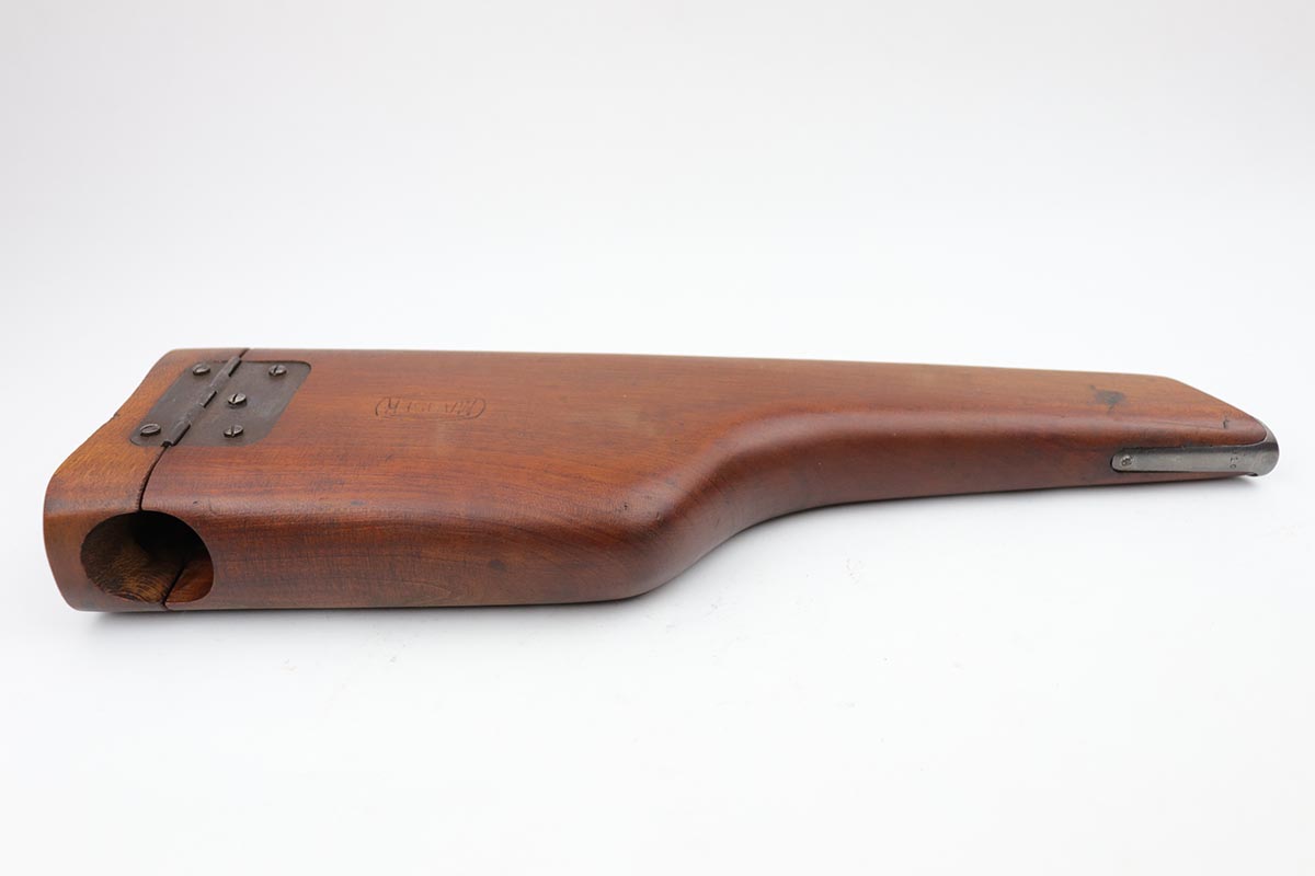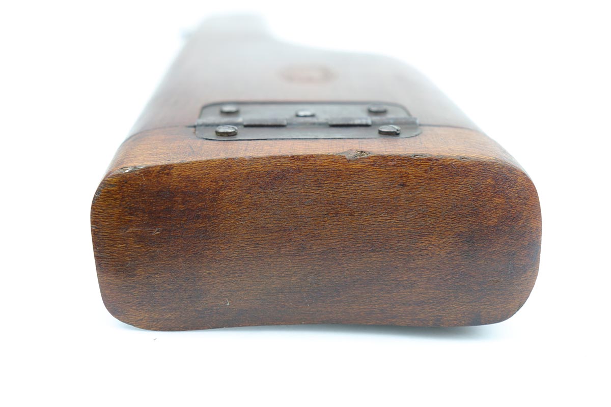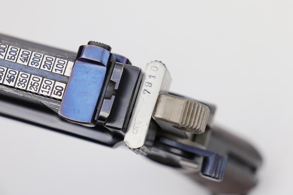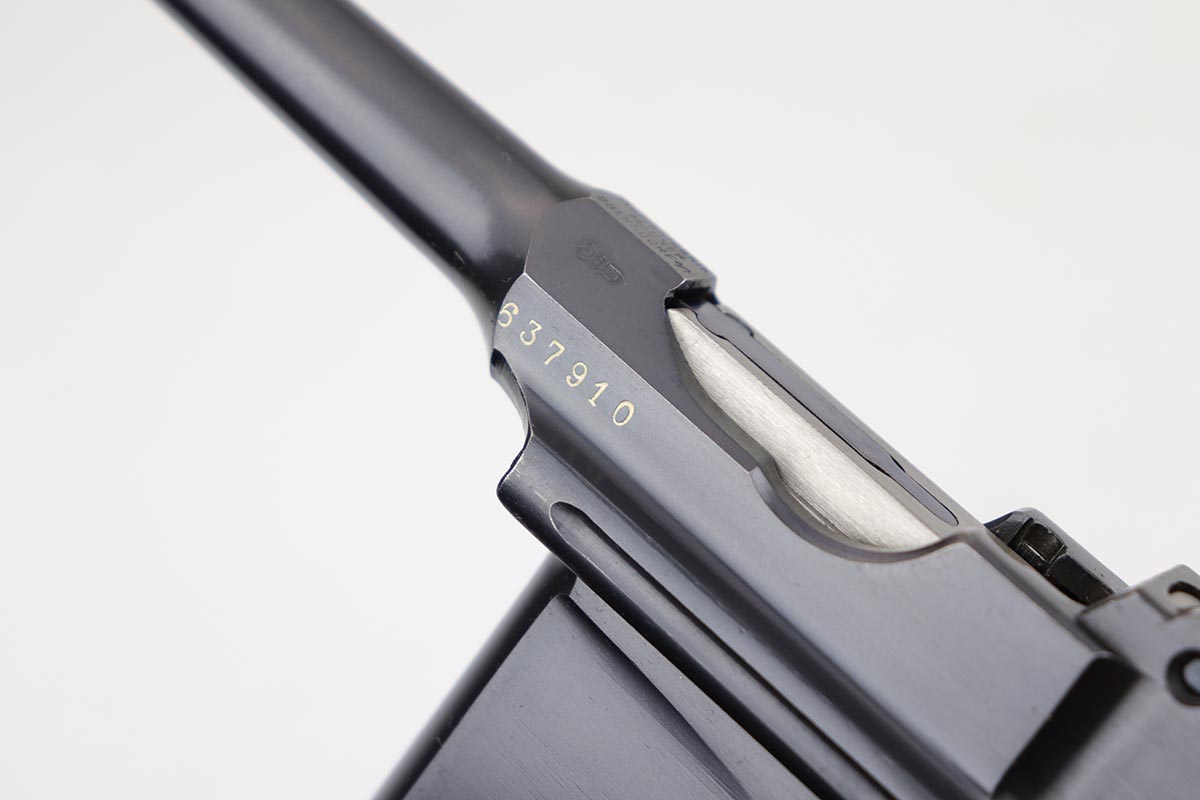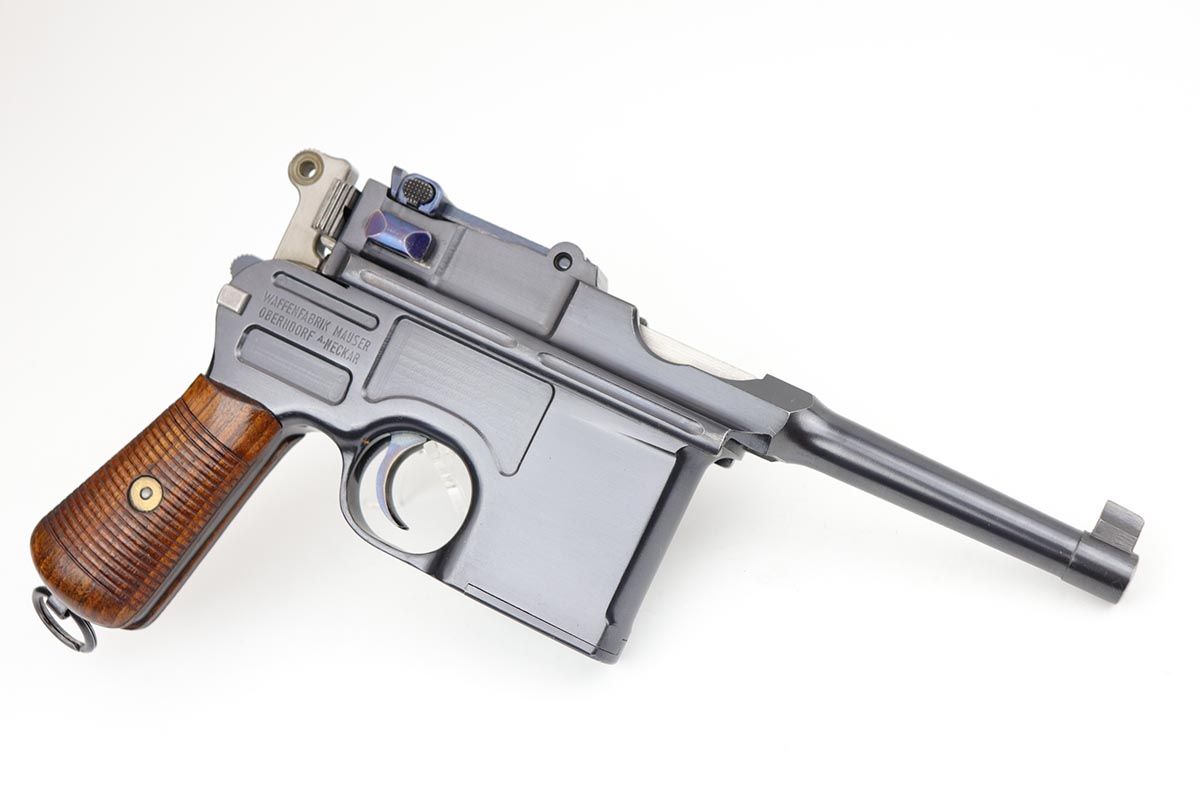 2/25/20 – This is just an outstanding mint example of a Mauser “Broomhandle” pistol, made in the mid-twenties, after WWI, most likely for commercial market. This a less frequently seen “Bolo” model, with a shorter grip and barrel. Chambered in powerful .30 Mauser bottleneck cartridge caliber, “Bolo” Mausers were favorite of the Russian Bolshevics during and after the revolution , thus earning a “Bolo” nickname. This particular gun looks nearly new, with over 99% of its original blue present, with just a hint of wear on the tips of the frame rails and on the rear strap. The fire blue on small parts is nearly all there and is vivid and bright. The gun is all matching, including the mint grips and internals. Mint bore. The original shoulder stock is in fantastic shape with a Mauser banner on one side and the gun’s serial last 3 digits on the iron. Impossible to upgrade set.