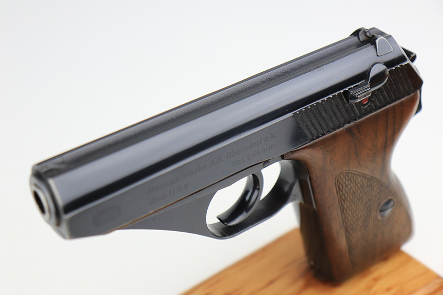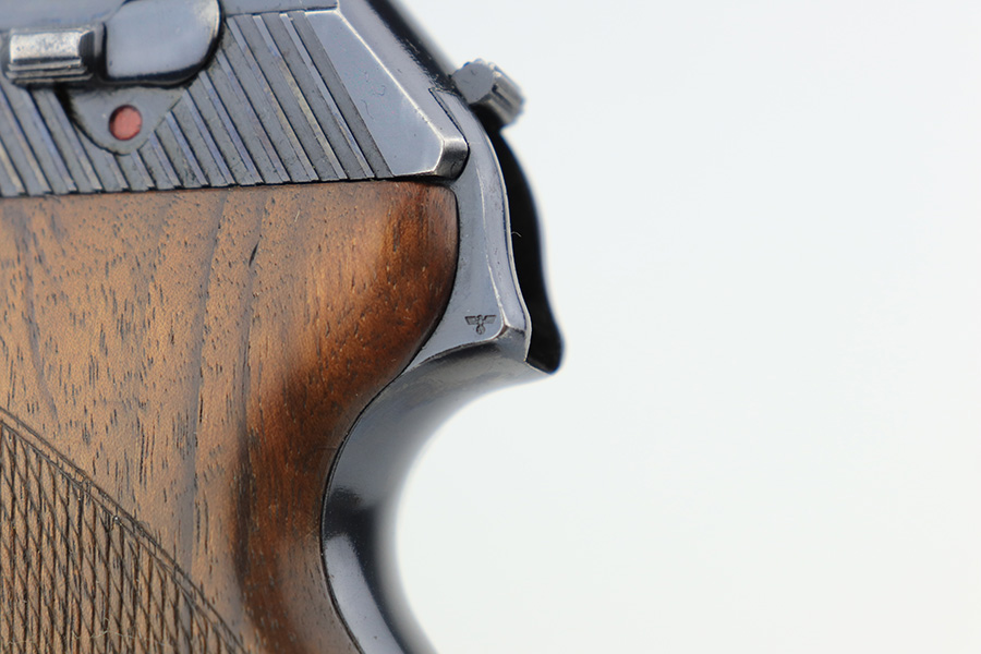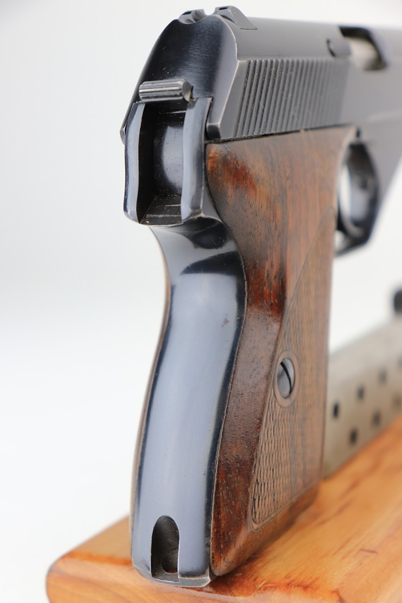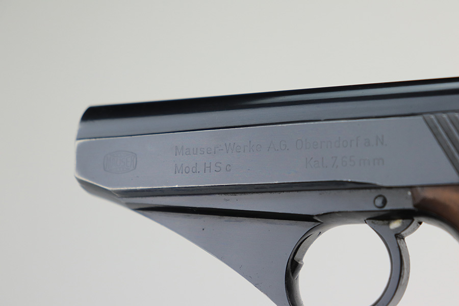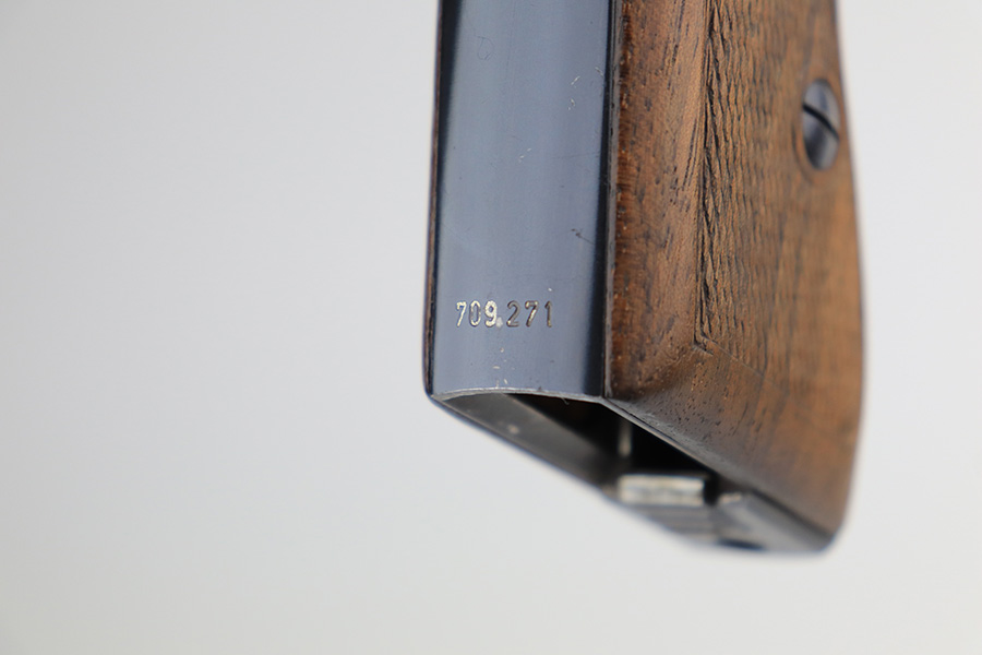 4/13/22 – This is the rarest of all the Army-issued Mauser HSc’s! In 1941, Mauser ceased production of the model 1934 in favor of the HSc, and some of the first several thousand procured bear the same proofs as the model 1934 – Eagle/655 on trigger guard and the Army test proof on the grip tang. There were only 3,000 of this variation produced, with said markings and high-polish blue finish. This one has about 99% of its original bluing left. Just a tiny bit of muzzle wear but no noteworthy areas of bluing loss and no pitting. Excellent grips with no chips or cracks. Banner magazine in excellent condition. Minty bore.