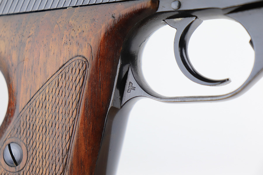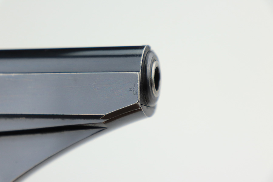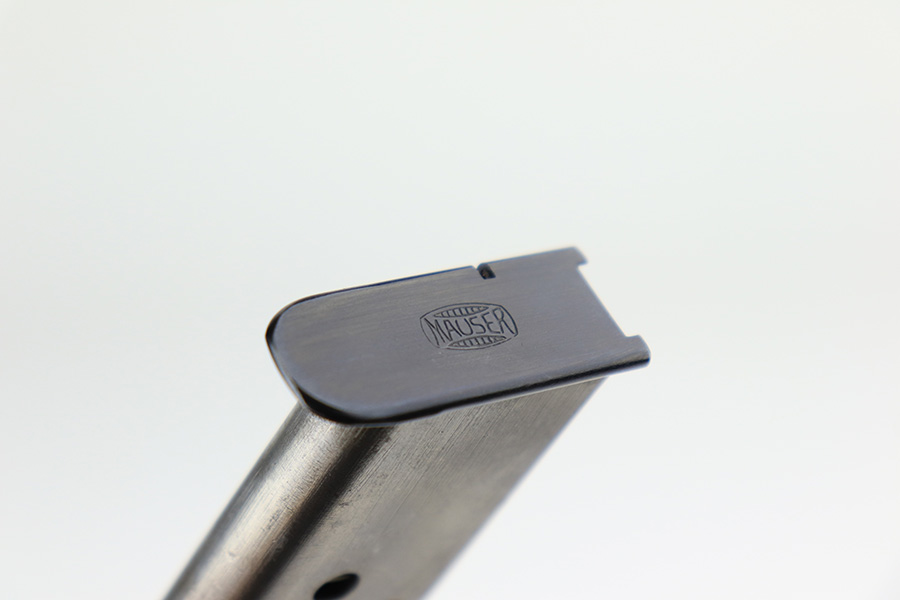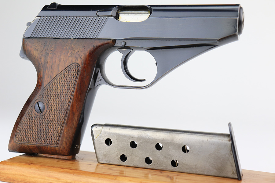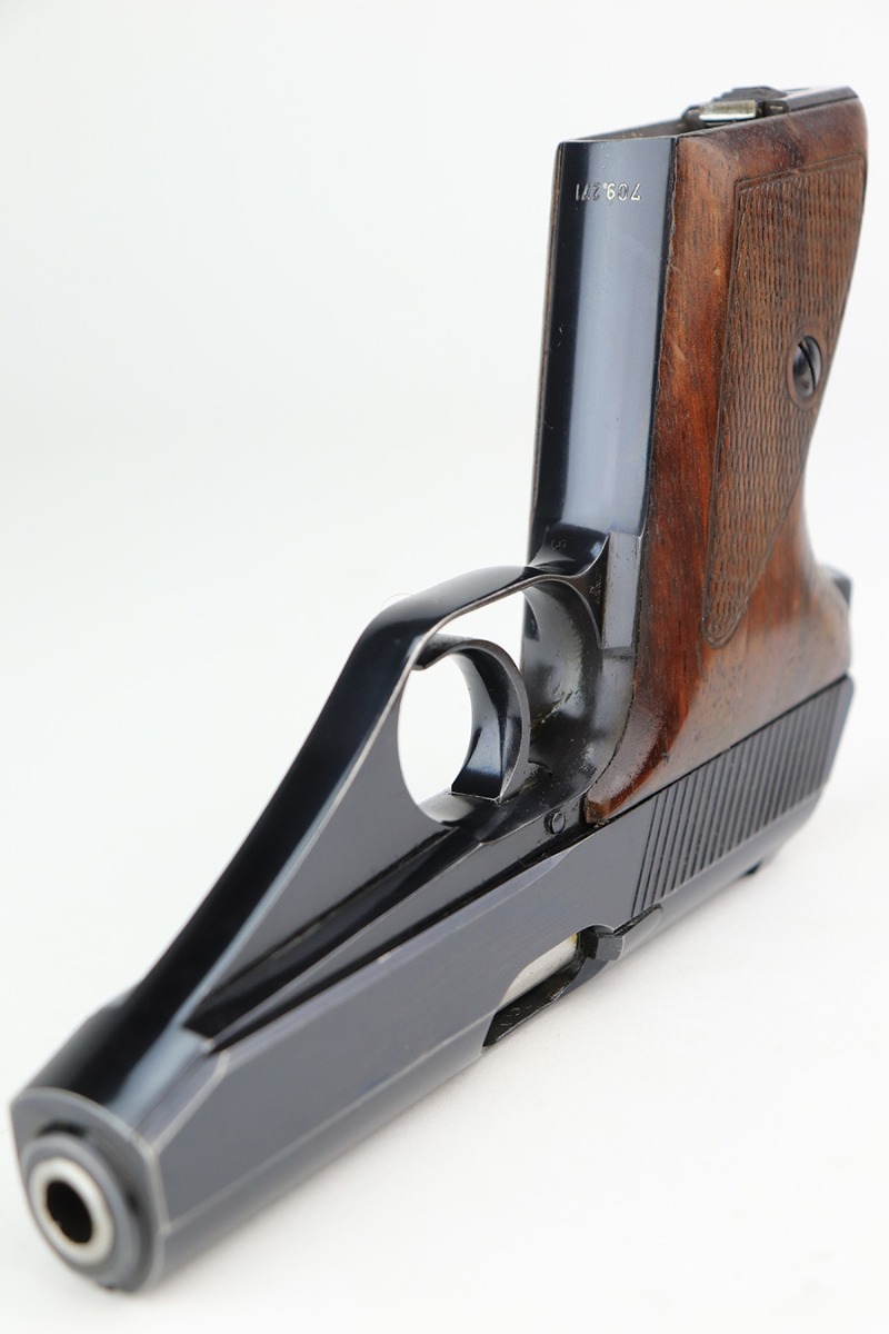 4/13/22 – This is the rarest of all the Army-issued Mauser HSc’s! In 1941, Mauser ceased production of the model 1934 in favor of the HSc, and some of the first several thousand procured bear the same proofs as the model 1934 – Eagle/655 on trigger guard and the Army test proof on the grip tang. There were only 3,000 of this variation produced, with said markings and high-polish blue finish. This one has about 99% of its original bluing left. Just a tiny bit of muzzle wear but no noteworthy areas of bluing loss and no pitting. Excellent grips with no chips or cracks. Banner magazine in excellent condition. Minty bore.