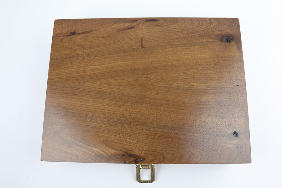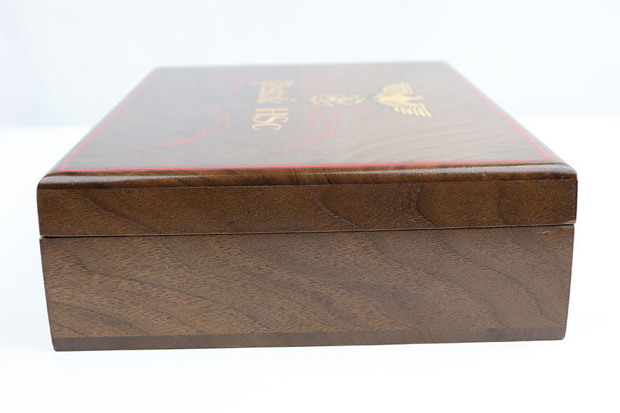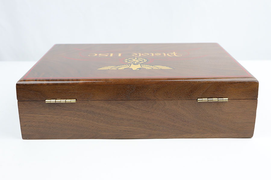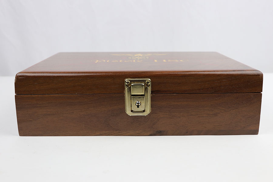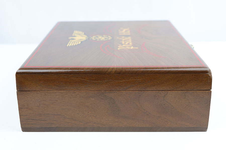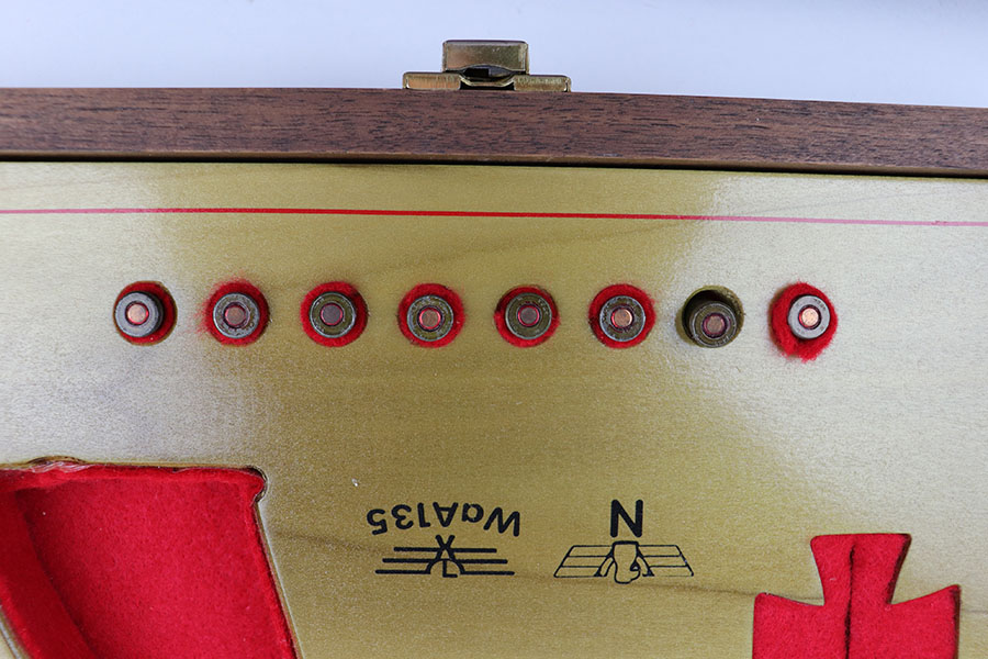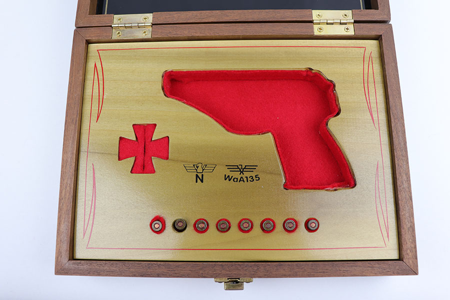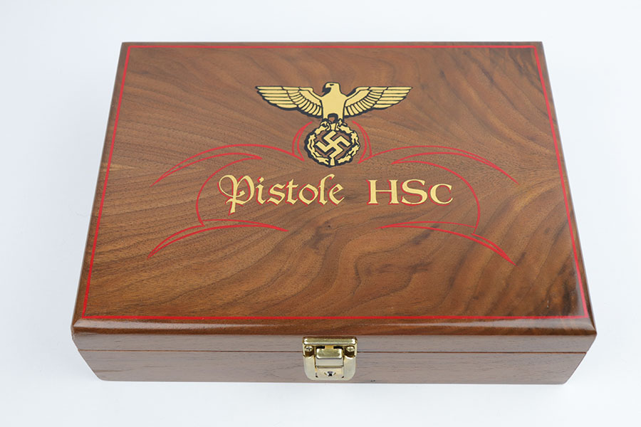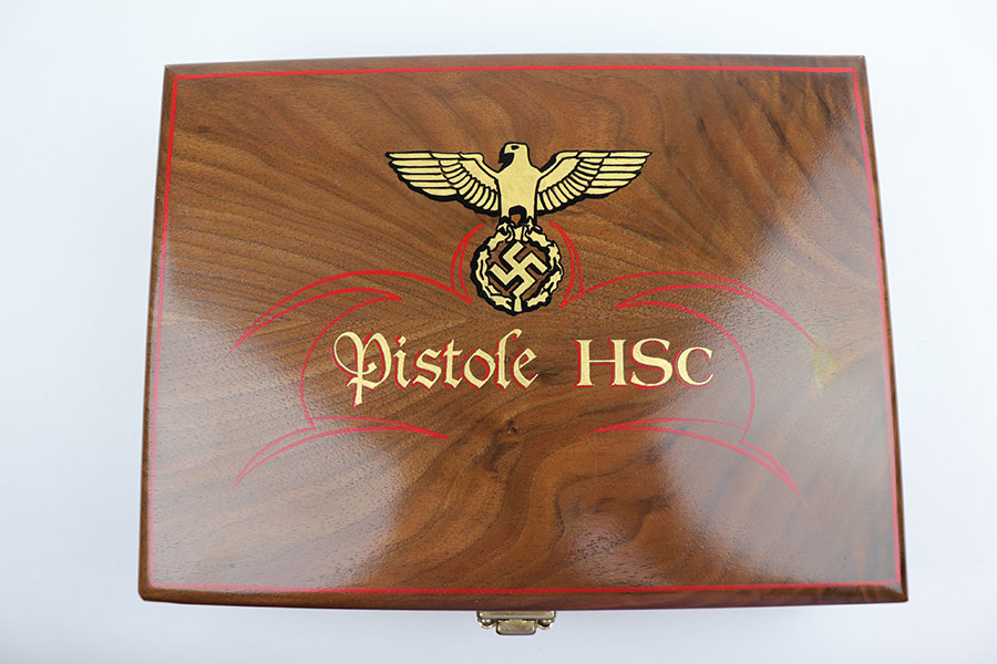 10/21/19 – This is a beautiful, hand-crafted, wooden presentation case, made for a Mauser HSc pistol. It was made post-WW2. The box is hand-crafted out of wood, is protected by a layer of shiny varnish, and maticulously handpainted with gold and red decals and pinstriping. It is constructed using brass hinges and fittings. This would make an excellent display for any collection. Overall, the box is in fantastic, like-new condition. The top of the box has a Nazi eagle and says “Pistole HSc”. Inside the top cover is a hand-painted “Waffen Mauser” decal covered by a layer of glass. The main compartment is has a cutout for the gun, a medal, and 8 bullets. This box will come with 8 .32 bullets. All of the compartments are lined with red velvet. The edges are pinstriped. The sale price is $495 OR BEST OFFER.