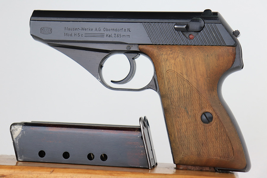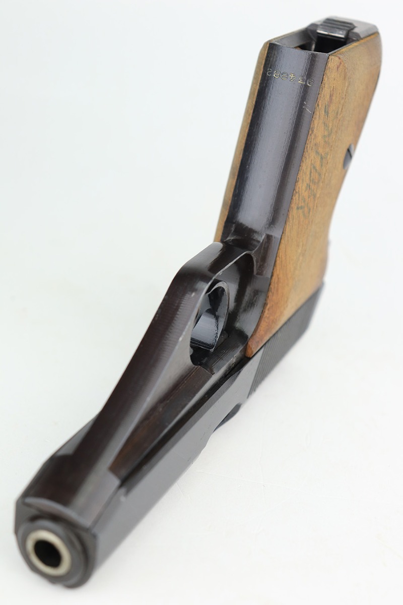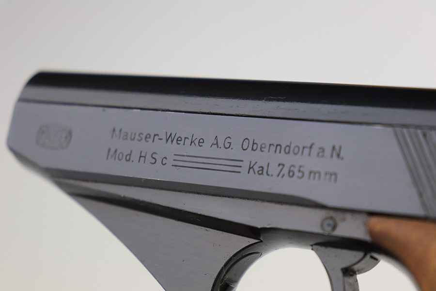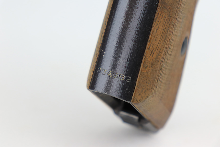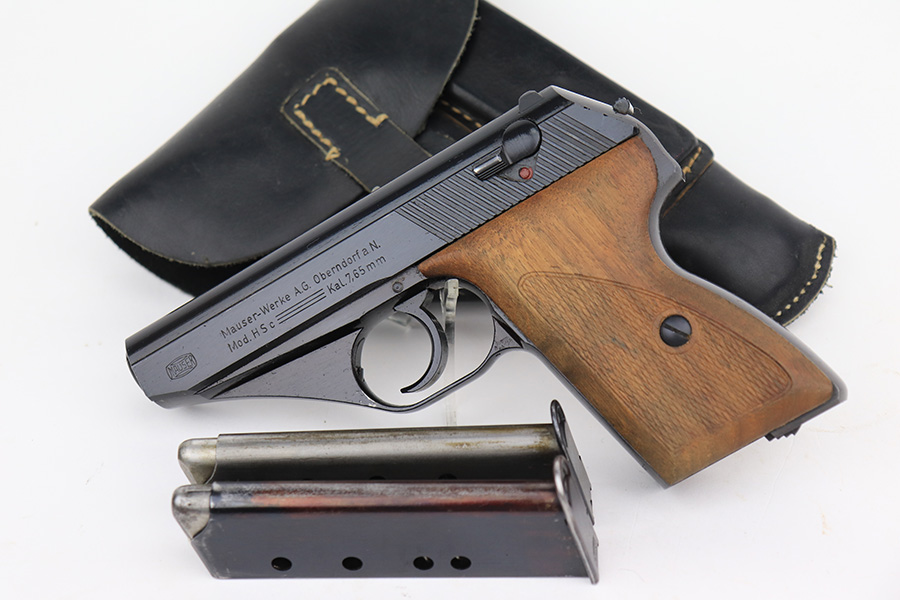 3/6/23 – This is a beautiful example of a Mauser HSC issued to the Nazi military in 1944. It is all matching and has the proper “Waffen 135” proof on the left side of the trigger guard. It comes as a rig with an un-marked black leather holster, one post-war magazine, and one late-war magazine. The gun itself is stunning, retaining essentially all of its original finish. There is just some very light freckling on the back strap. Fitted with a very nice set of period-correct wood grips. Mint bore.