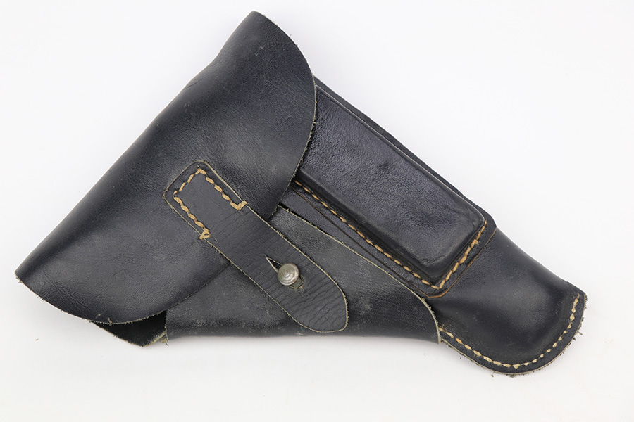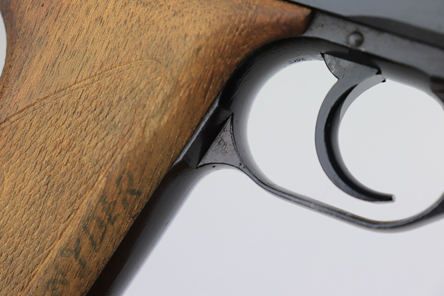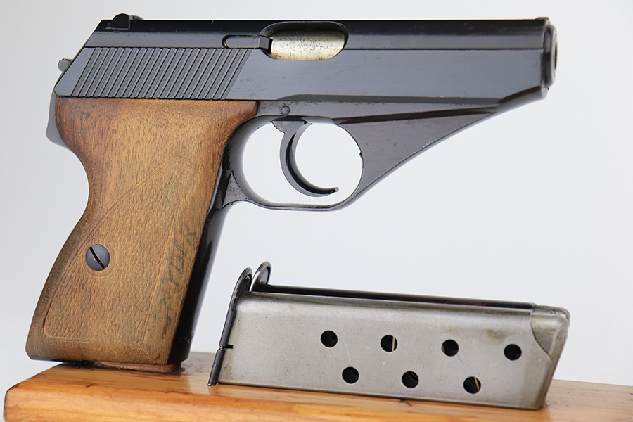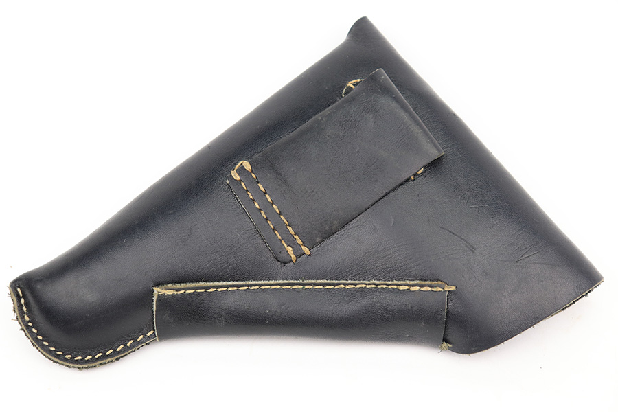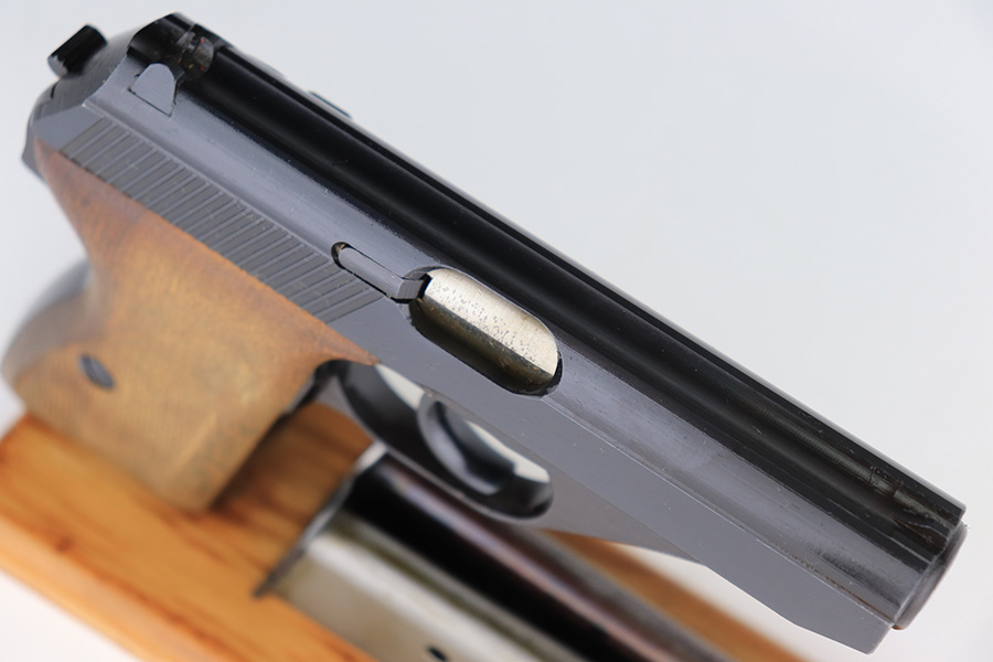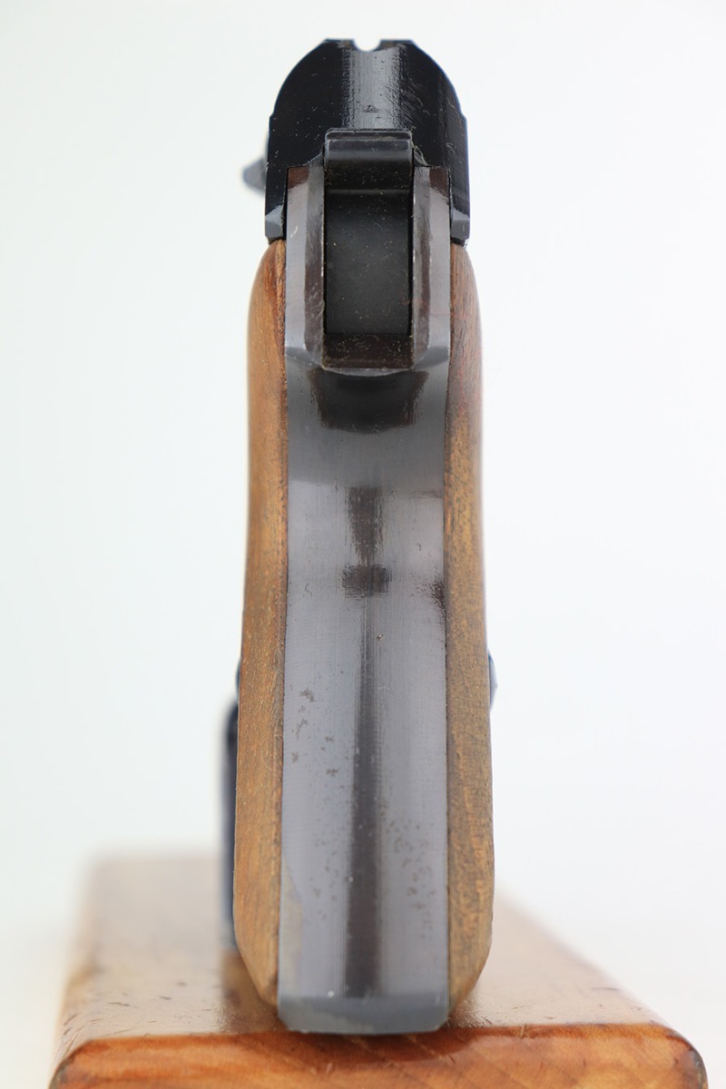 3/6/23 – This is a beautiful example of a Mauser HSC issued to the Nazi military in 1944. It is all matching and has the proper “Waffen 135” proof on the left side of the trigger guard. It comes as a rig with an un-marked black leather holster, one post-war magazine, and one late-war magazine. The gun itself is stunning, retaining essentially all of its original finish. There is just some very light freckling on the back strap. Fitted with a very nice set of period-correct wood grips. Mint bore.