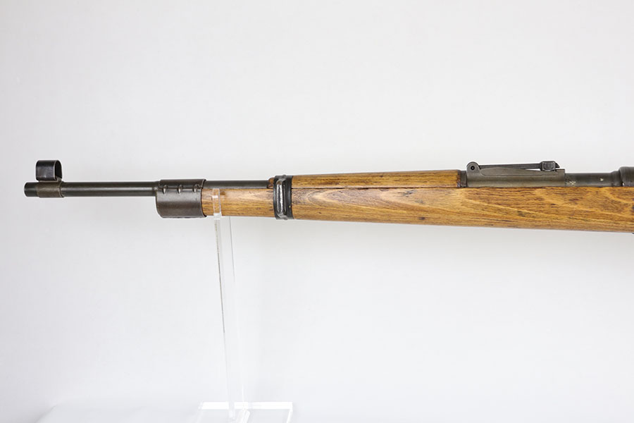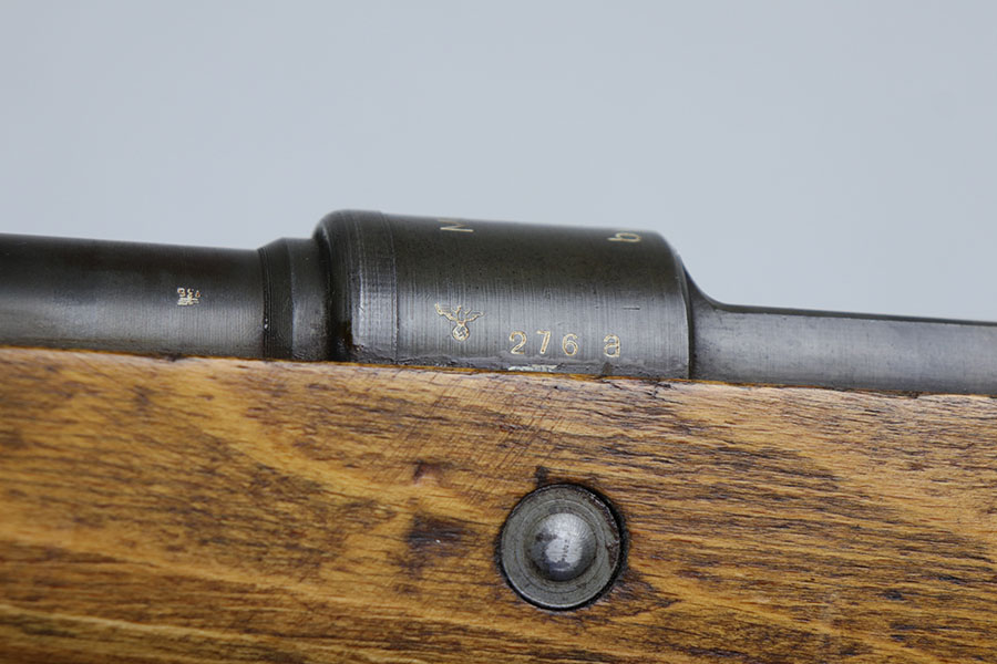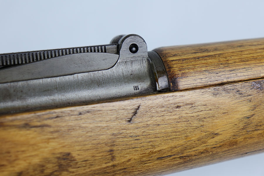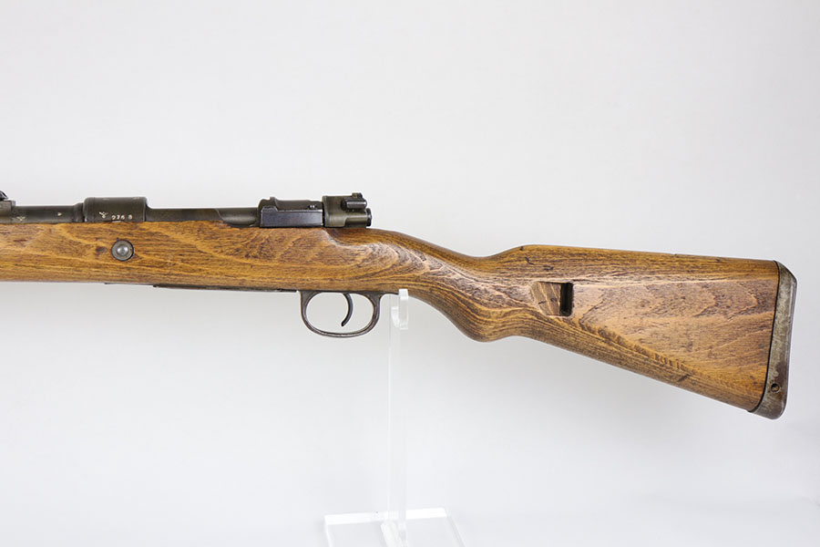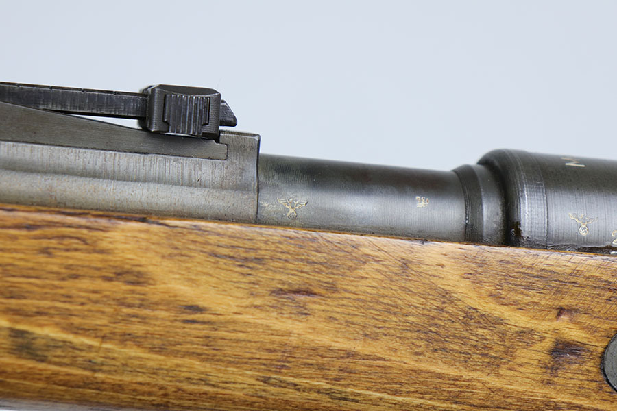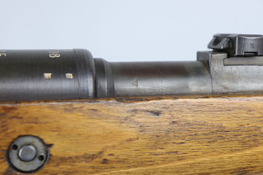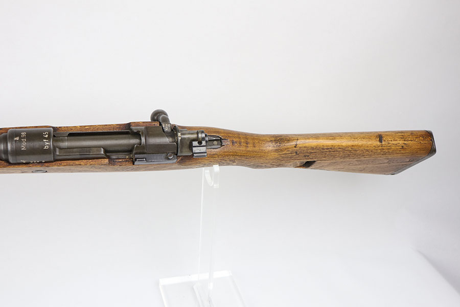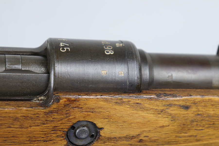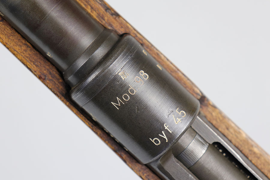 3/16/23 – This is a beautiful example of a Mauser produced K98 from the end of the war, with ‘byf 45’ marking on the receiver. The numbered parts are all matching, though many parts are correctly unnumbered given it’s a late war example. The finish on the receiver and barrel is excellent, with just a couple small spots of finish loss on the barrel (near the muzzle end). Trigger assembly has some patination and thinning of the finish. Stock has sharp waffenamts on right side and underside. No major cracks or chips. Minty bore.