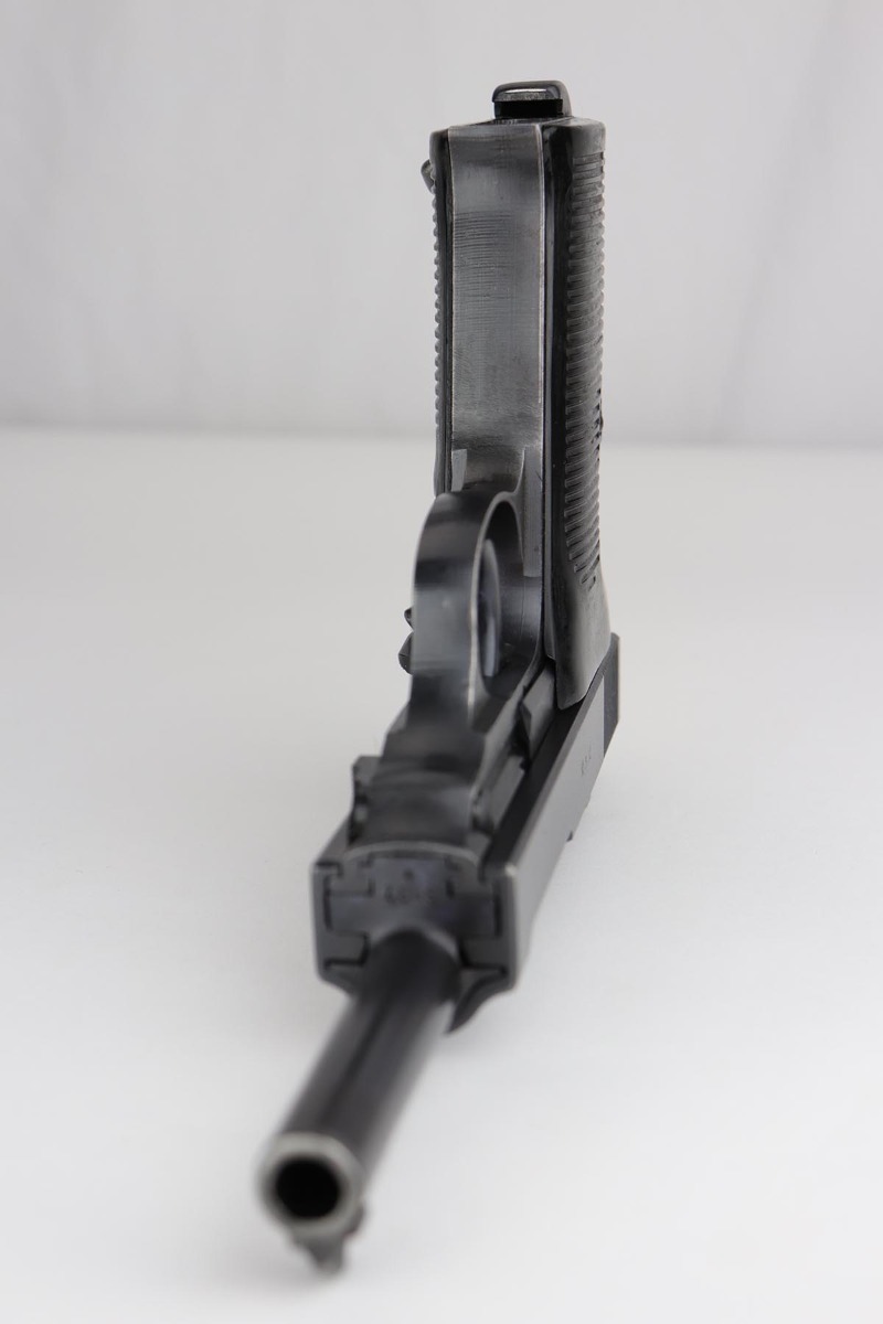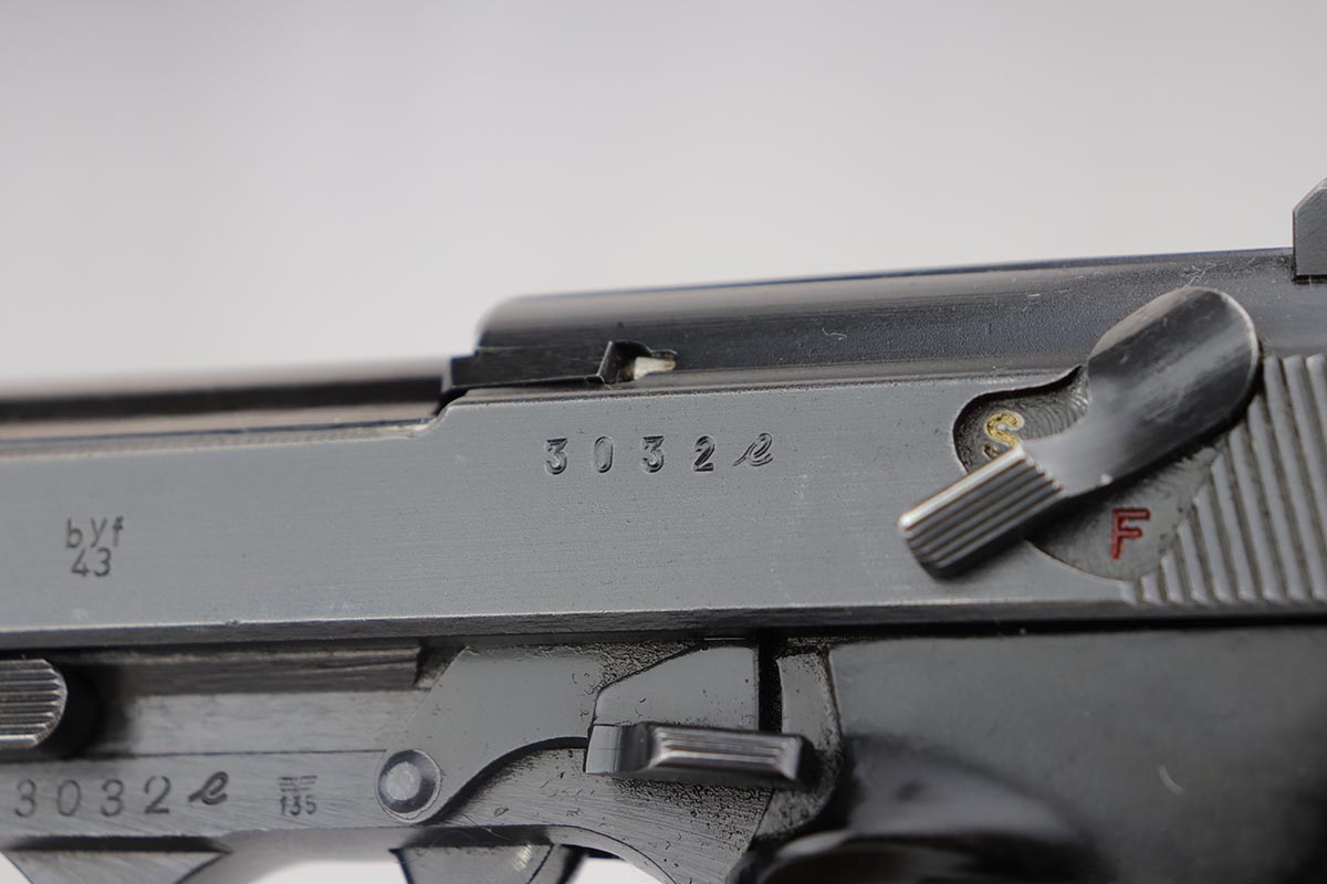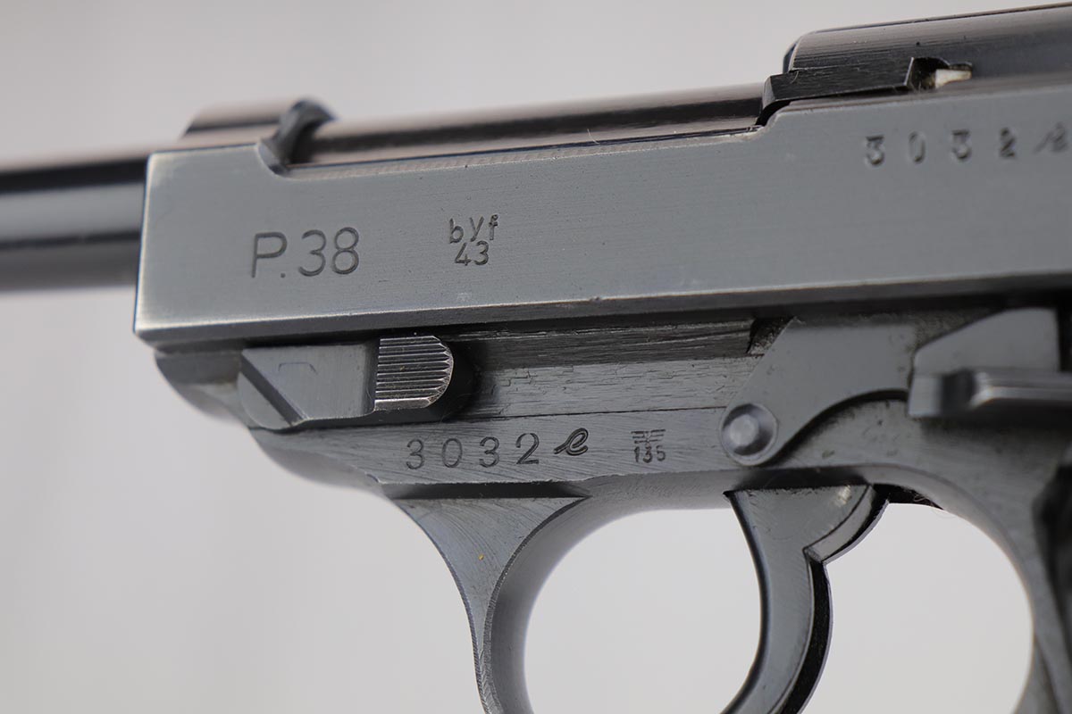 8/21/19 – This is a beautiful Mauser P.38 from May of 1943, with 97-98% of the original dust blue finish remaining. There is only very minor high edge wear, and a little bit of finish loss on the top plate. Good mechanics, including de-cocker. Minty bore and excellent grips.